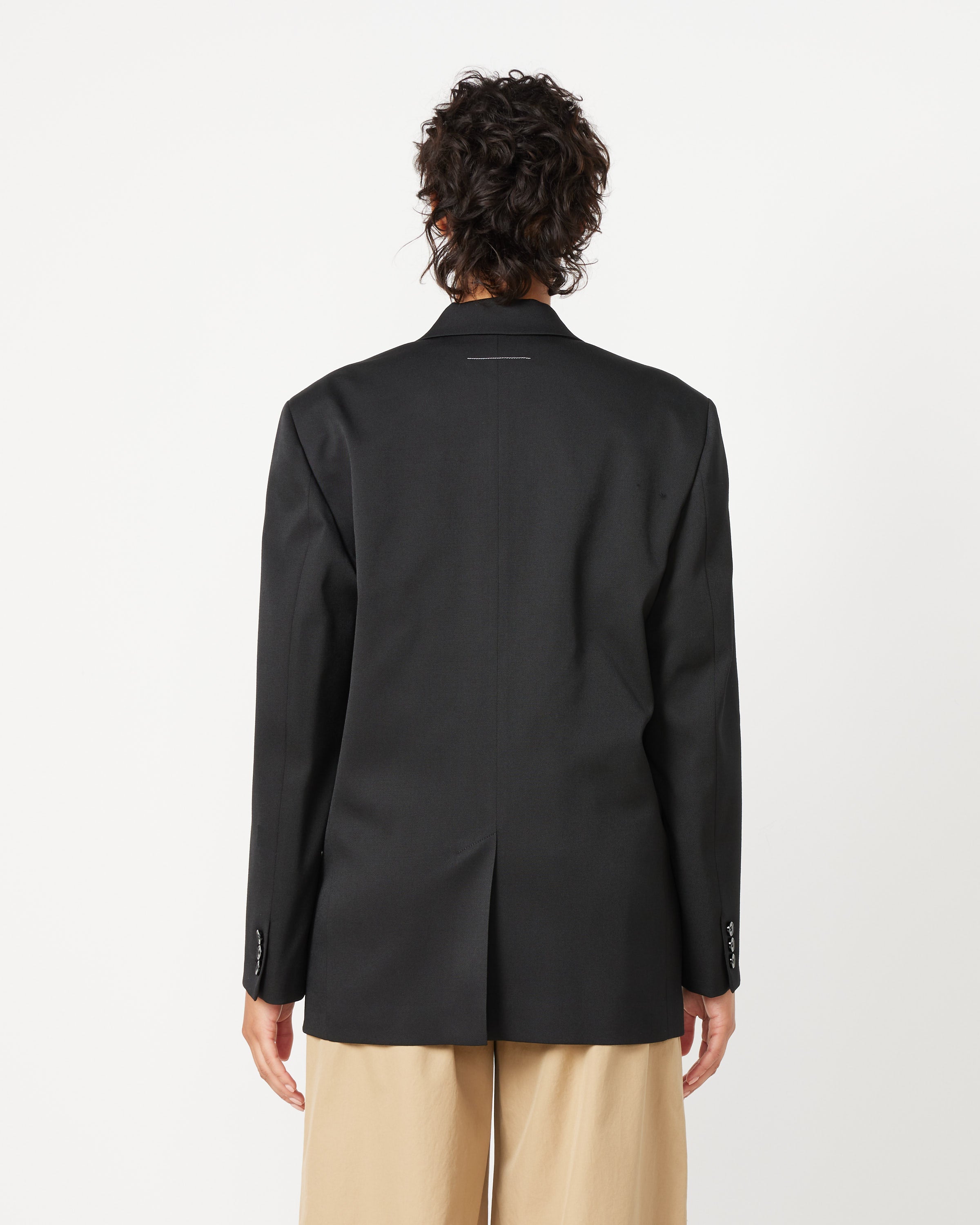 A relaxed jacket with an adjustable silhouette cut from a techno-stretch fabric, MM6's S52BN0112 Suit Jacke features a notched collar, a welt chest pocket, flapped lower pockets, the brand's signature white stitch detail at the back, and a single-breasted front closure with an extra button that can be fastened for a slimmer, misaligned silhouette.