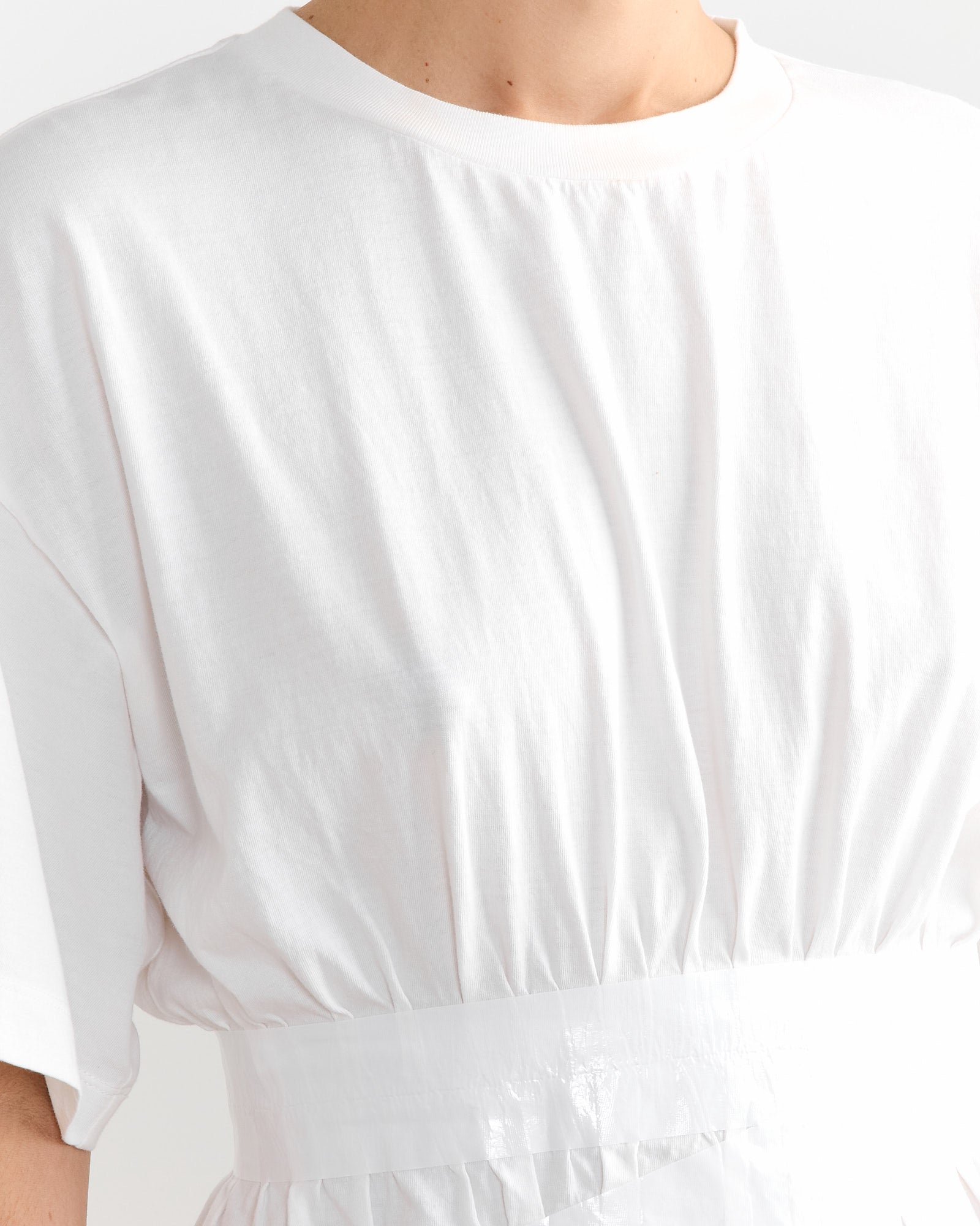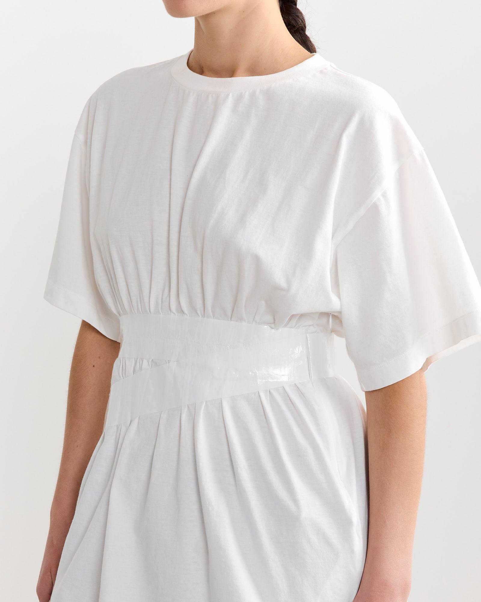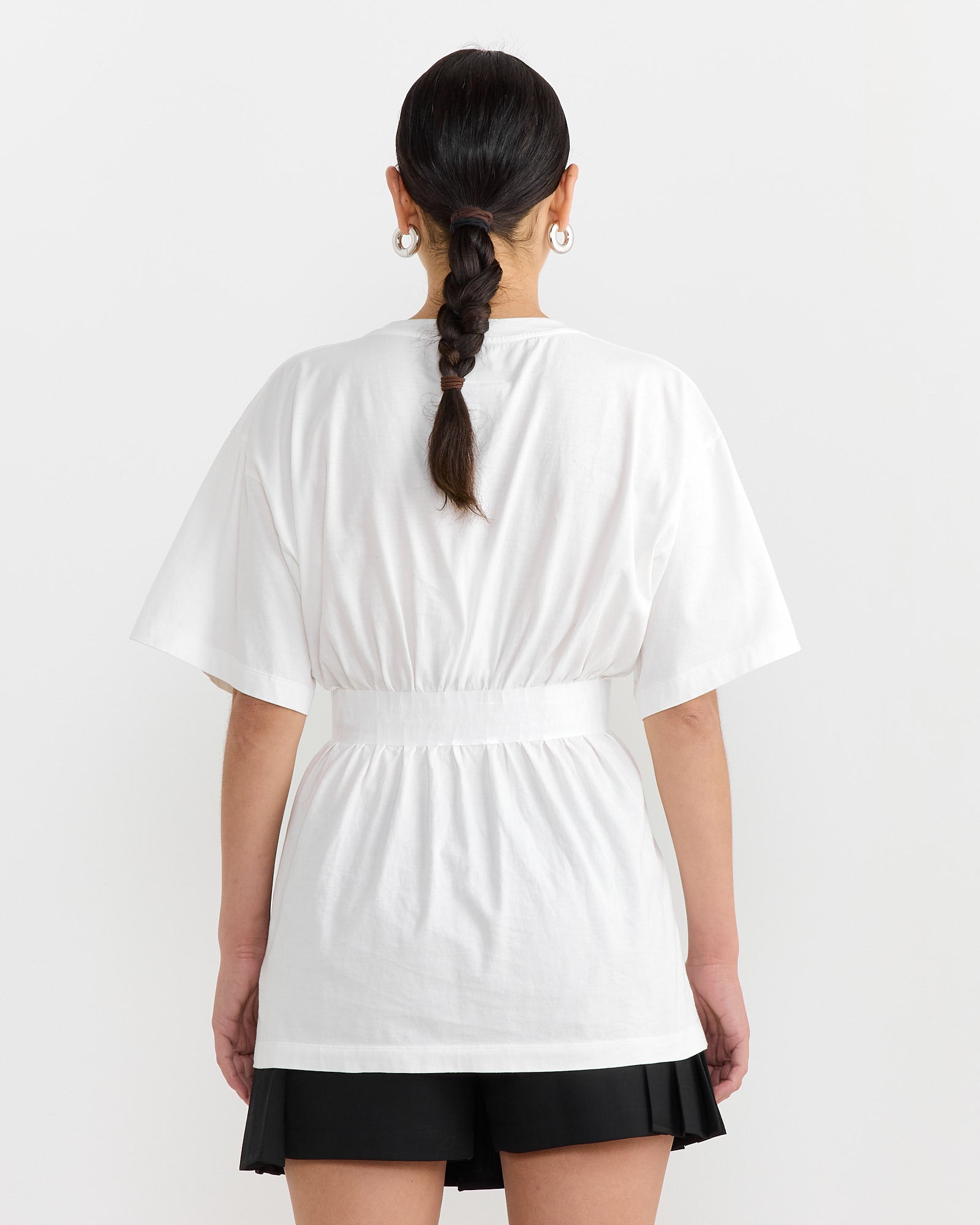 The MM6 Maison Margiela T-Shirt with Draping in White is a standout piece that blends minimalist elegance with avant-garde design. Crafted from premium cotton, this lightweight and breathable T-shirt features short sleeves and a classic round neckline. The draped waist and shimmering wide waistband add a sophisticated, fashion-forward touch to the silhouette.