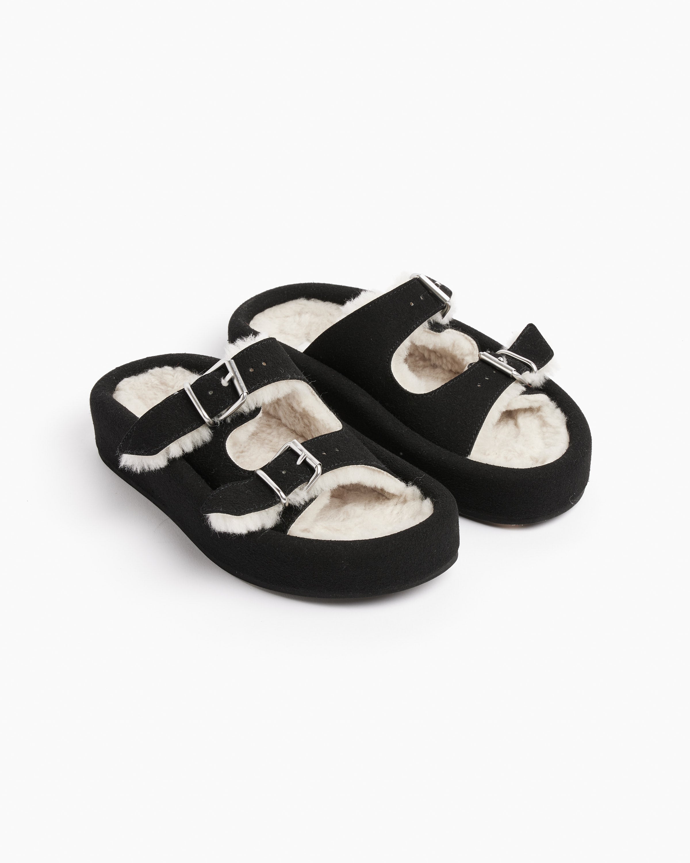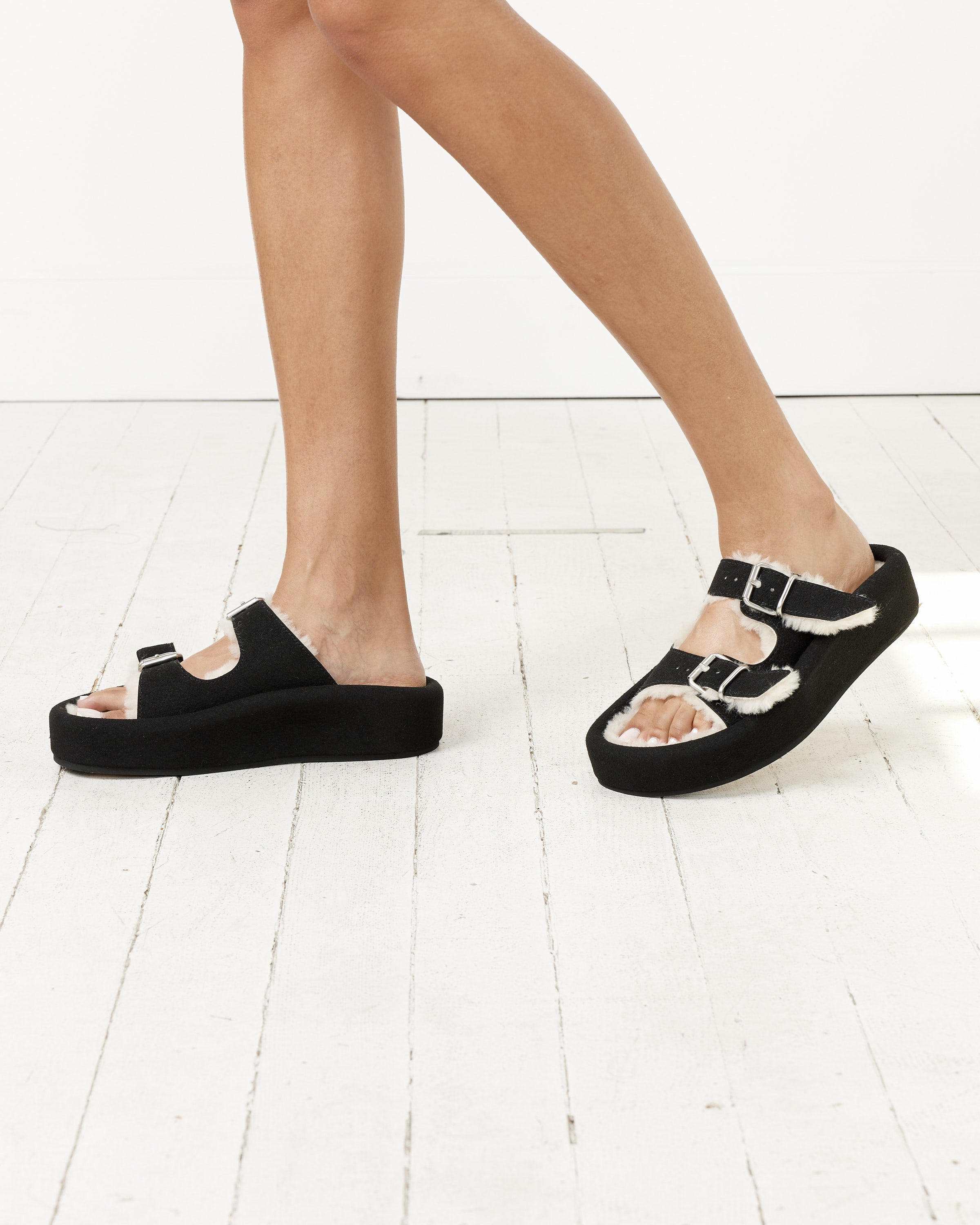 An update to one of MM6's most popular styles, the open-toe Sandal features a sunken footbed with a 1.75" platform, a rubber outsole for grip, a leather upper with pin-buckle adjustable straps, and is lined with a soft and plush faux fur.