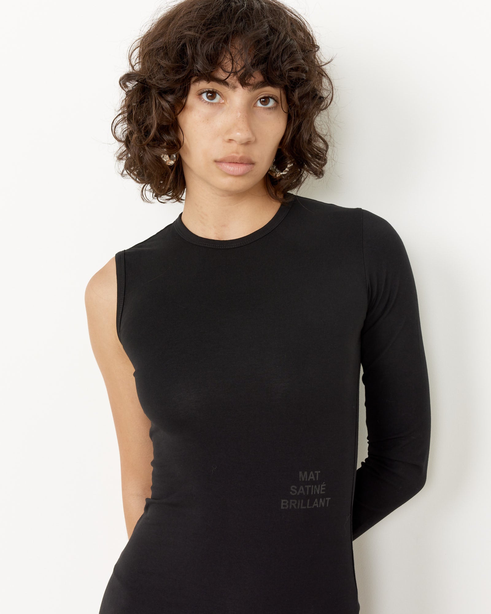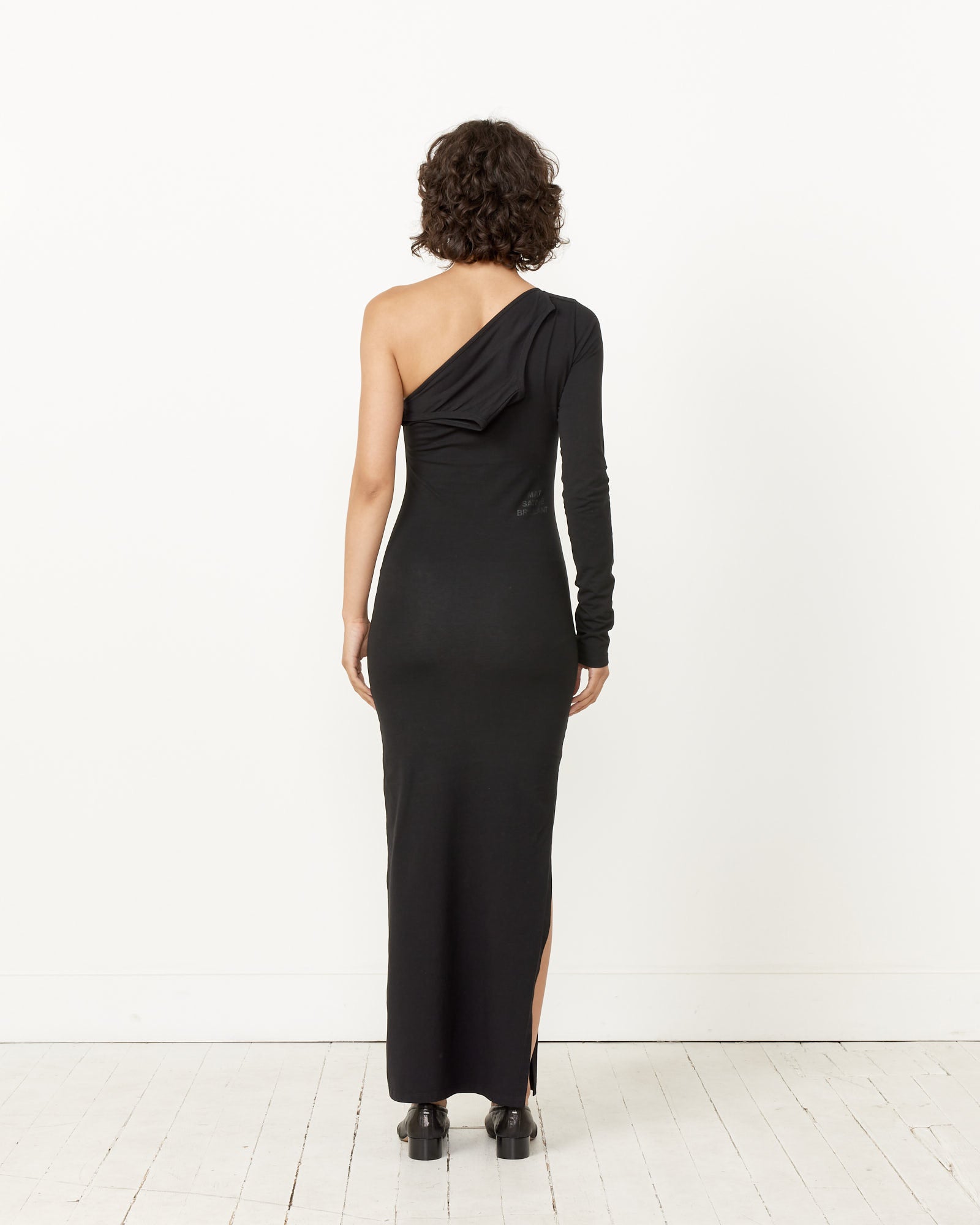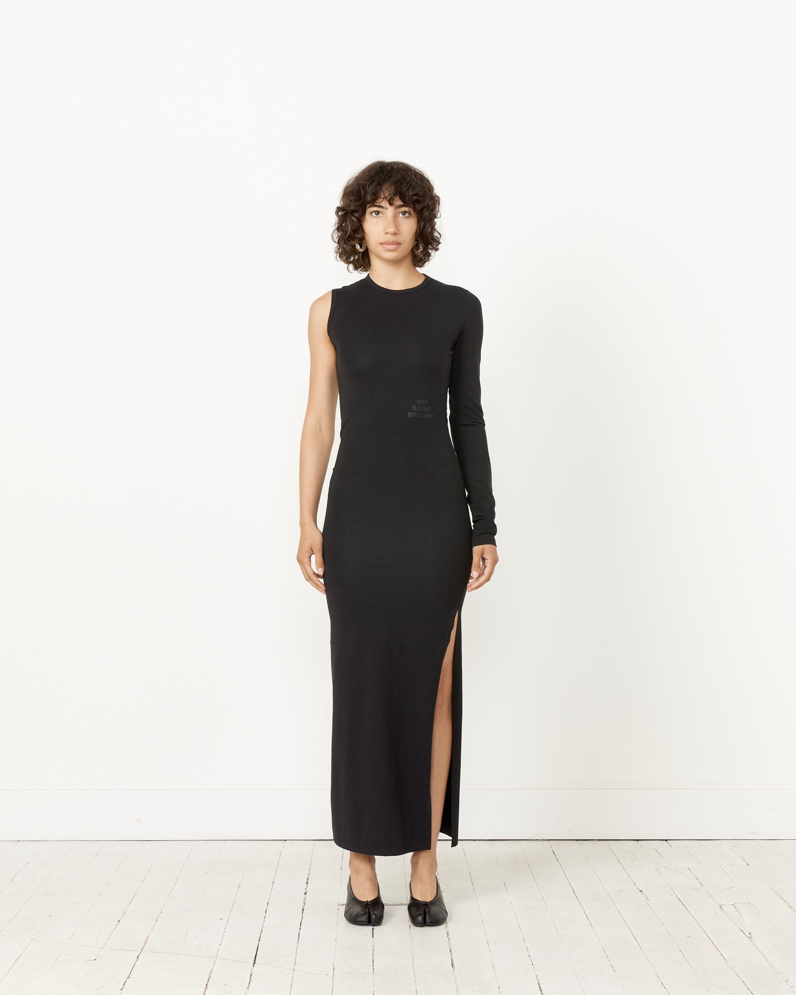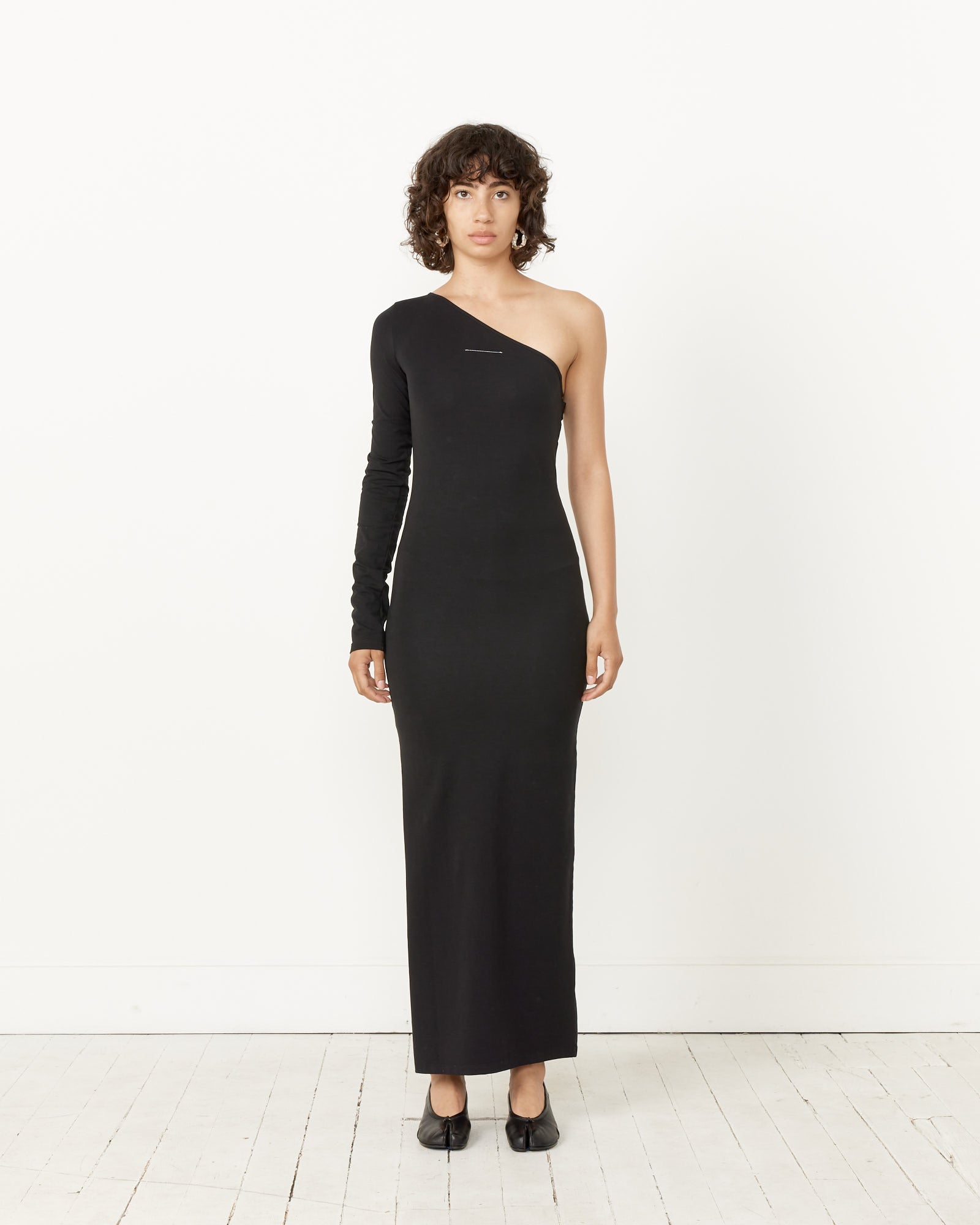 A versatile style that can be worn a variety of ways, MM6's Midi Dress in Black features a stretchy cotton-blend fabric cut in a fitted silhouette with a single sleeve that can be worn at either arm, a deep side slit, and both a round neckline and a slit for wearing as an asymmetrical one-shoulder neckline.