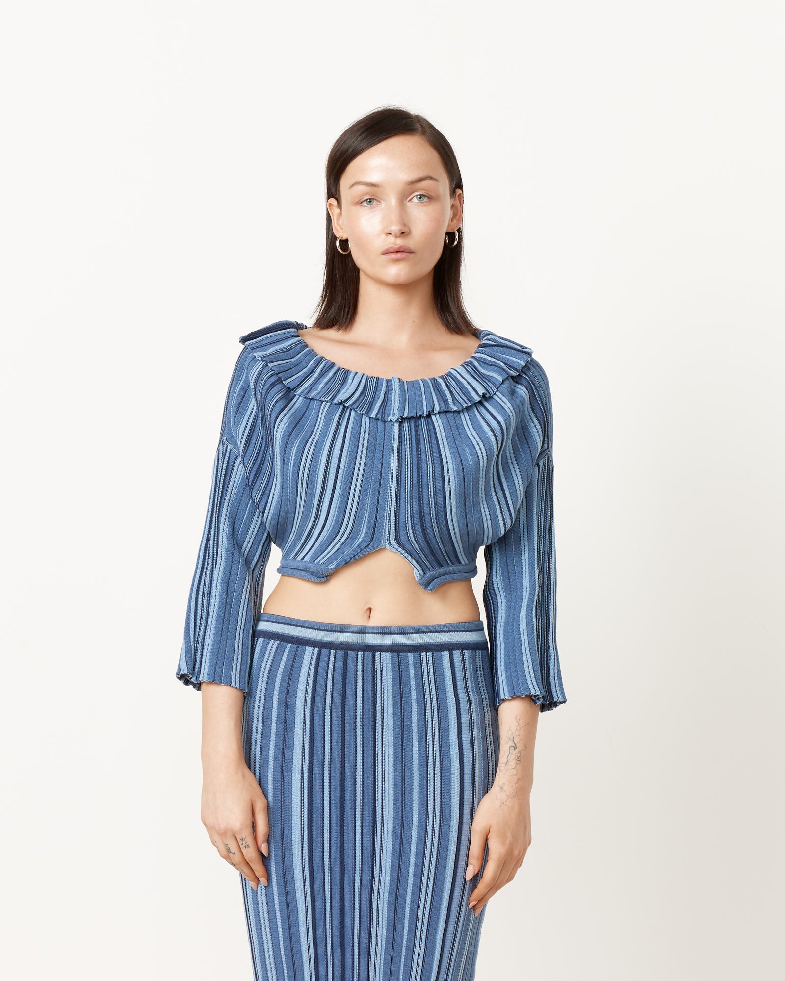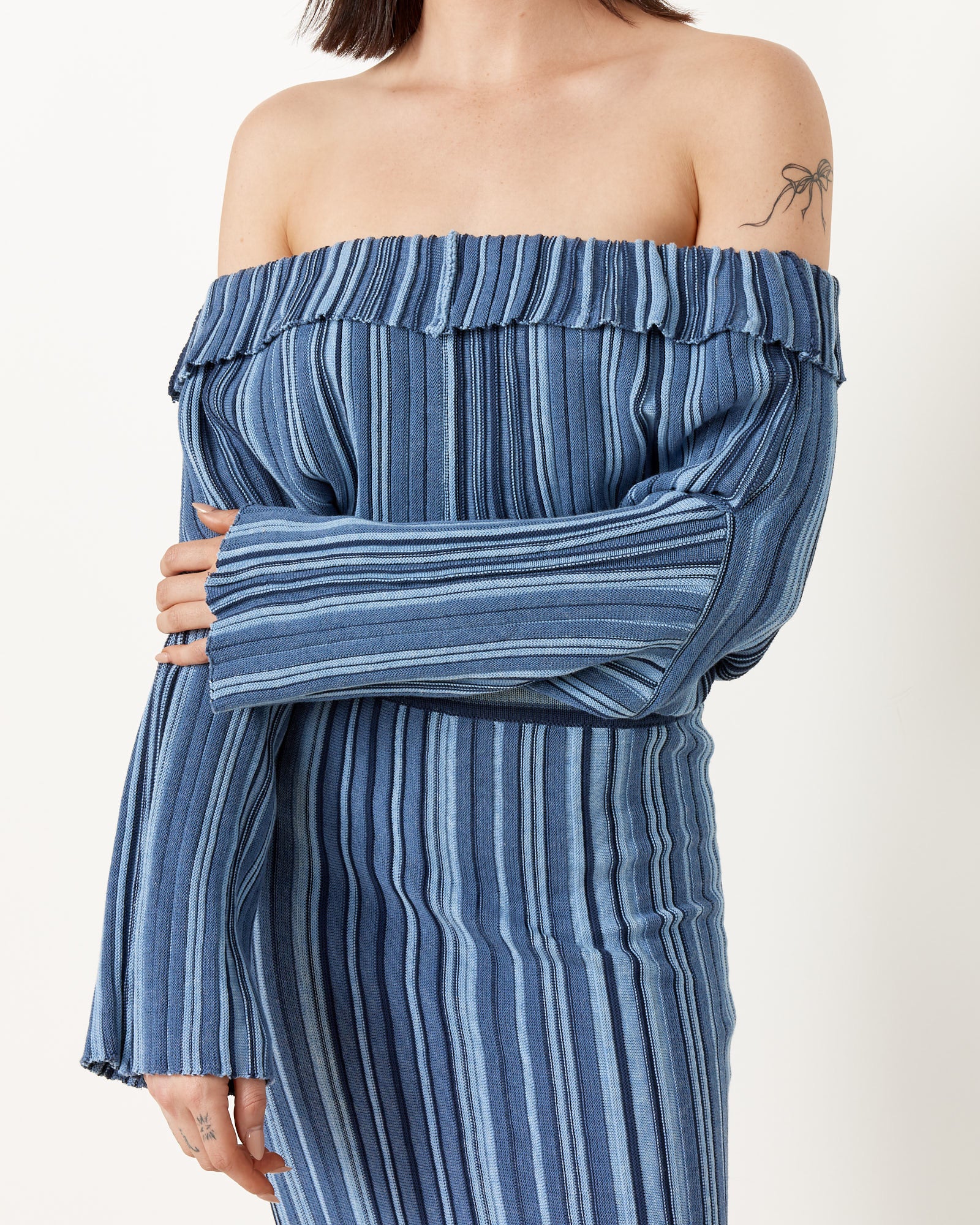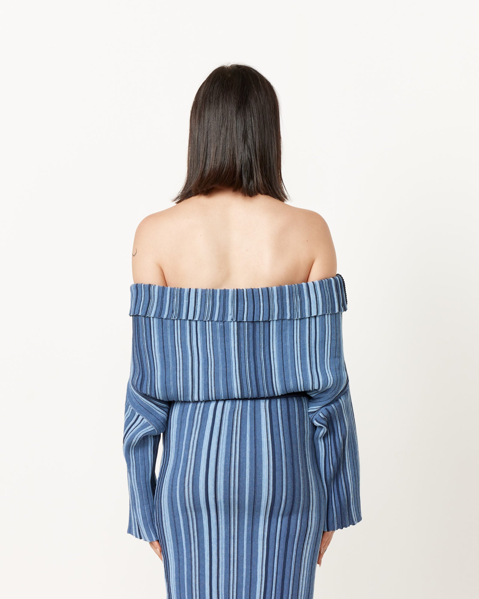 Mundaka's Morena Off Shoulder Top is knit with a rib-like structure in a trio of blue tones, and features dropped shoulders and a cropped hemline with a center-front notch.