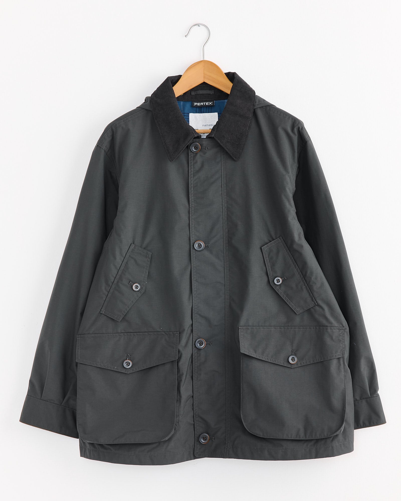 The Nanamica 2L PERTEX Unlimited Field Jacket in Dark Olive is a highly functional outerwear piece inspired by classic British hunting jackets. It features a 2-layer PERTEX® Unlimited fabric, which provides excellent water resistance and breathability, ensuring comfort in various weather conditions. The jacket has a matte nylon taffeta finish that mimics cotton, adding a unique texture, and is lined with a cotton and CoolMax blend for added breathability and comfort. It also comes with a removable hood, windproof throat tab, and multiple secure pockets, making it a versatile and practical choice for outdoor activities.