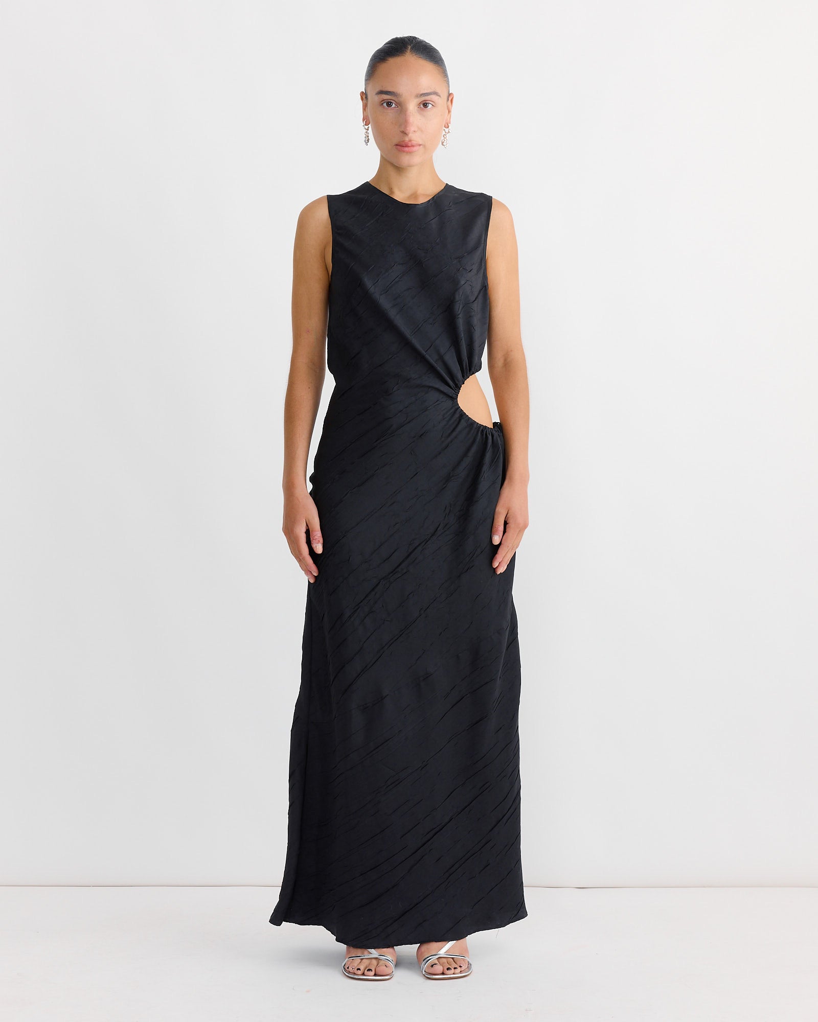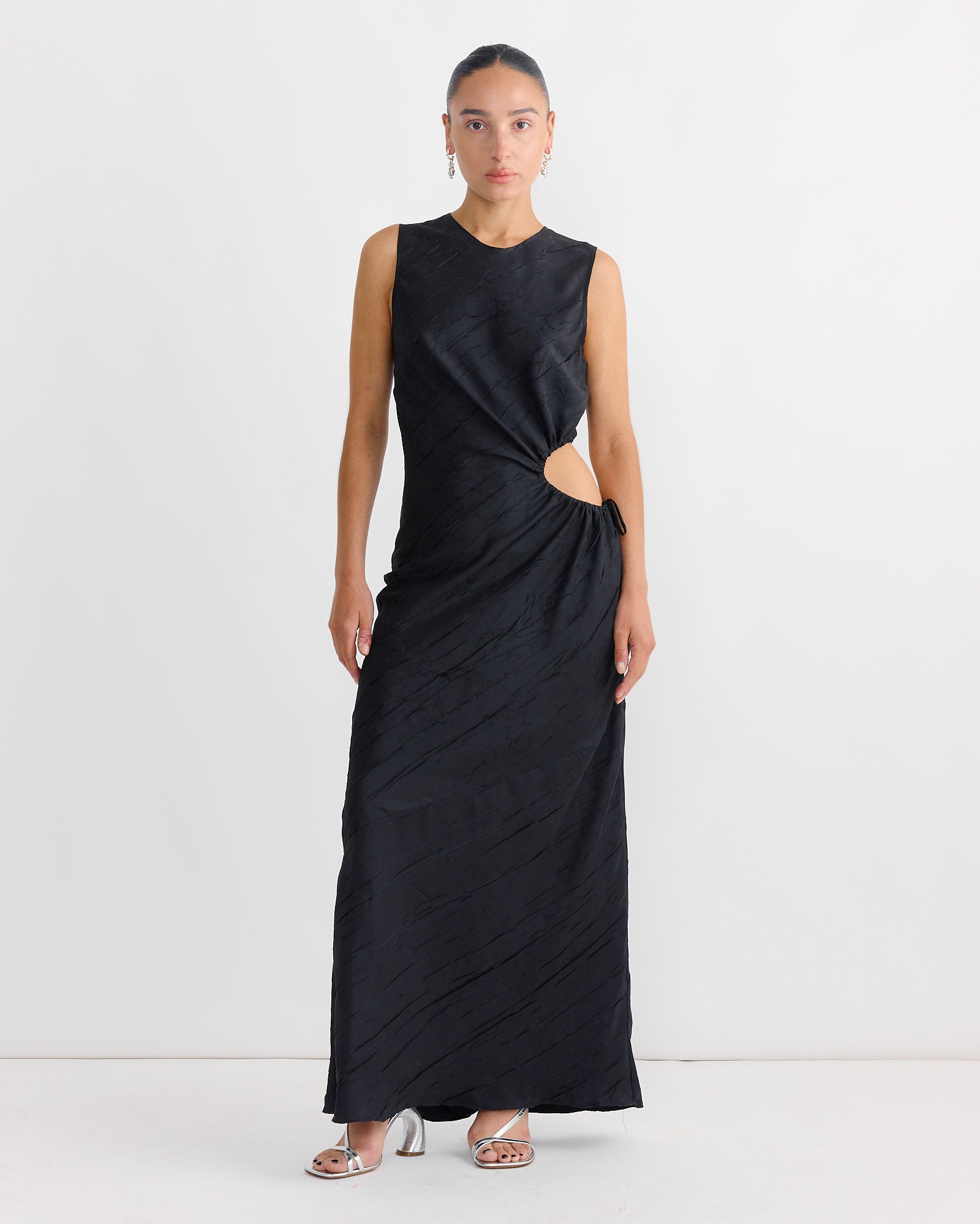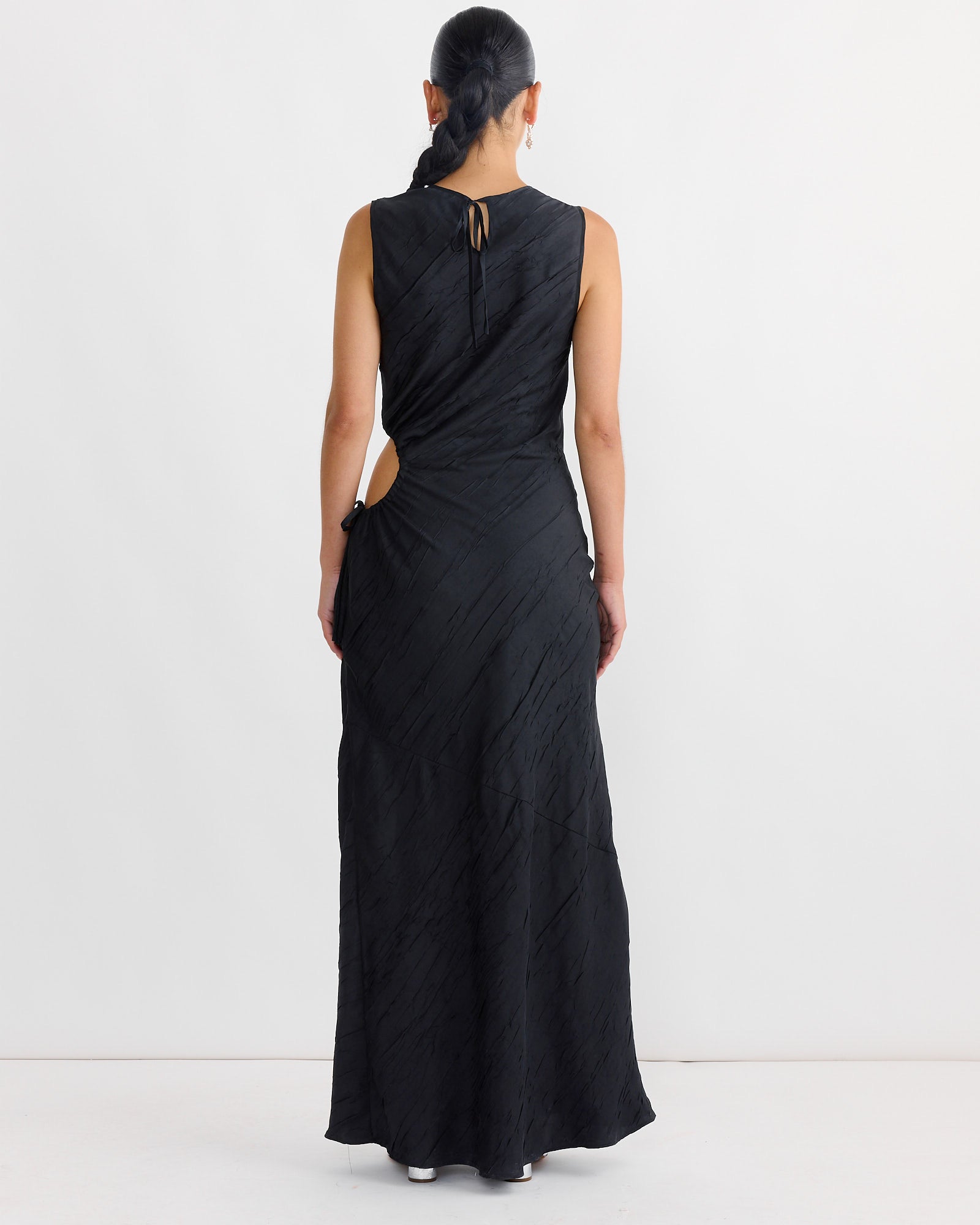 The Gathered Cutout Maxi Dress in Black by NOMIA is crafted from creased polyester with a textural, slinky finish. Designed with a bias cut for a flattering drape, it features an adjustable cutout at the left waist and a keyhole opening at the back neck with a delicate tie.