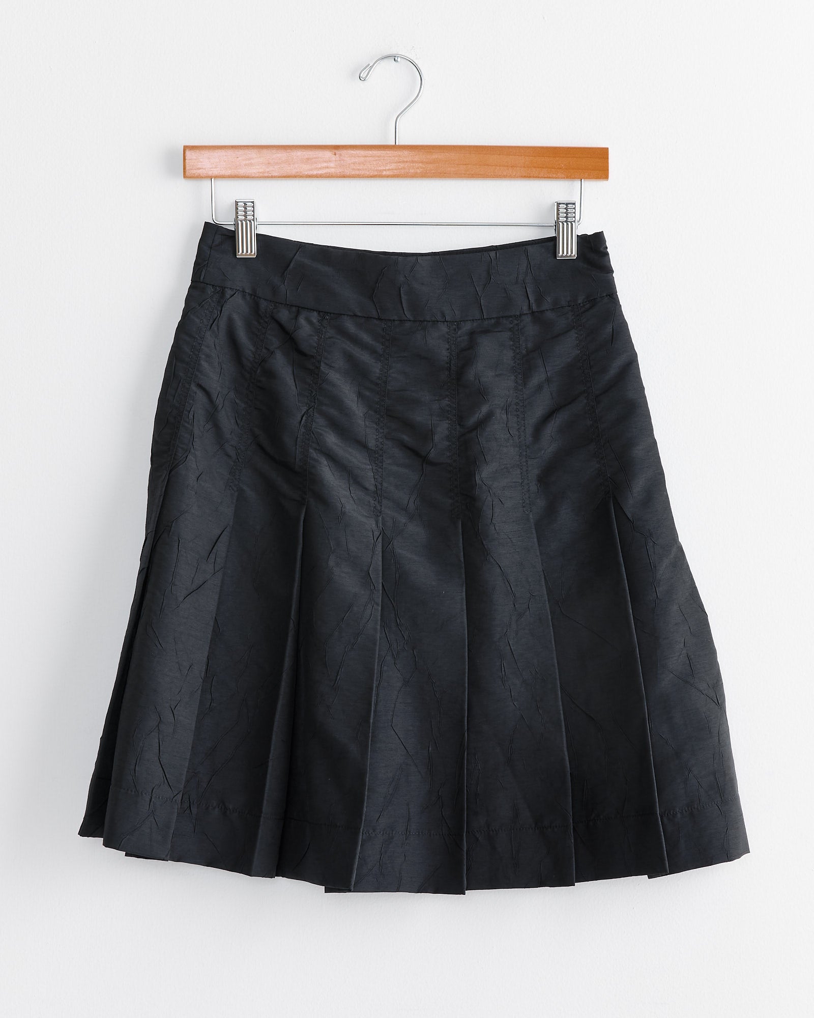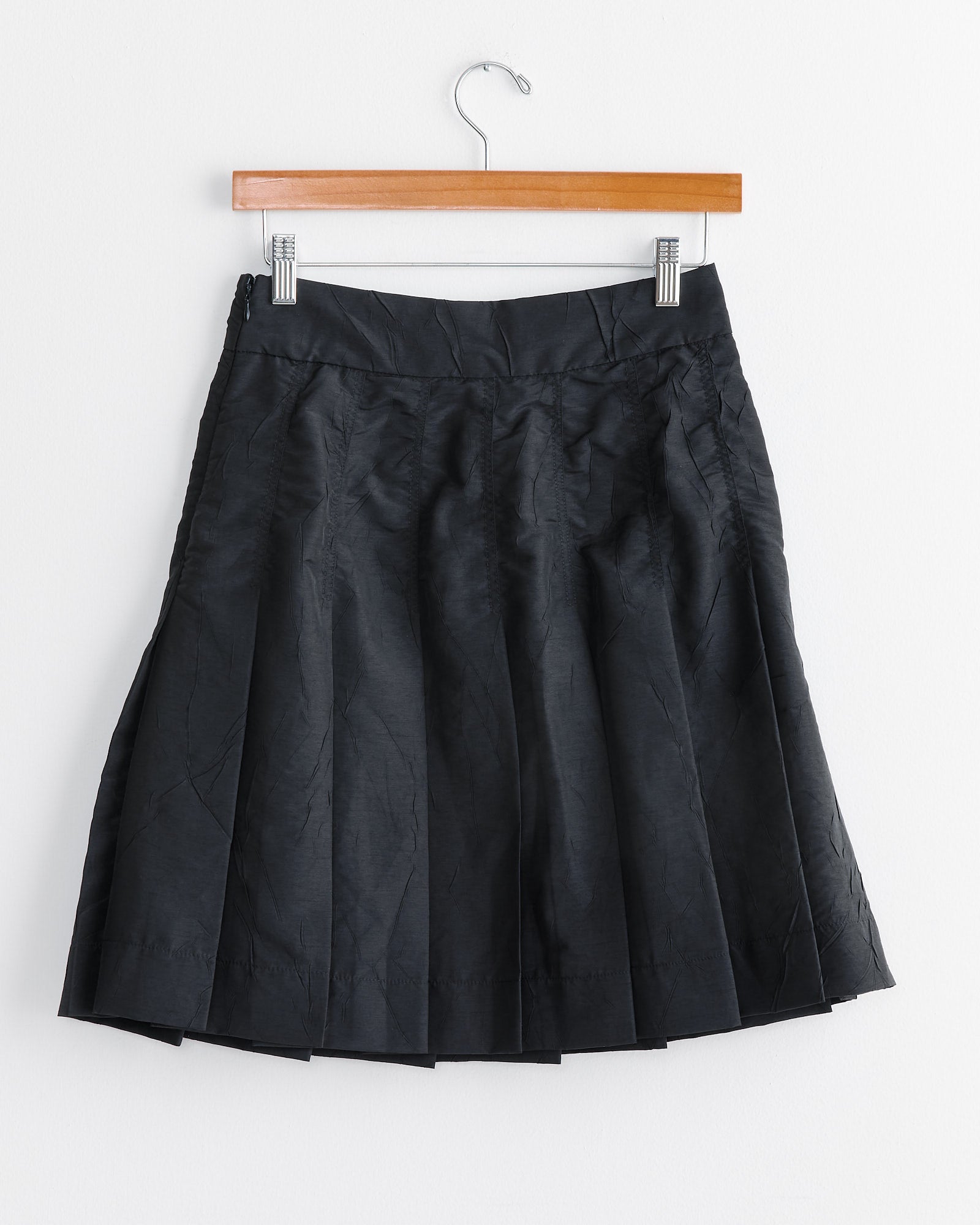 The Wide Pleat Skirt by NOMIA in Black is a knee-length style crafted from crushed technical taffeta with a structured drape. Wide knife pleats are topstitched from the waist to the hip, creating clean lines and subtle volume. It features a 2" self waistband that sits at the natural waist, with a hidden side zipper and hook-and-eye closure.
