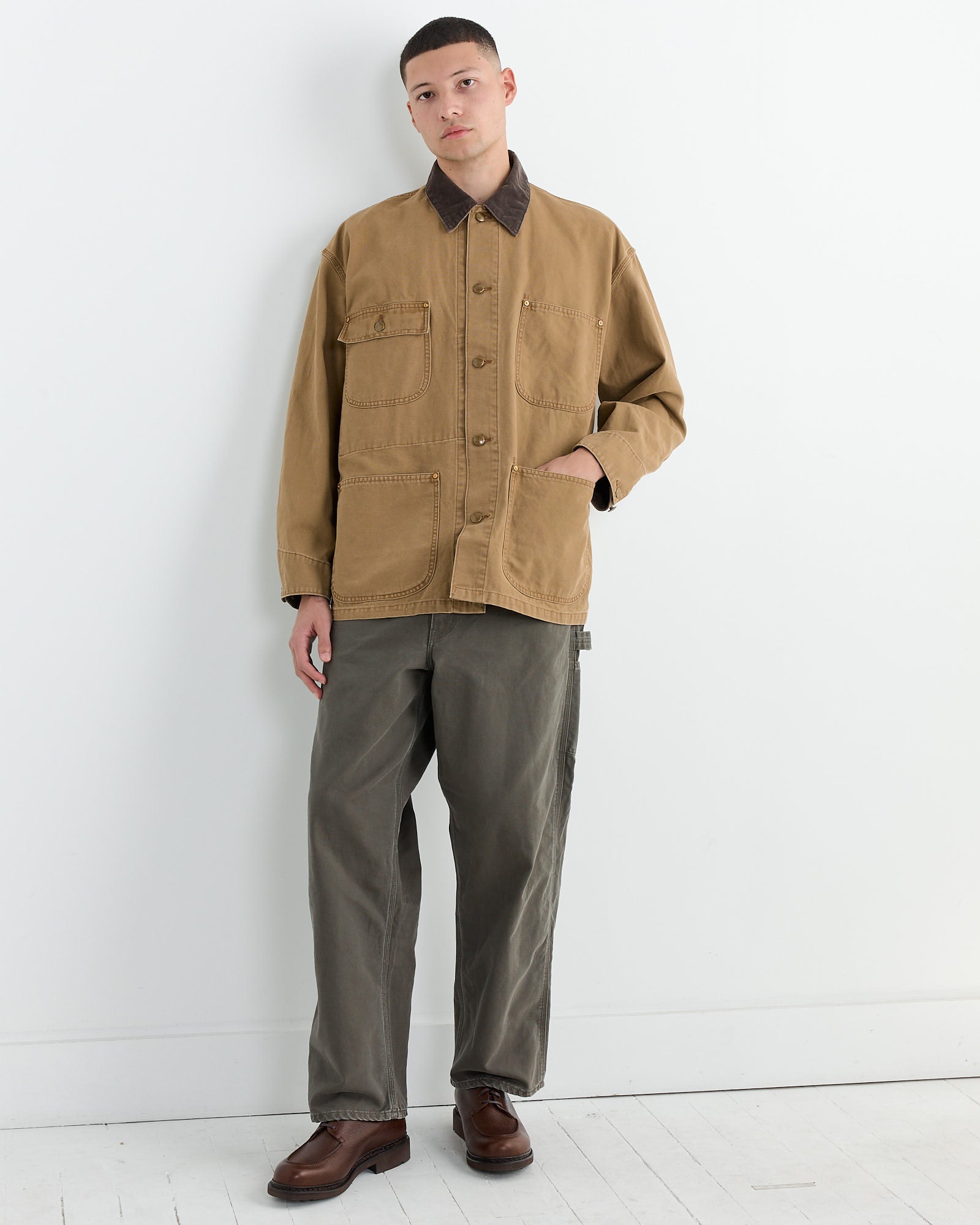 The orSlow Relax Fit Coverall offers a relaxed, 90's-inspired fit, perfect for layering with thicker knits or garments underneath. Made from 100% cotton 10/8 Oxford fabric, it features a durable and authentic look with post-processing that gives it a used finish. The coverall also includes corduroy accents made from a cotton-polyester blend, adding texture and style.