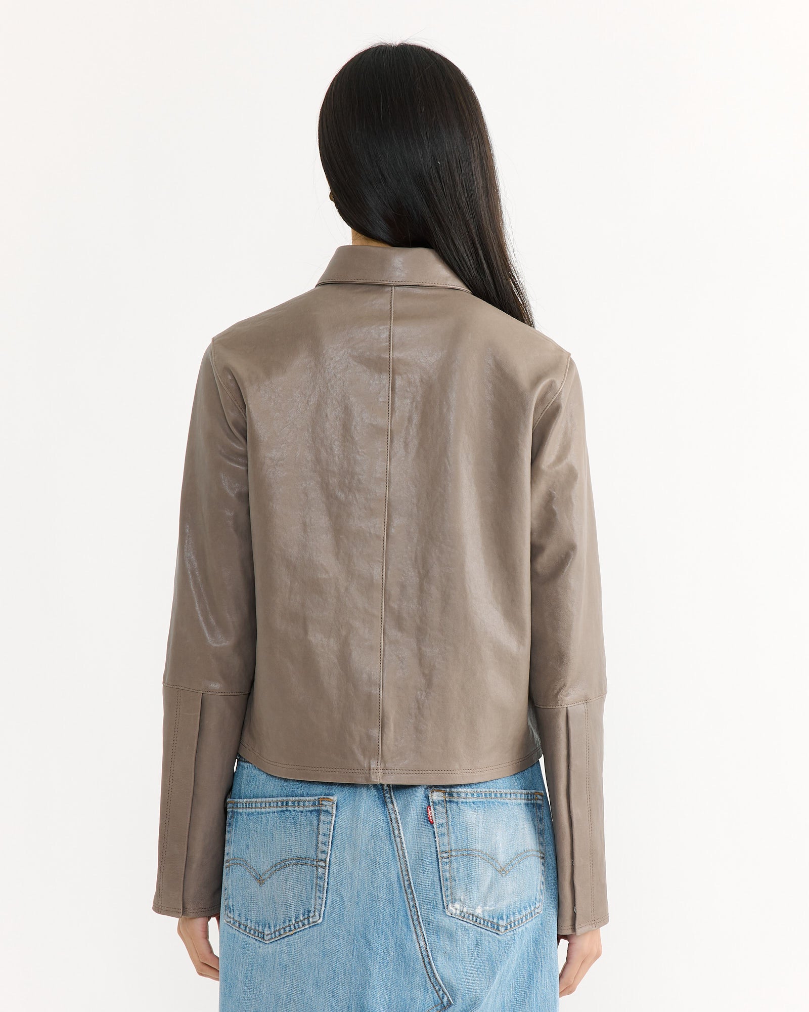 The 70s Auto Shirt by Our Legacy in Grey Velvet is a structured leather shirt with a regular, boxy fit. Crafted from Italian sheep leather, it features a covered placket, hidden snap button closure, and deep cuffs with concealed snaps. French seams and darting enhance its clean, tailored shape.