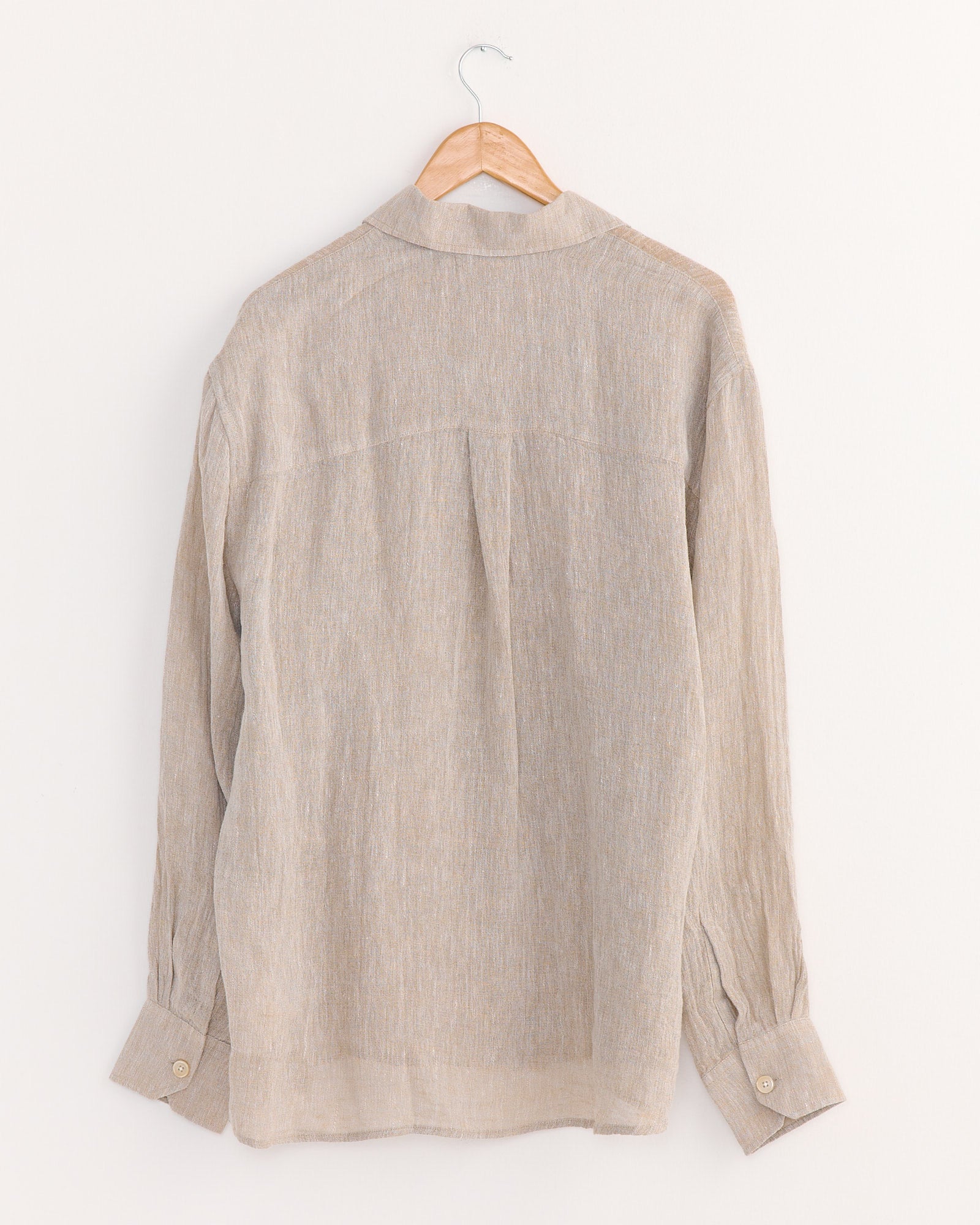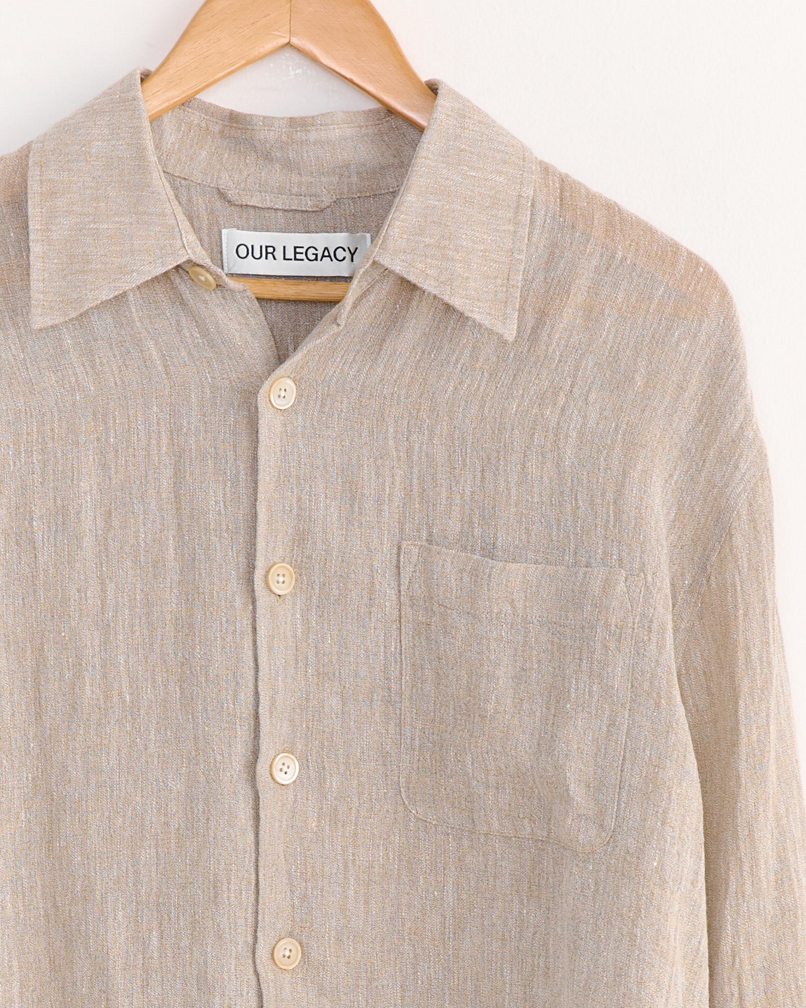 Our Legacy's Above Shirt in Pollen Dust offers a slightly oversized fit with a single chest pocket, mother of pearl buttons, and mitered cuffs. The lightweight, textured Italian fabric provides a unique appearance due to its special treatment process.