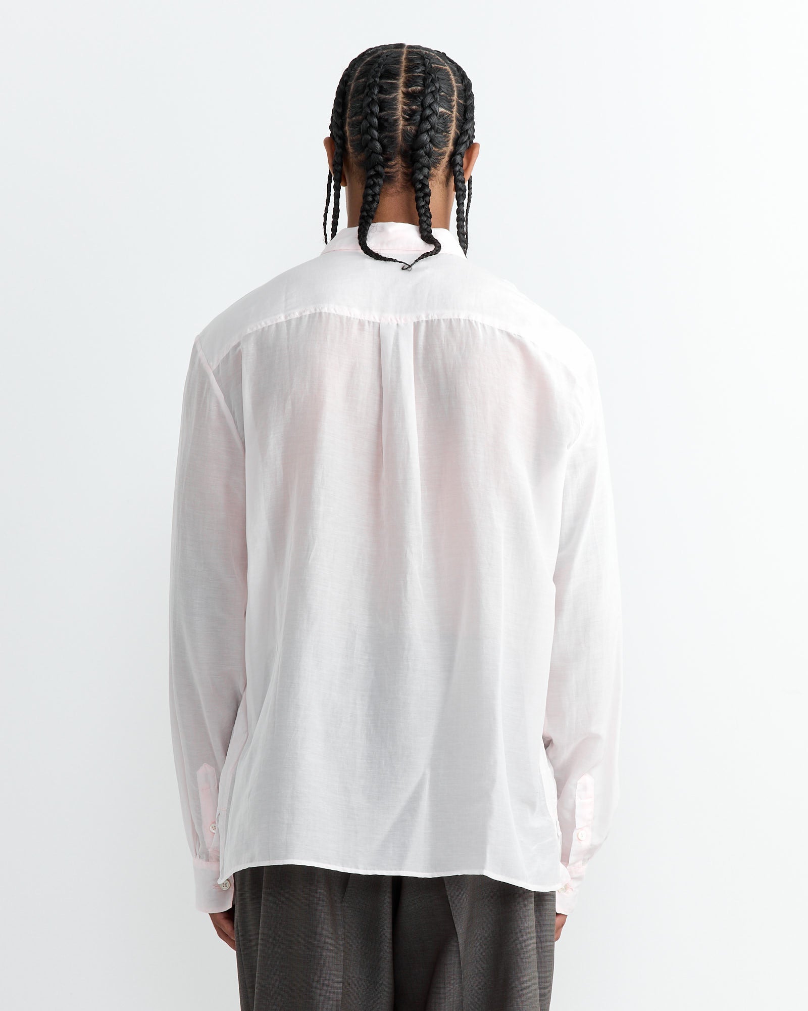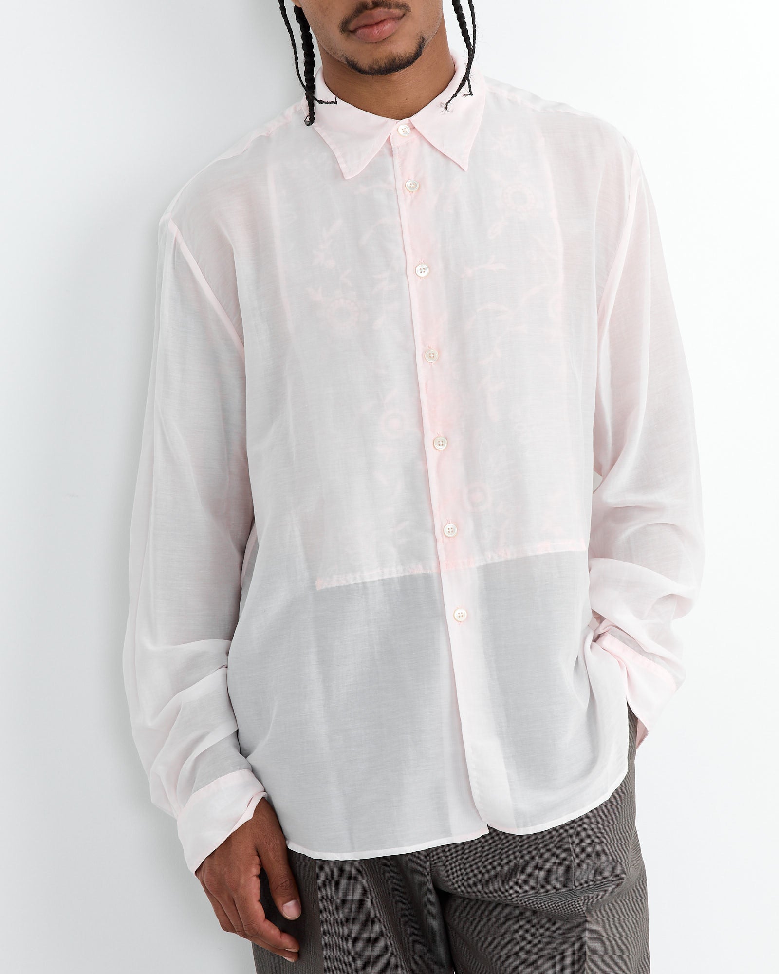 The Our Legacy Adorn Shirt in Ballet Pink offers a relaxed fit with a floral lace-embroidered front bib placket, mitered cuffs, split side seams, and mother-of-pearl buttons. Crafted from a delicate Italian cotton-silk blend, this semi-sheer shirt combines comfort with elegance.