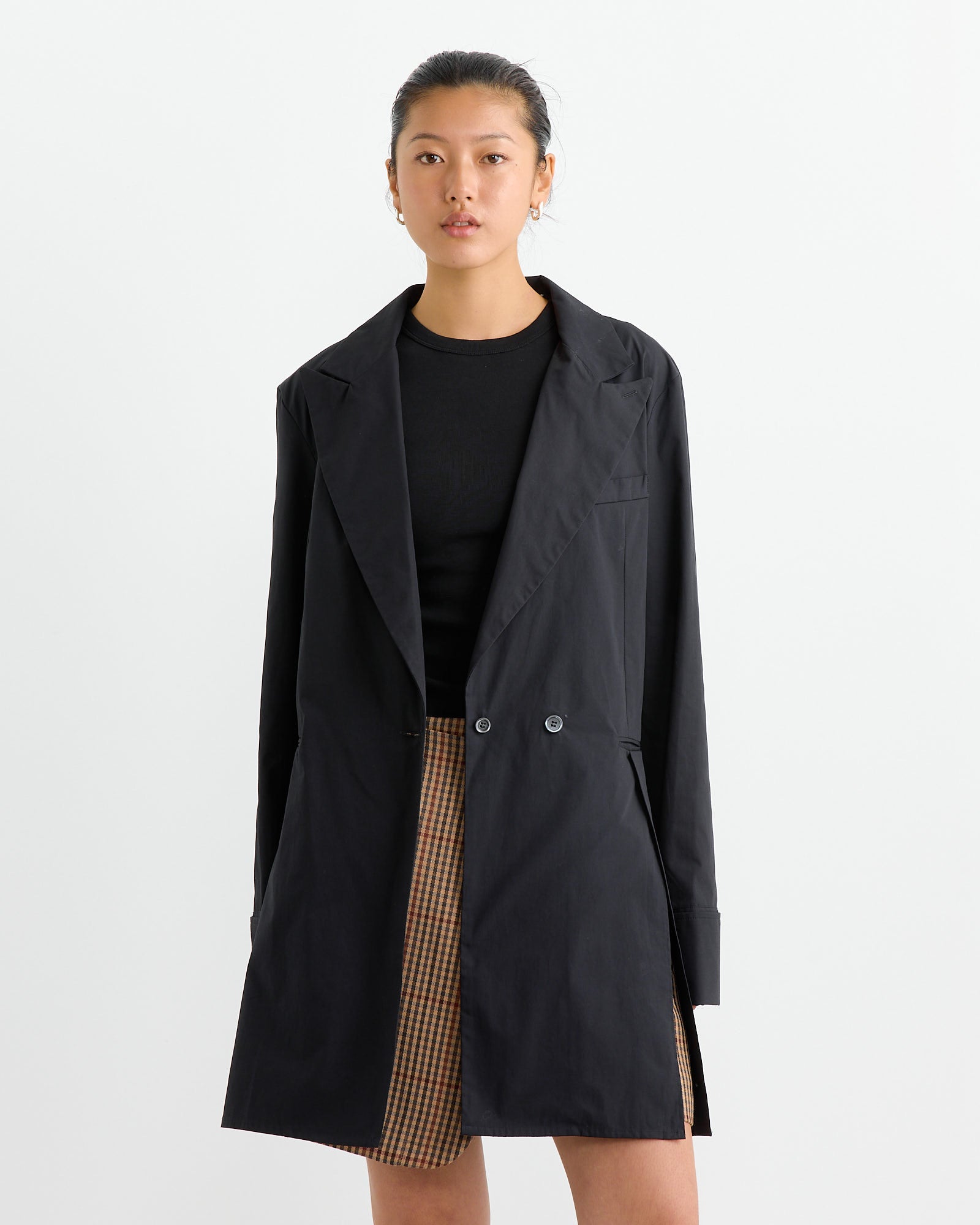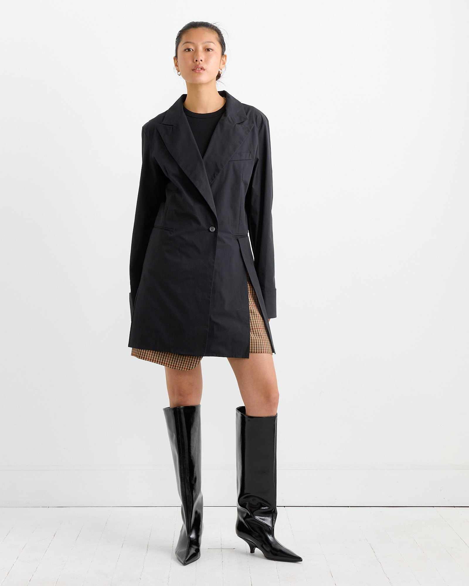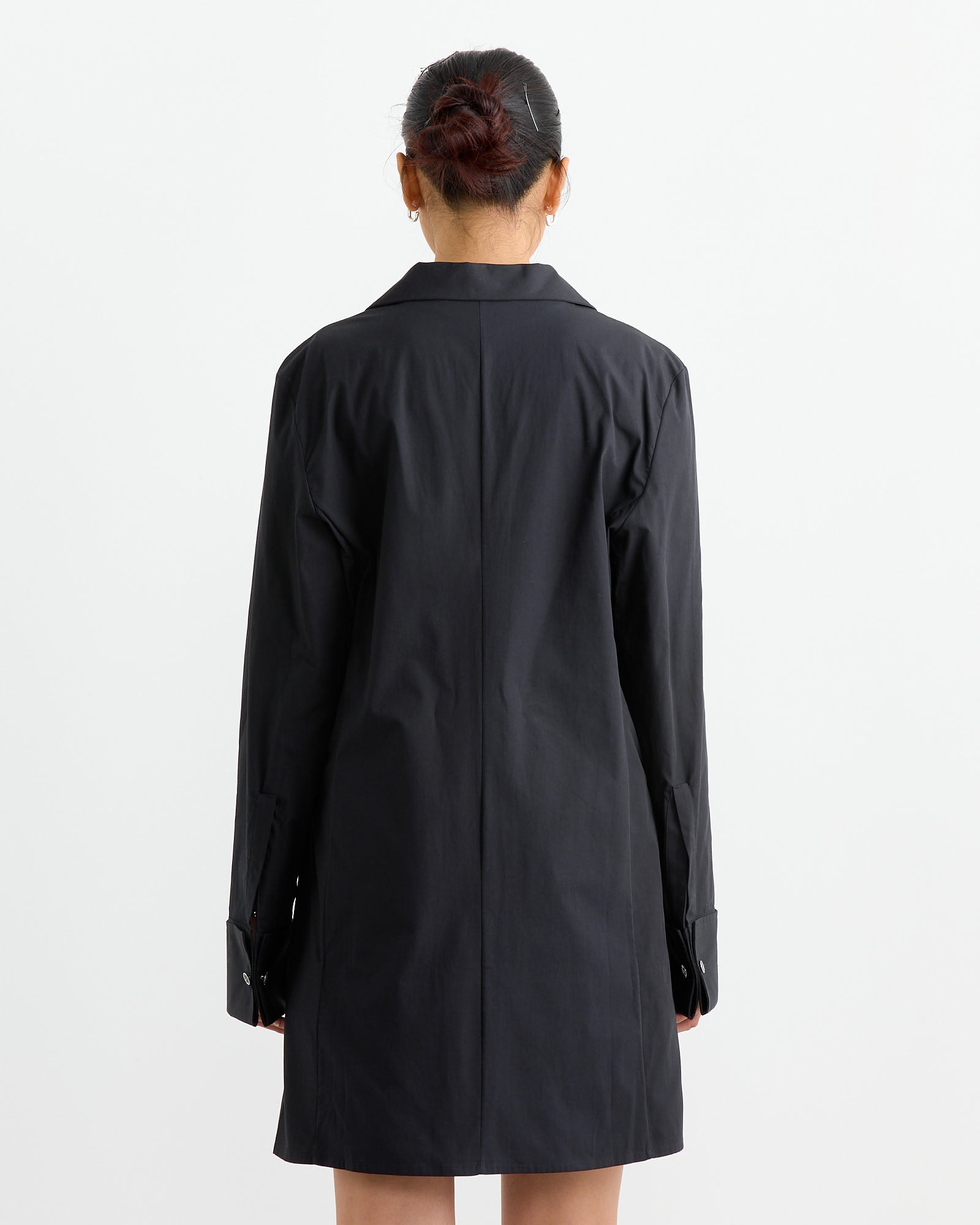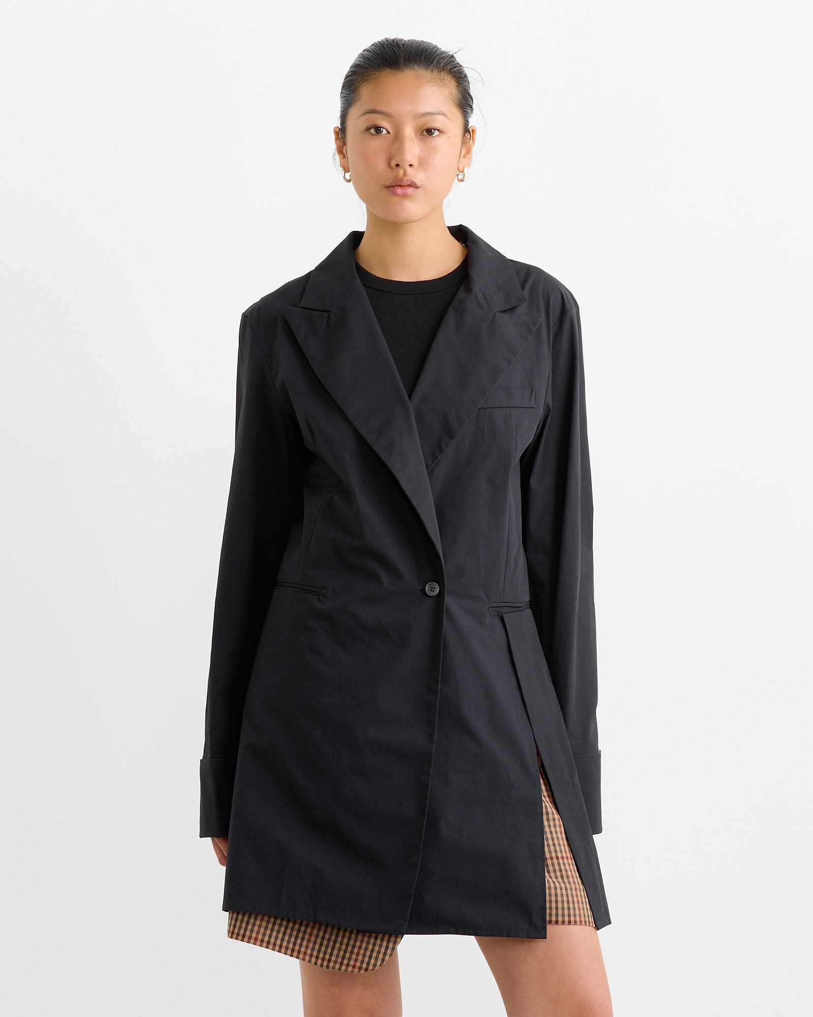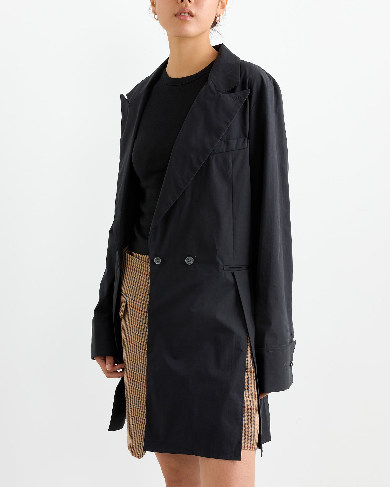 The Blazer Shirt by Our Legacy combines suiting-inspired elements with a relaxed silhouette, crafted from premium Italian cotton poplin. It features a peaked lapel, single-button closure, and darting for a tailored fit. Additional details include two welt pockets, foldable double cuffs with mother-of-pearl cufflinks, and a slightly curved hem for a refined yet casual look.