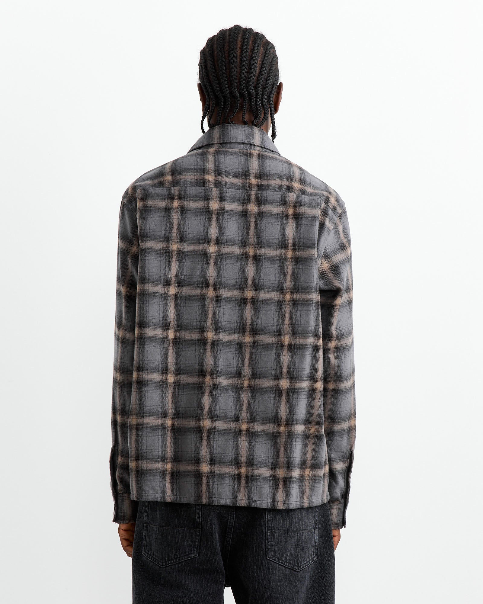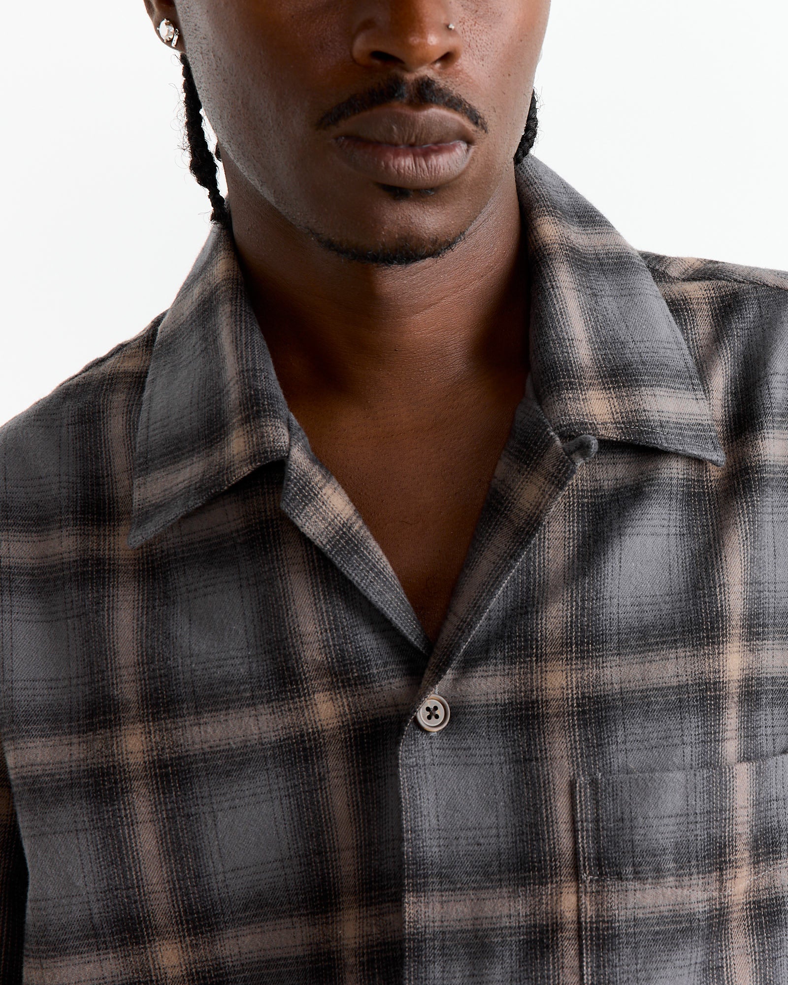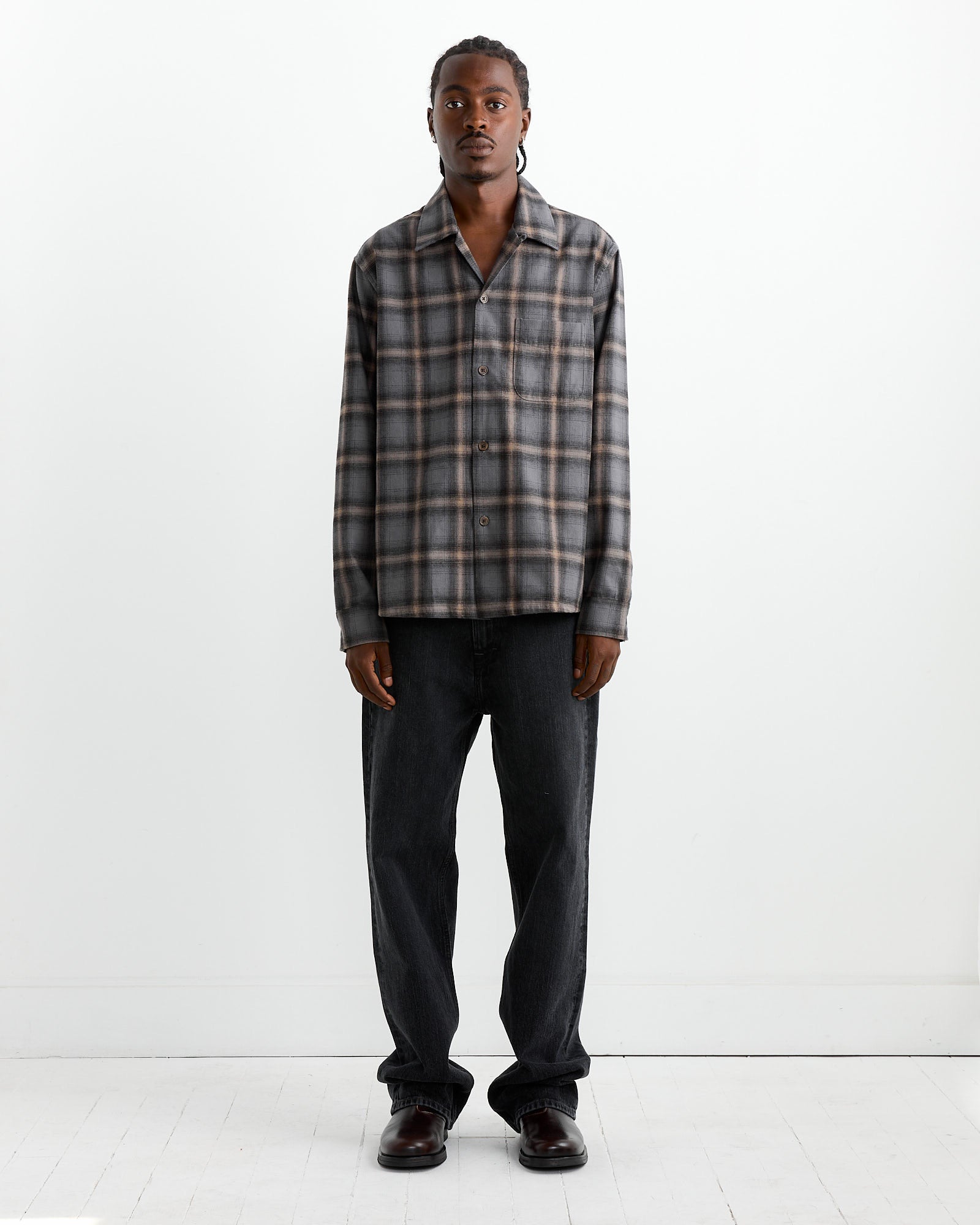 The Our Legacy Heusen Shirt in Oyster Check Hairy Flannel is crafted from textured Japanese cotton flannel, offering a slightly oversized boxy fit. The shirt features mother-of-pearl buttons, a single chest pocket, and a straight hem, delivering a blend of classic style and contemporary comfort. The check pattern adds a timeless touch to this piece, perfect for layering in cooler weather.