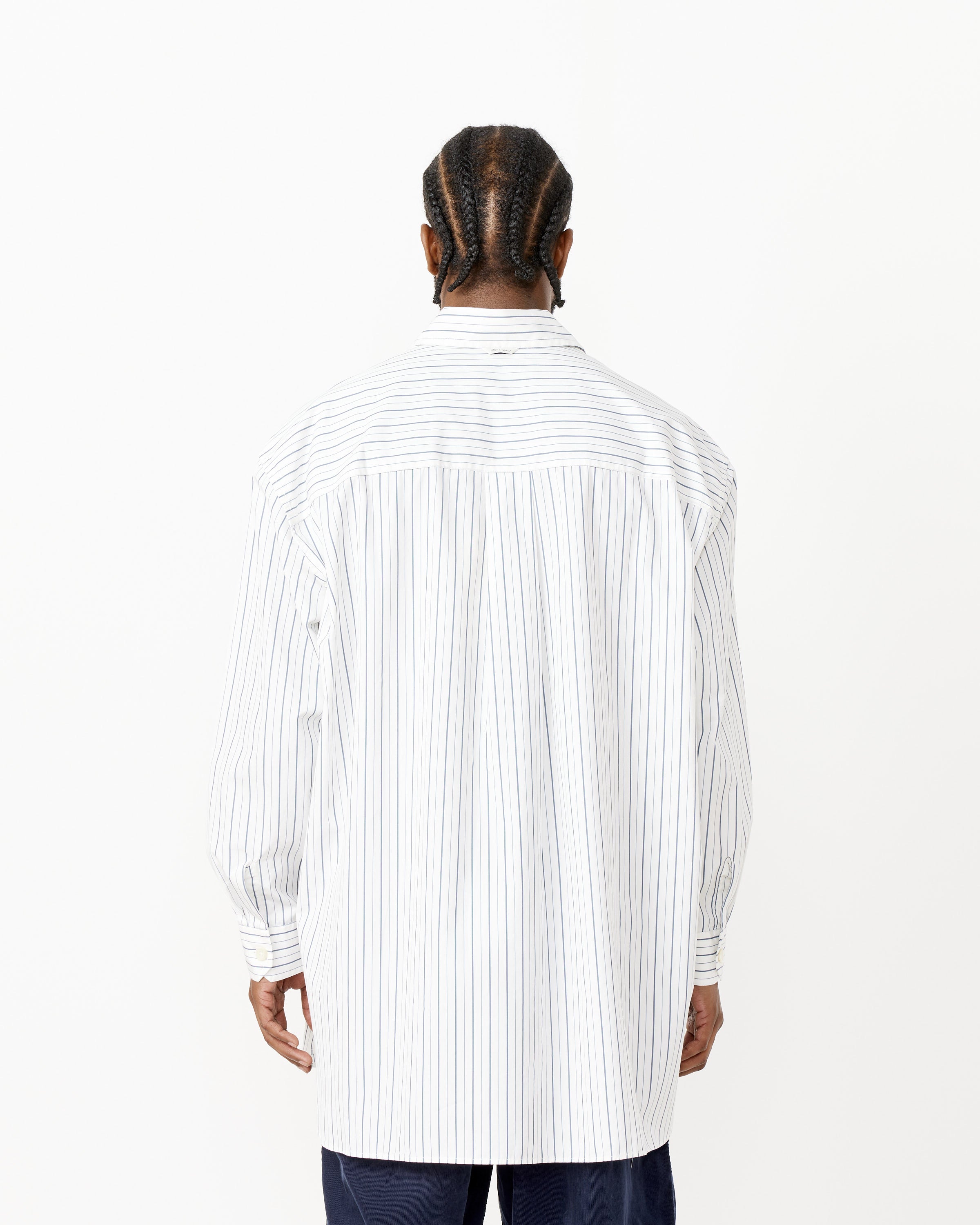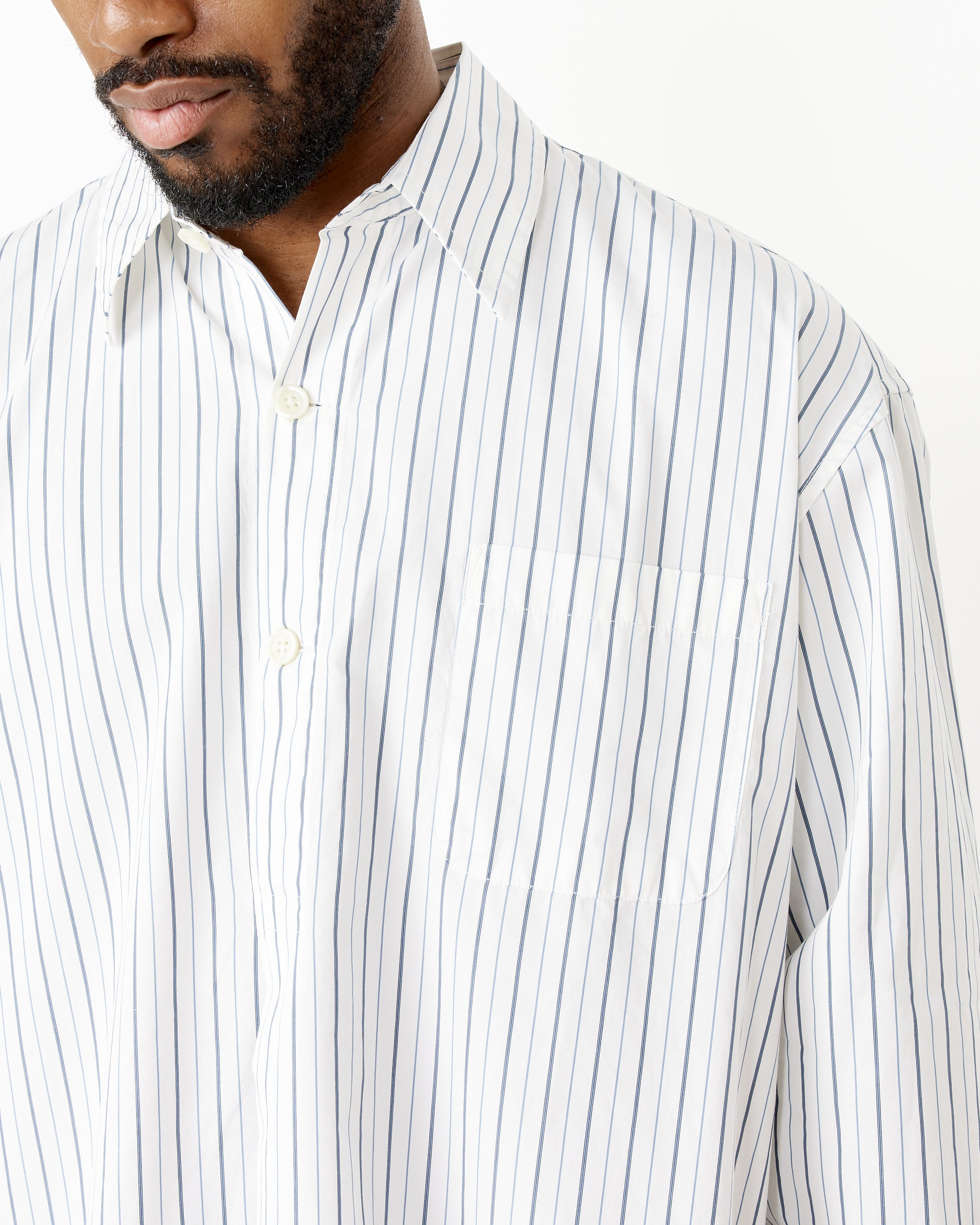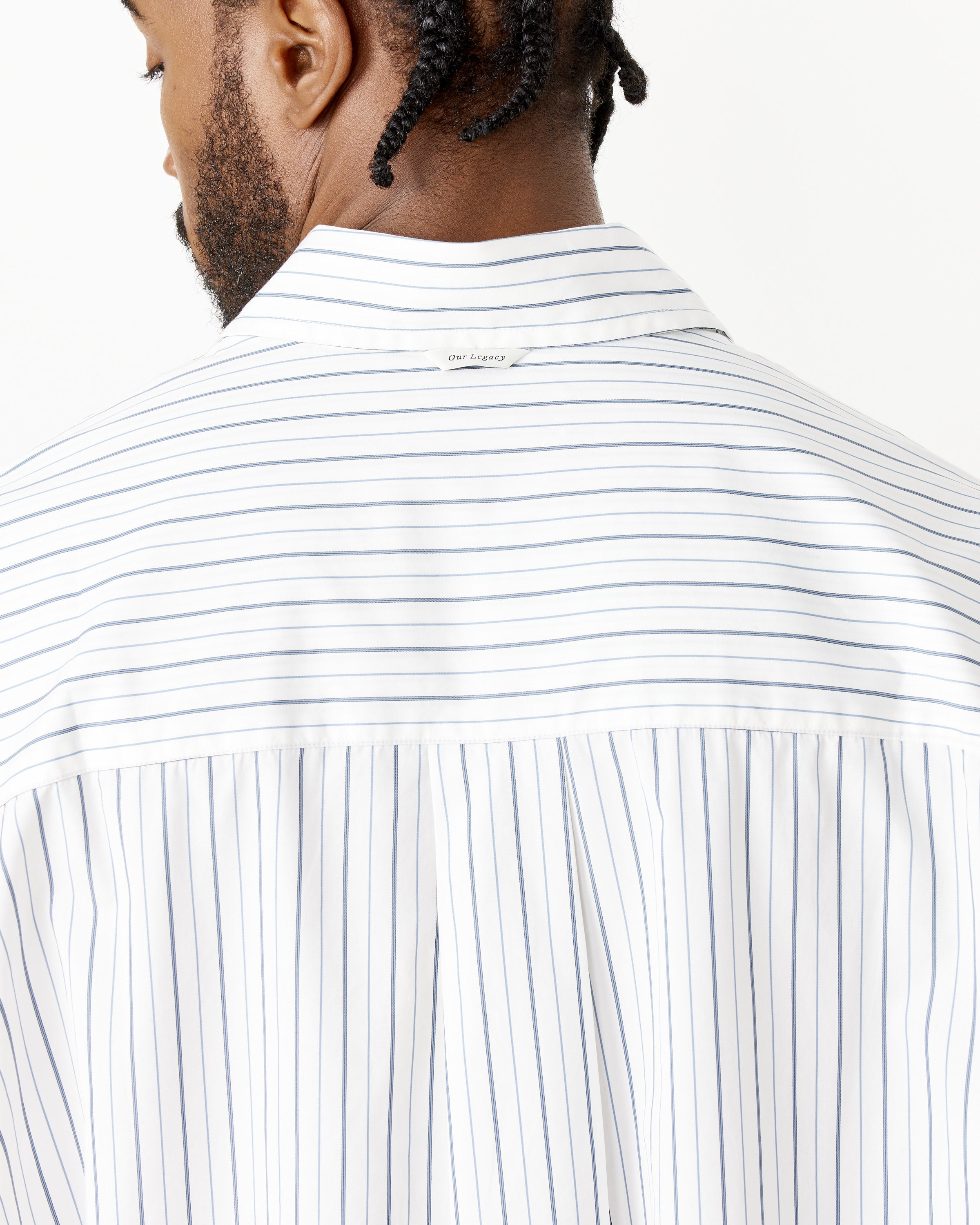 Produced in a soft Portuguese cotton fabric cut in a breezy oversized silhouette, Our Legacy's Popover Shirt in Olympic White Stripe features mother-of-pearl buttons, high side vents, and a dropped tail.
