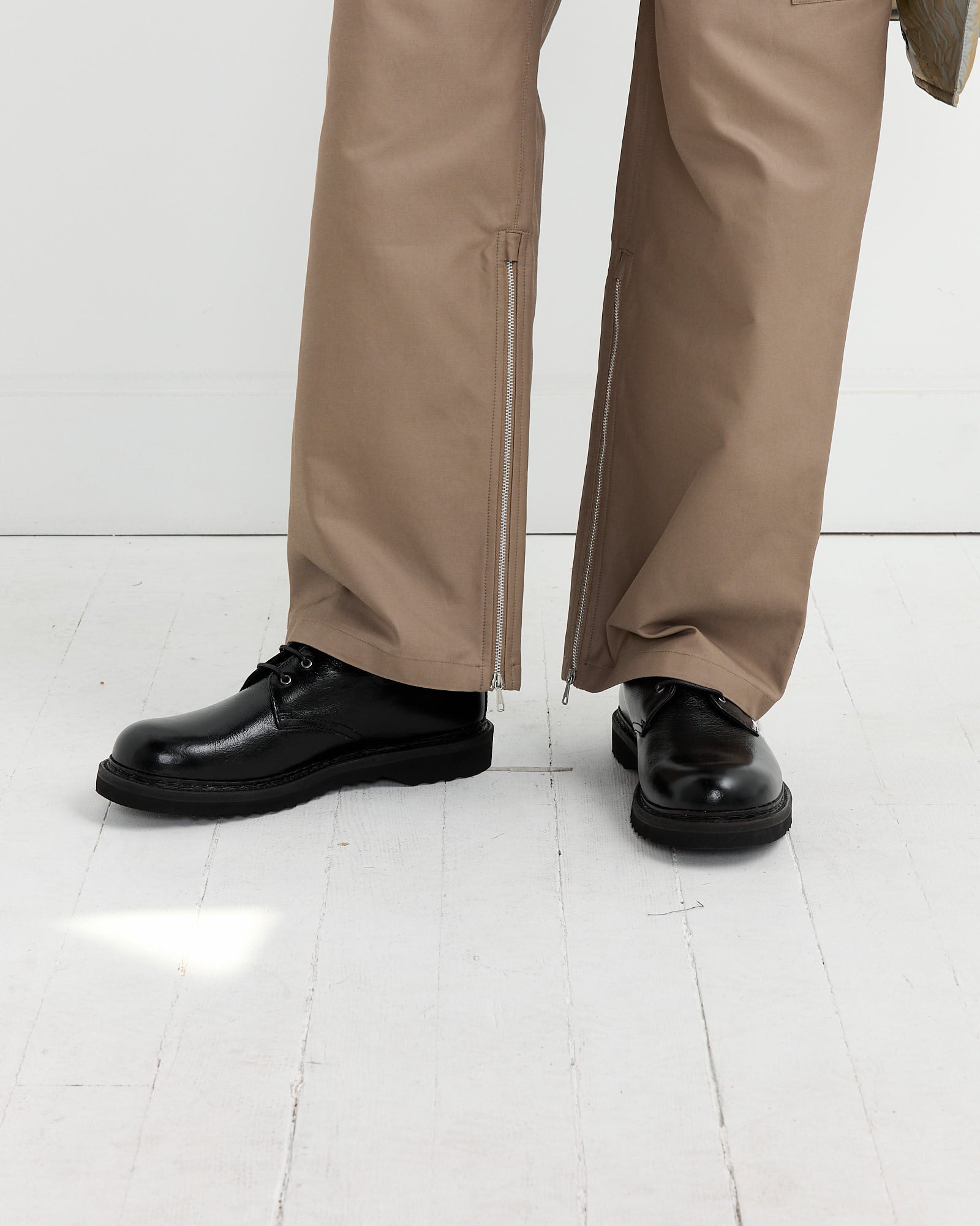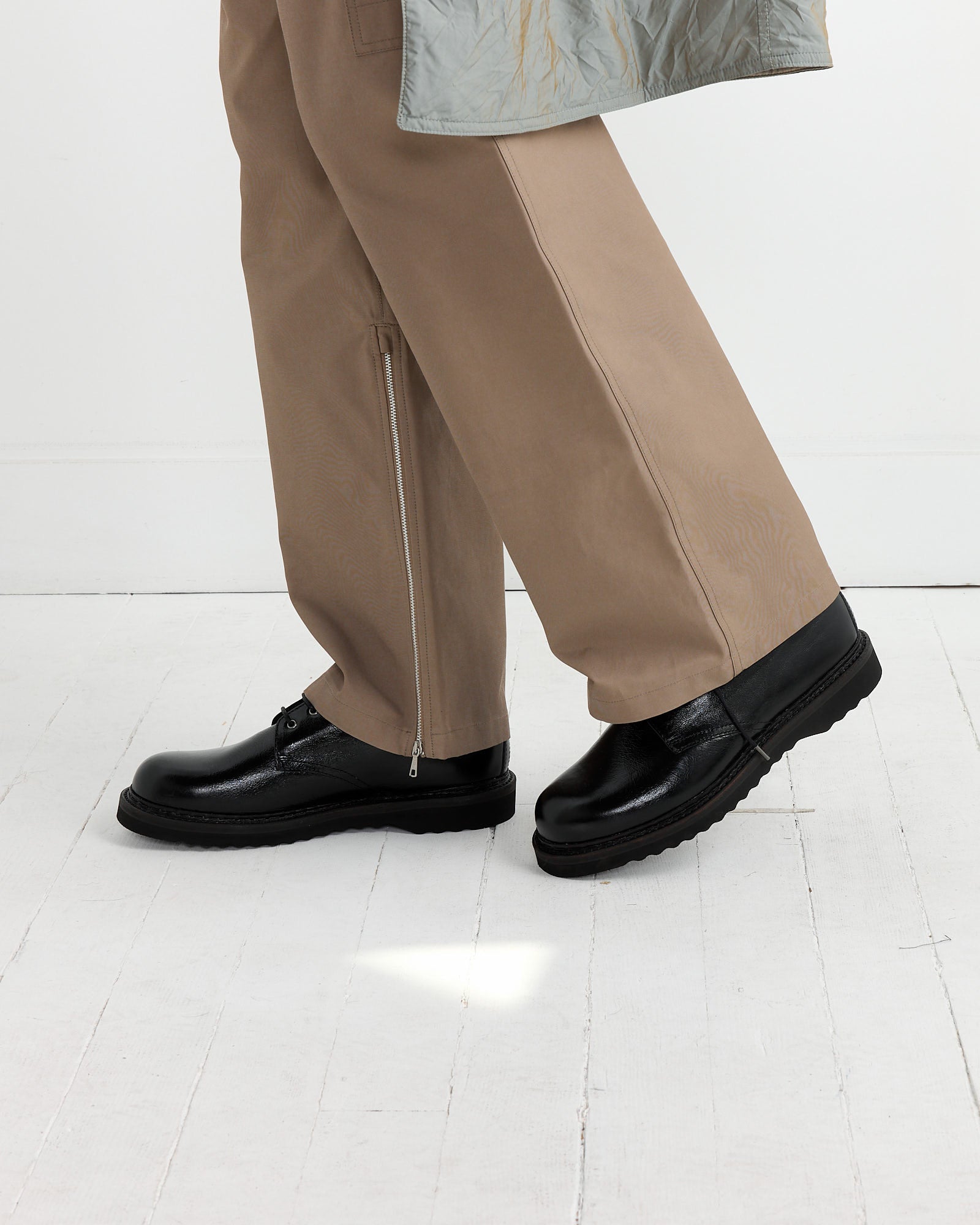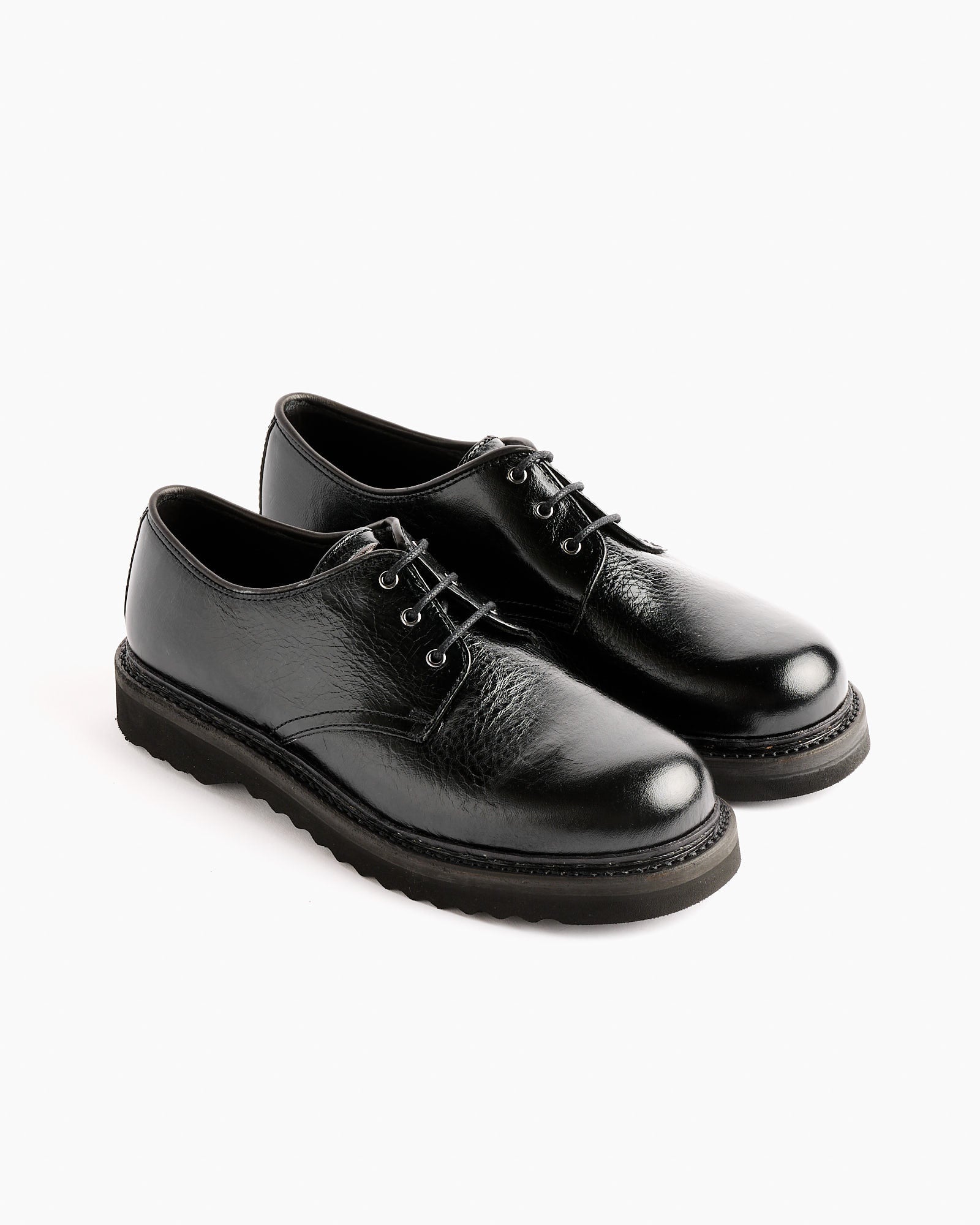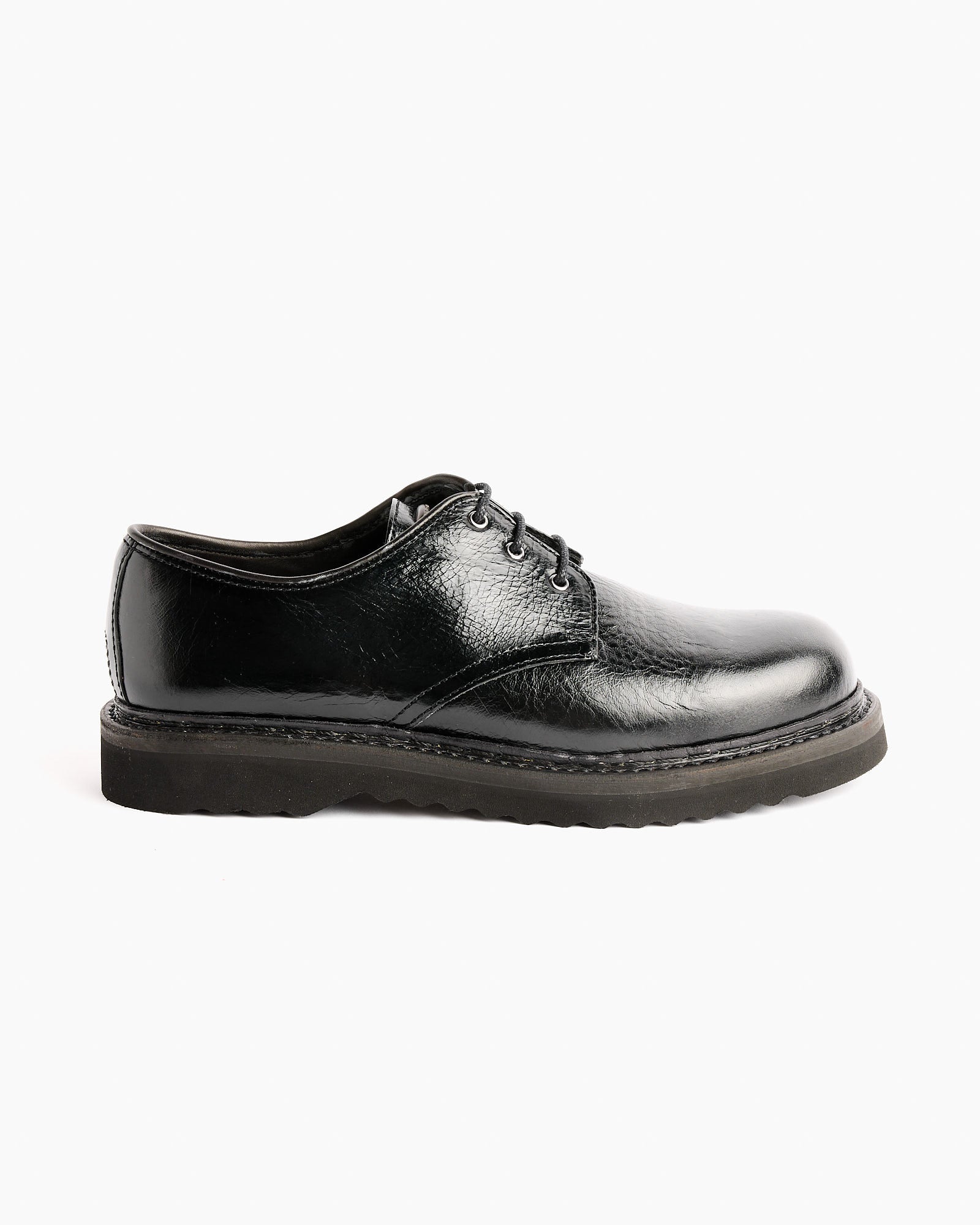 The Our Legacy Trampler Cracked Patent Shoe in Black is crafted from high-quality Italian leather, featuring a derby style with a distinct cracked patent finish. This shoe has a rounded toe and includes a leather midsole for added comfort. The outsole is made from a durable Vibram sole, ensuring both style and practicality. It's designed with a sleek, polished look that naturally ages and distresses over time, enhancing its unique character.