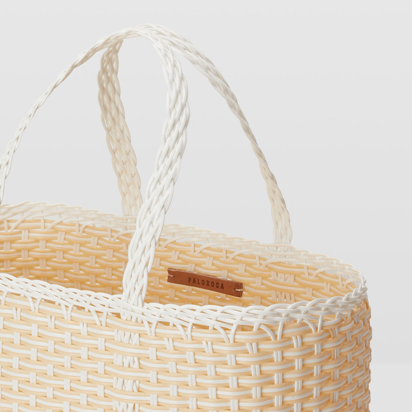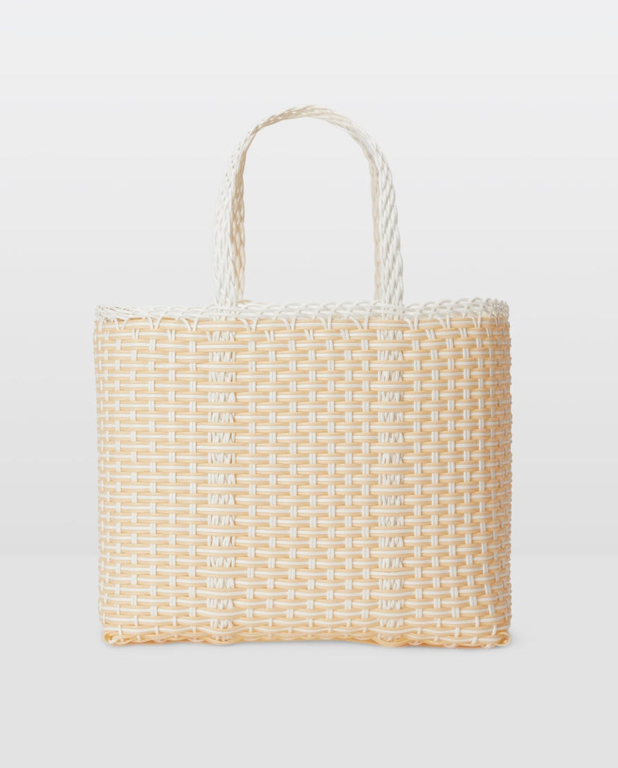 Designed in Italy and handmade in Guatemala using recycled plastics and ancestral weaving techniques, the Medium Trama Tote Bag in White + Cream features twin handles, a geometric pattern woven throughout, and a hand-sewn leather tag with branding.