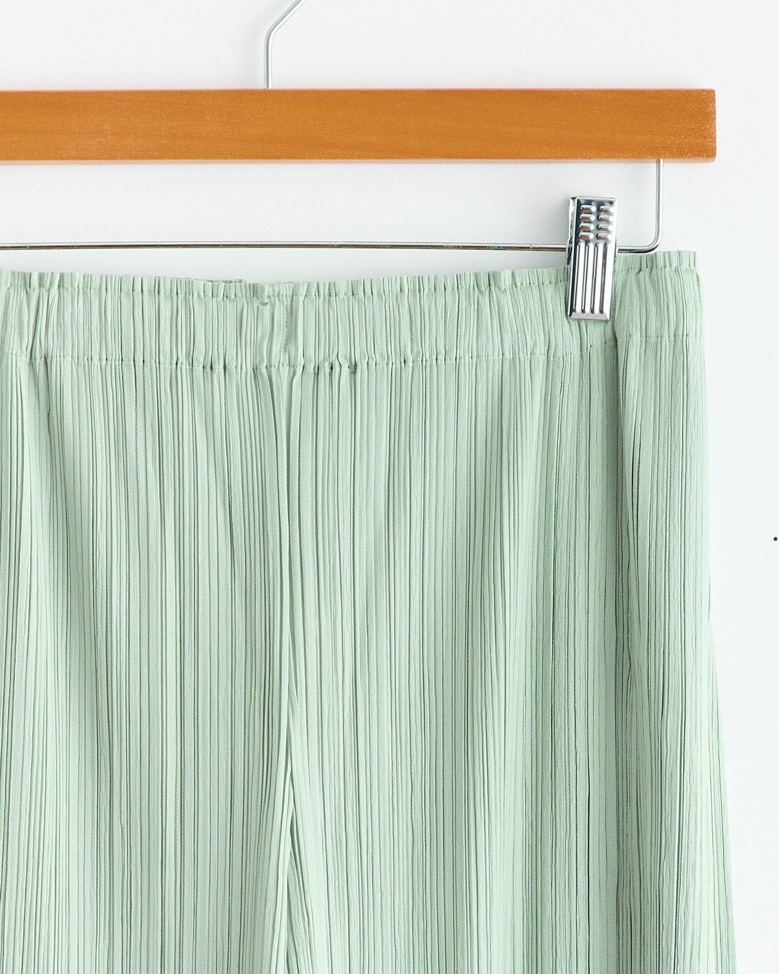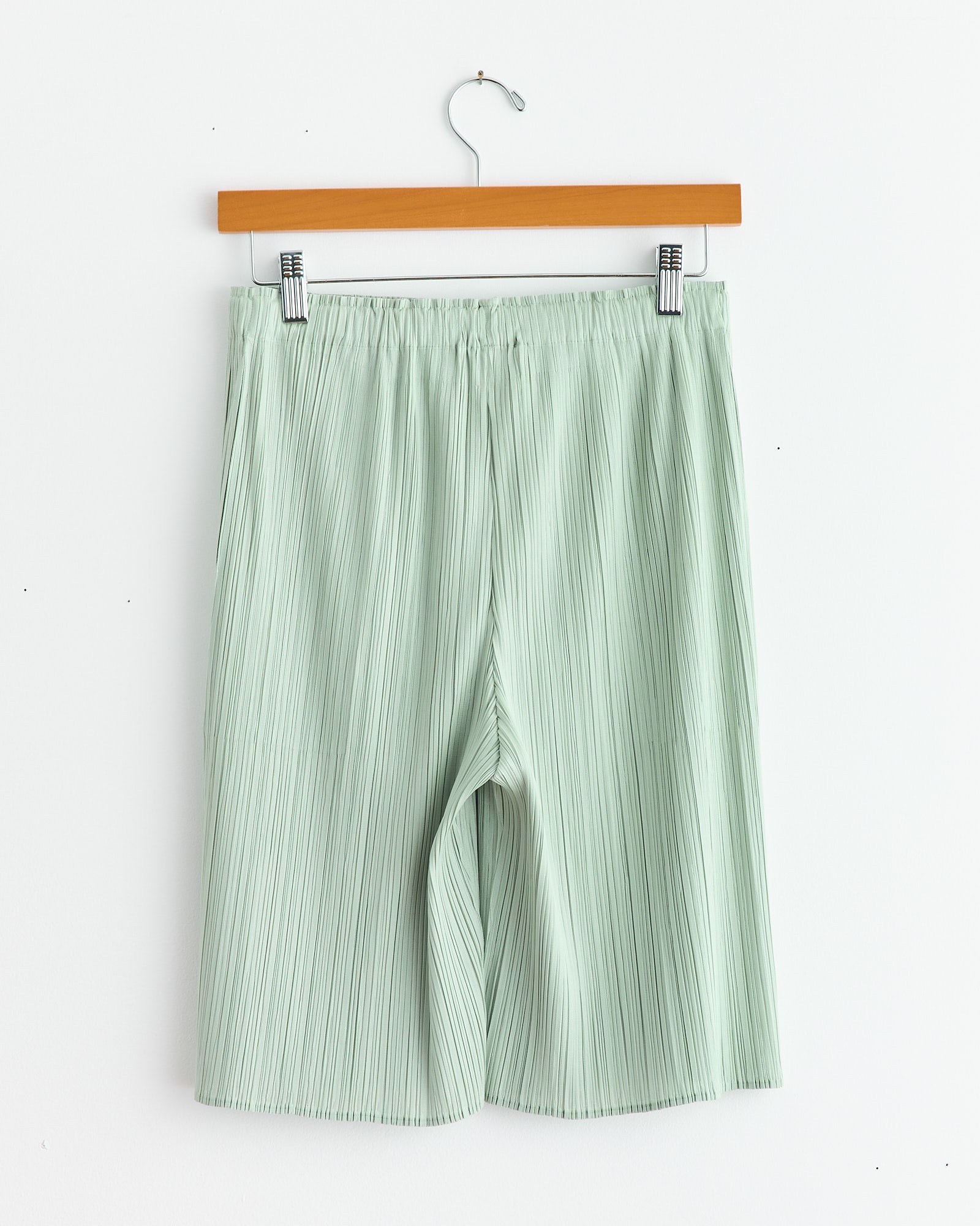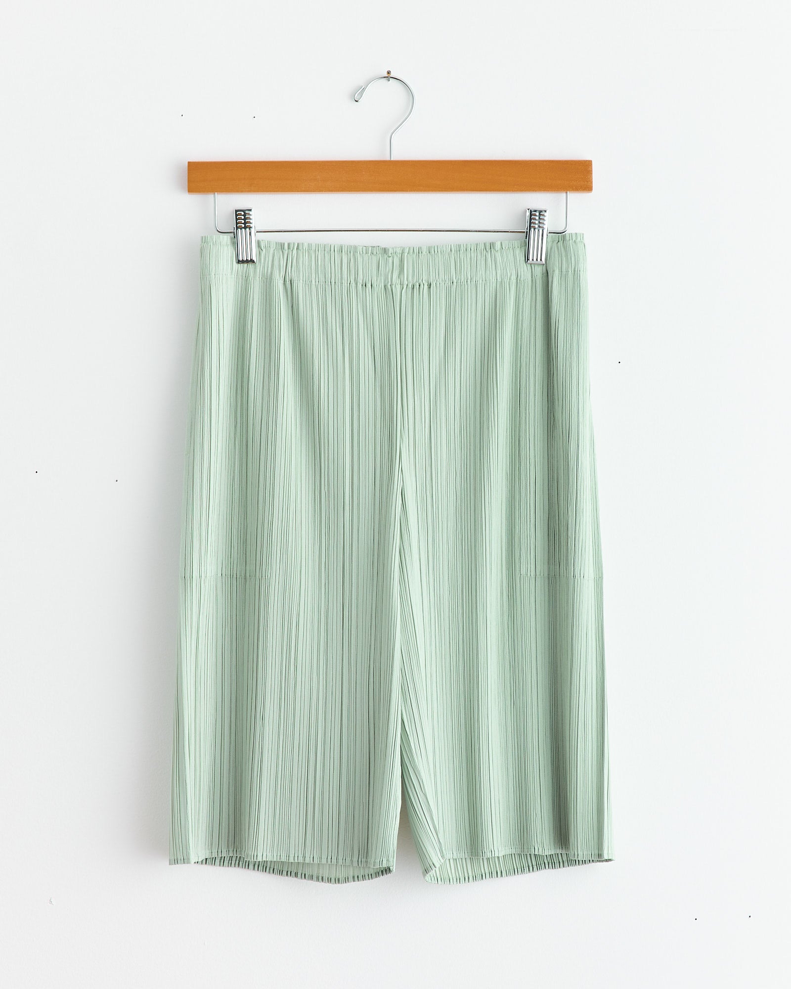 The Pleats Please Issey Miyake Monthly Colors June Shorts in Pastel Green feature pockets on both sides. The pastel green is reminiscent of the gentle light of early summer.