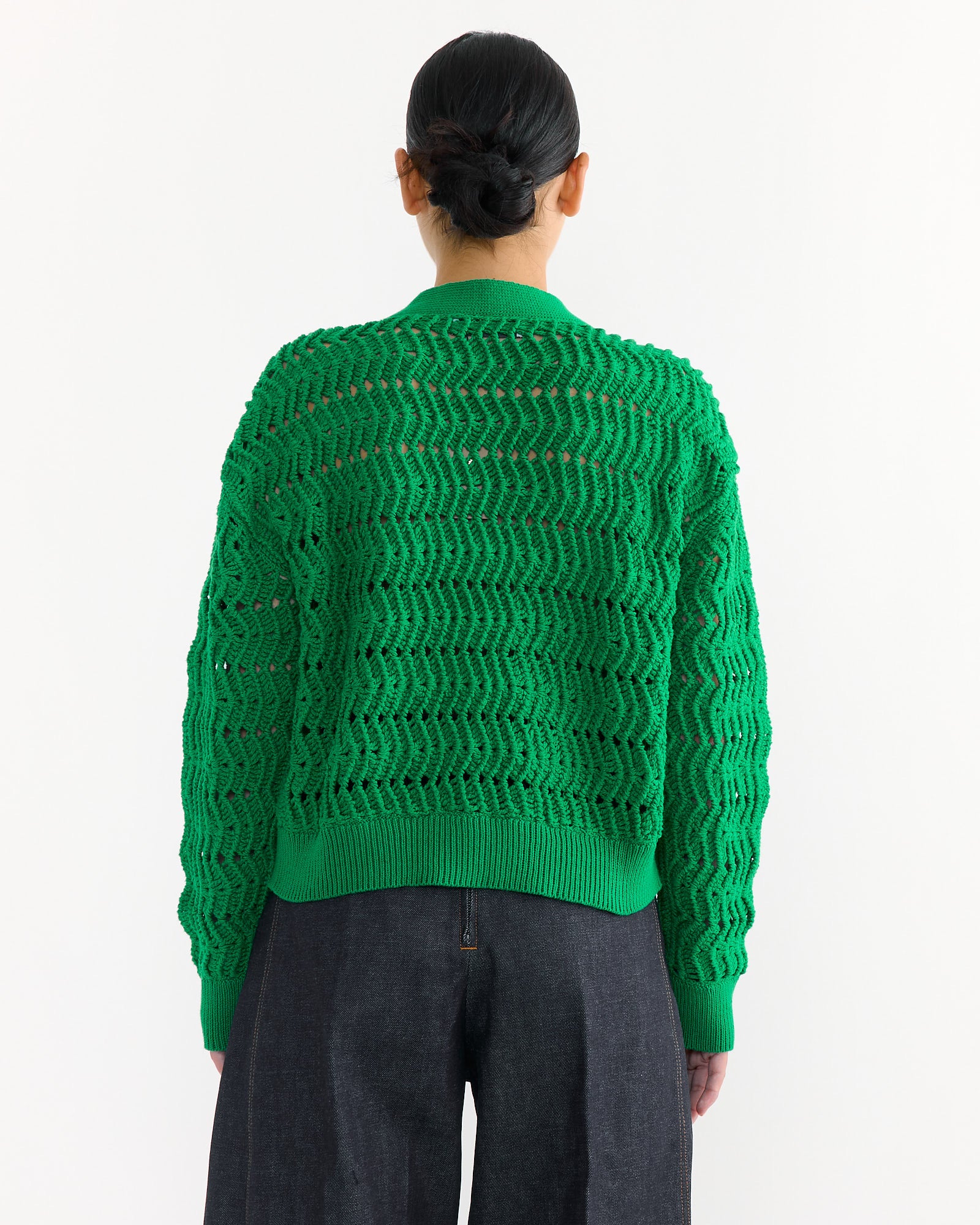 The Rachel Comey Avelar Cardigan is an easy knit layer featuring a wavy crochet design for a textured look. Designed with a V-neckline, button front closure, and ribbed cuffs and hem, it offers a relaxed yet refined feel. A versatile piece, perfect for layering across seasons.