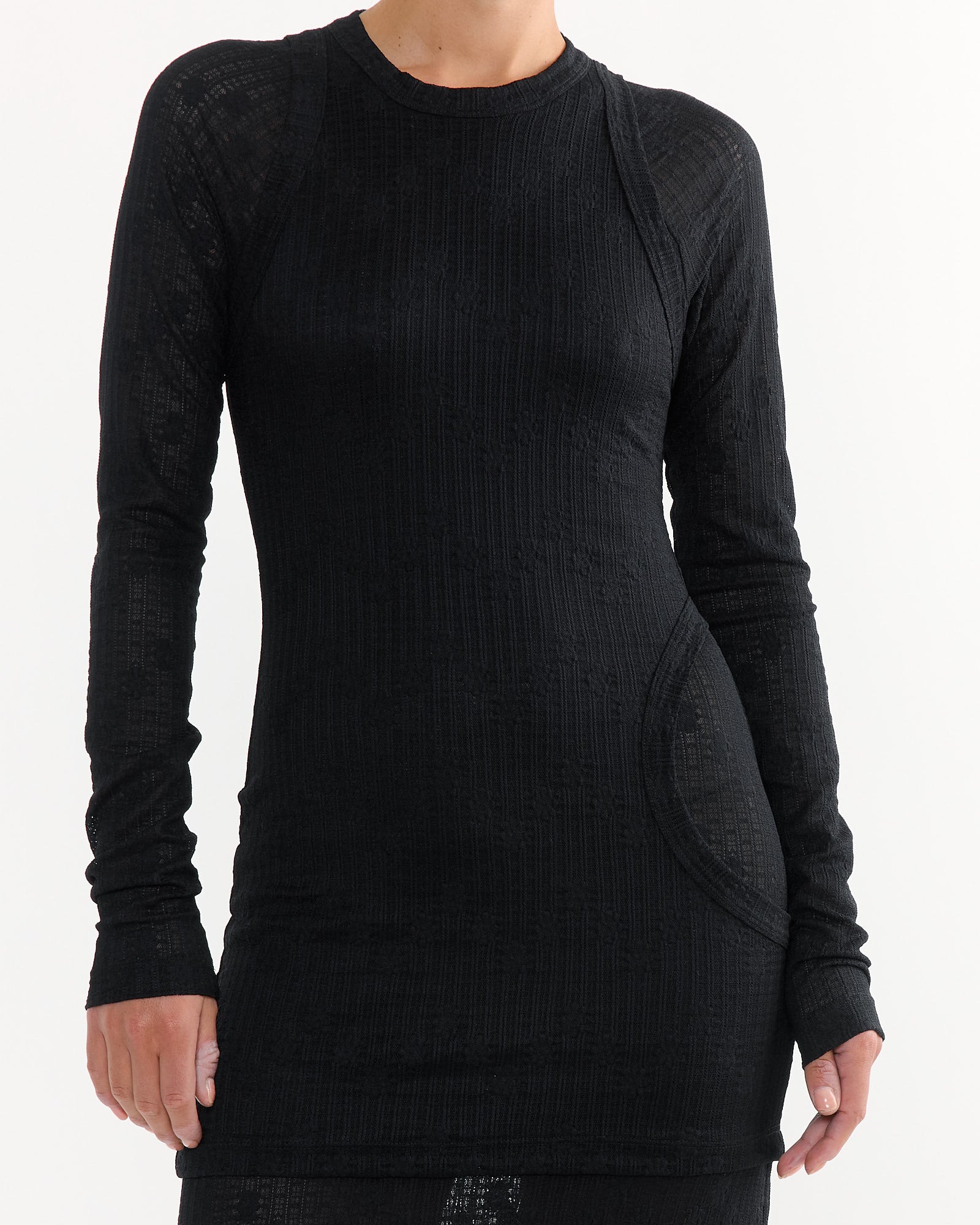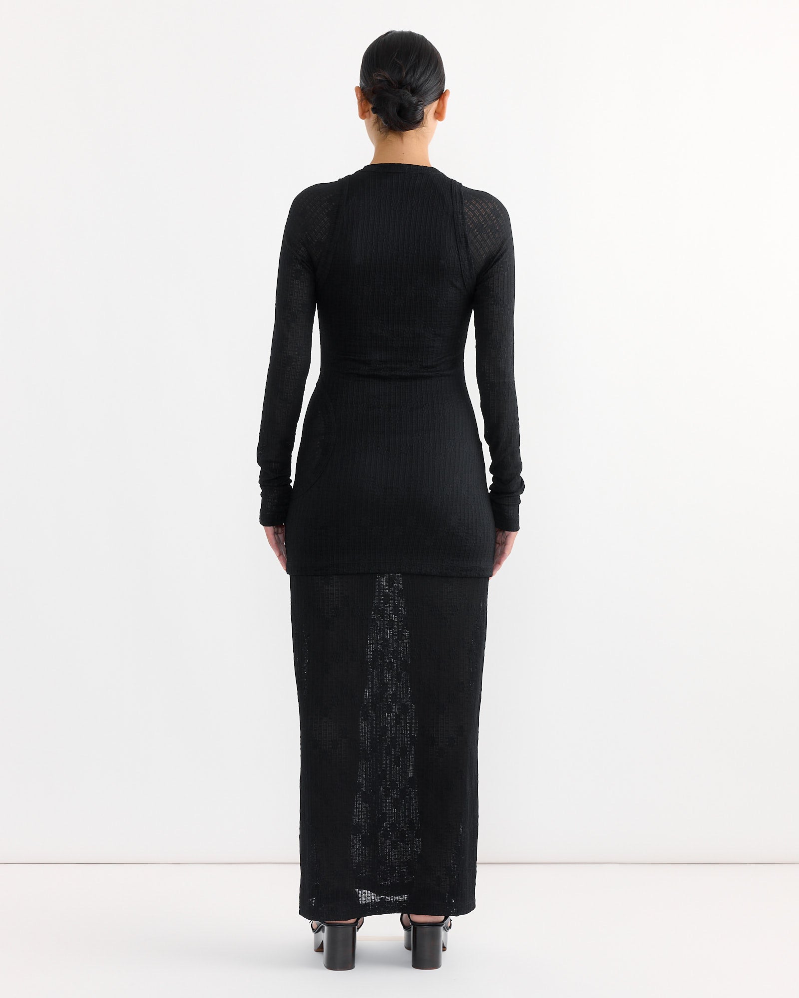 The Rachel Comey Glasglow Dress is a long-sleeve maxi dress crafted from semi-sheer Rosaline Lace with delicate floral details. A double-layered bodice provides coverage and dimension, while a side cutout adds a bold, modern touch. Designed with a slim fit and a classic crew neckline, it offers an elegant yet contemporary silhouette.
