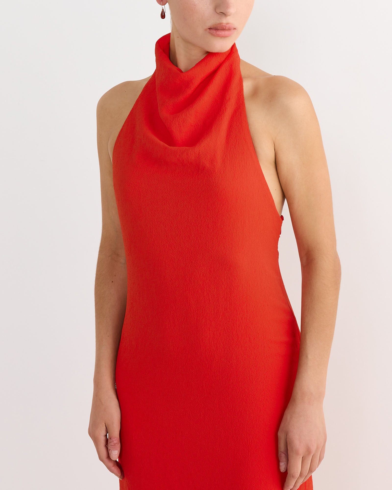The Rachel Comey Sevier Dress in Red is crafted from crinkled georgette crepe and features a sleeveless halter design with a high draped cowl neckline. A back button closure completes the look, while the skirt falls elegantly to just above the ankle.