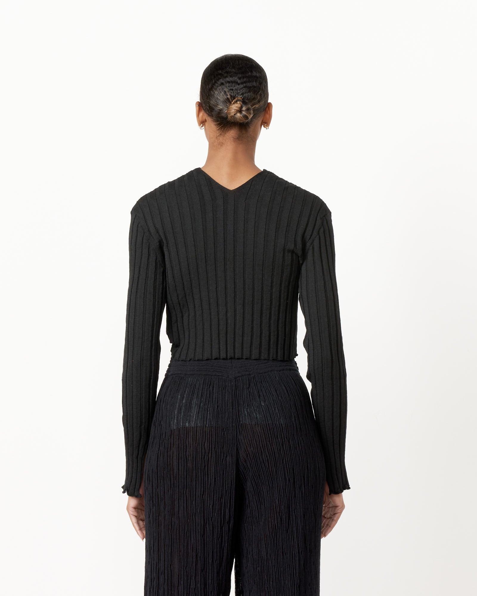 Alexis is 5'9" with a 26" waist, 30" inseam, 37.5" hip and 30" chest. Alexis is wearing the Hoyo Cardigan in size S.