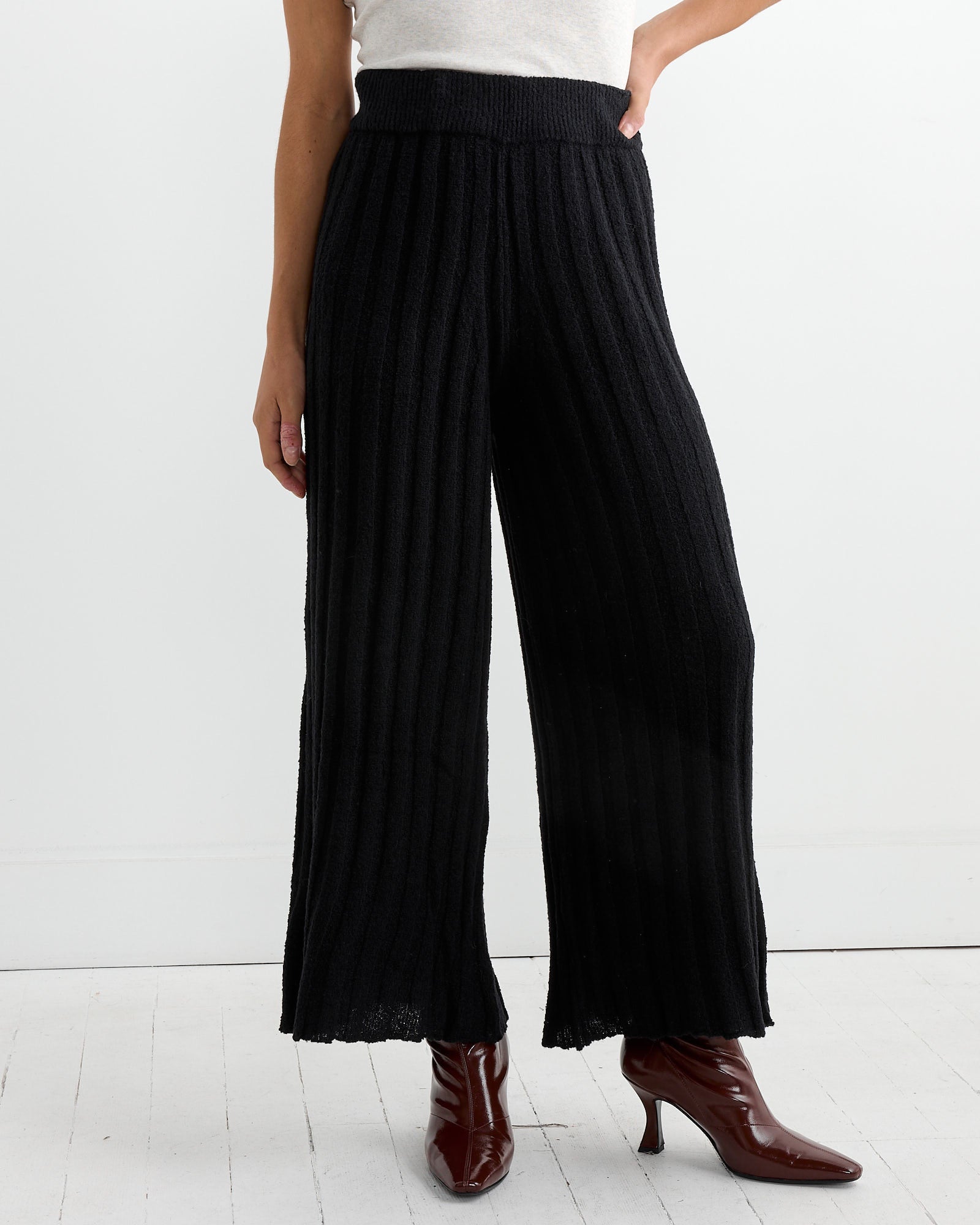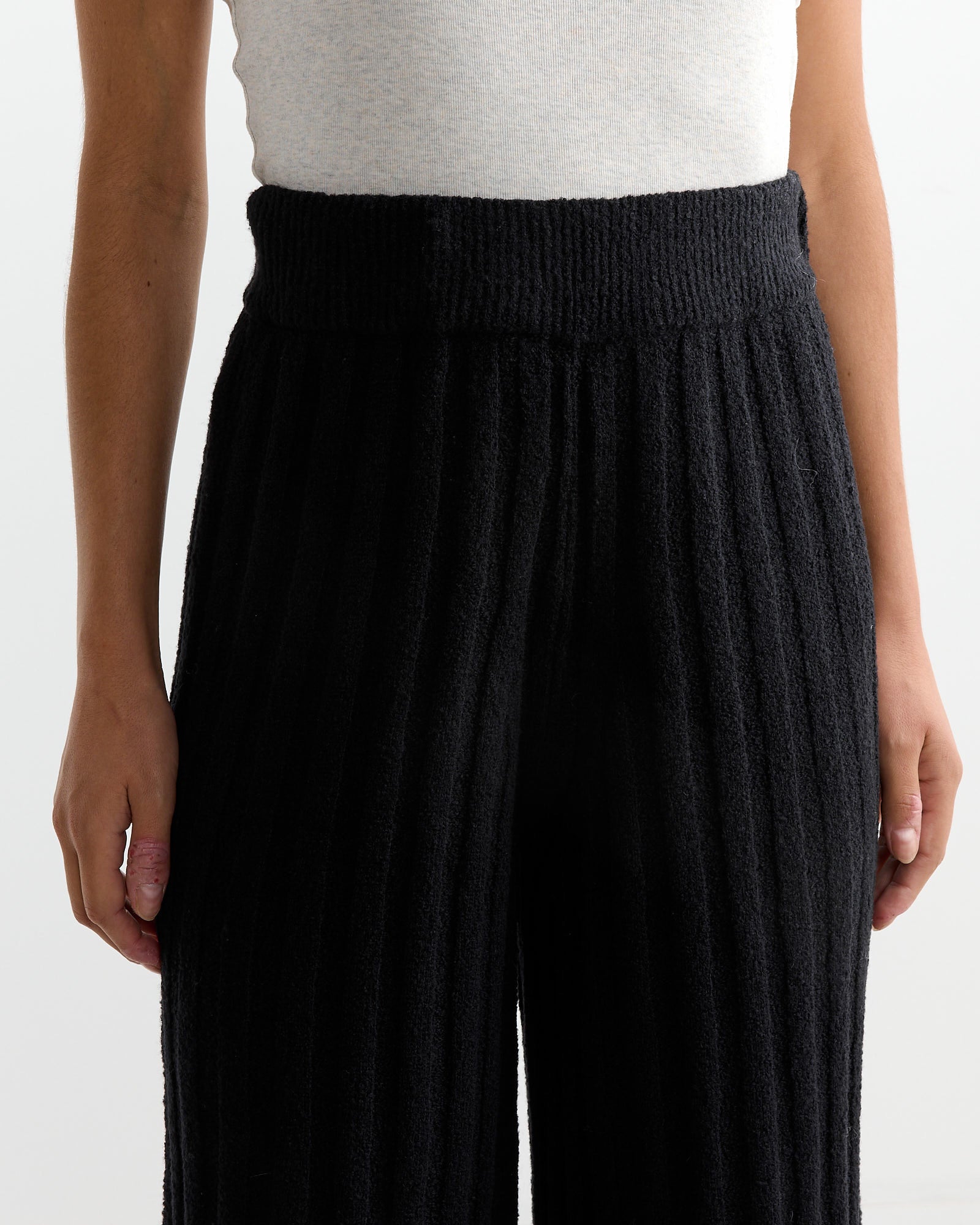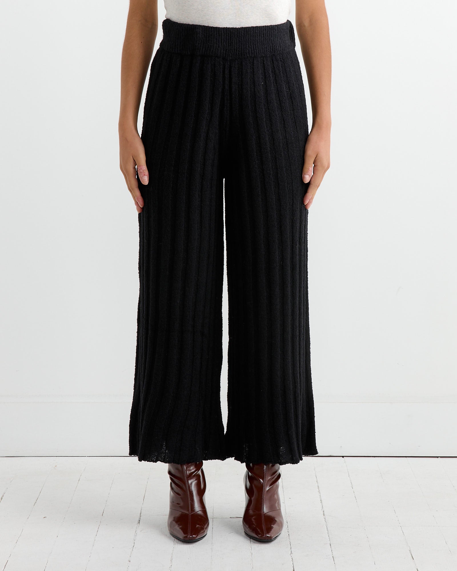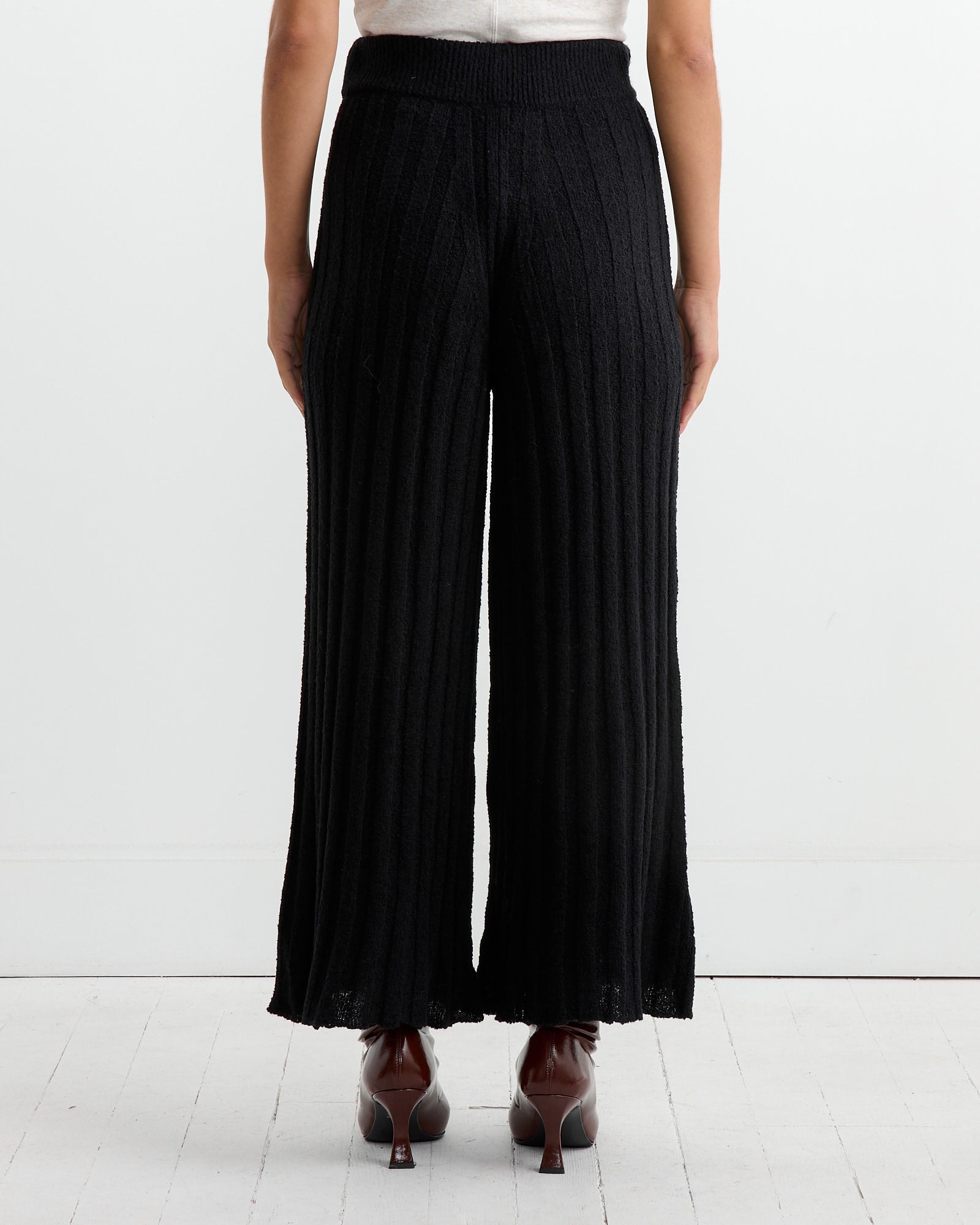 The Rus Nakiri Pant in Black features a wide-leg silhouette with a ribbed, pleated texture, offering both style and comfort. Knitted from a soft, lightweight wool bouclé blend, these pants have a ribbed elasticated waistband for a relaxed, comfortable fit.