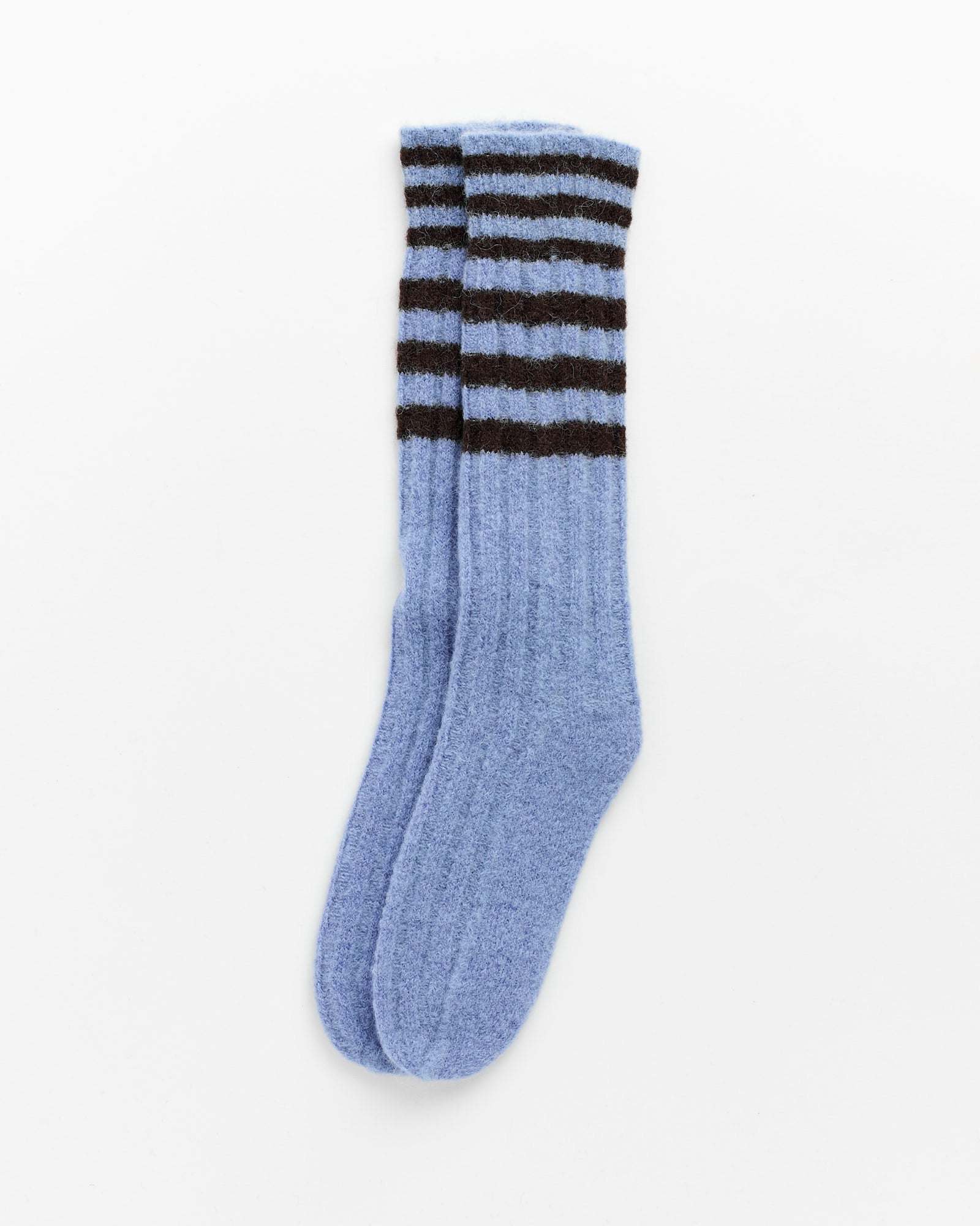 Striped chunky mid-calf socks knitted from a soft and fuzzy baby alpaca blend for extra warmth.