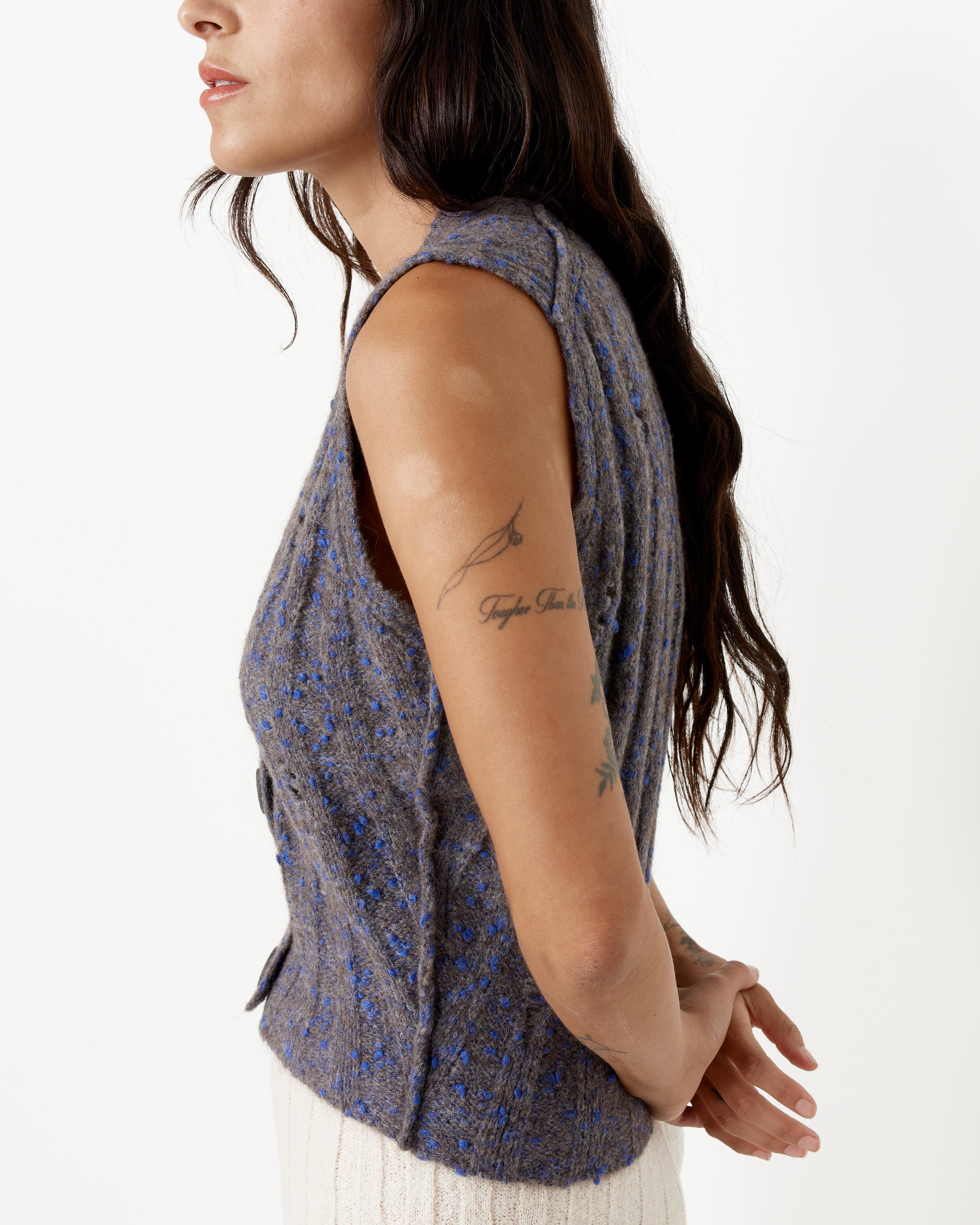 A woman with long dark hair stands in profile against a white background, wearing the RUS Yugure Vest—a sleeveless, textured gray knit flecked with blue—and cream pants. Tattoos on her arms are visible as she clasps her hands behind her back.