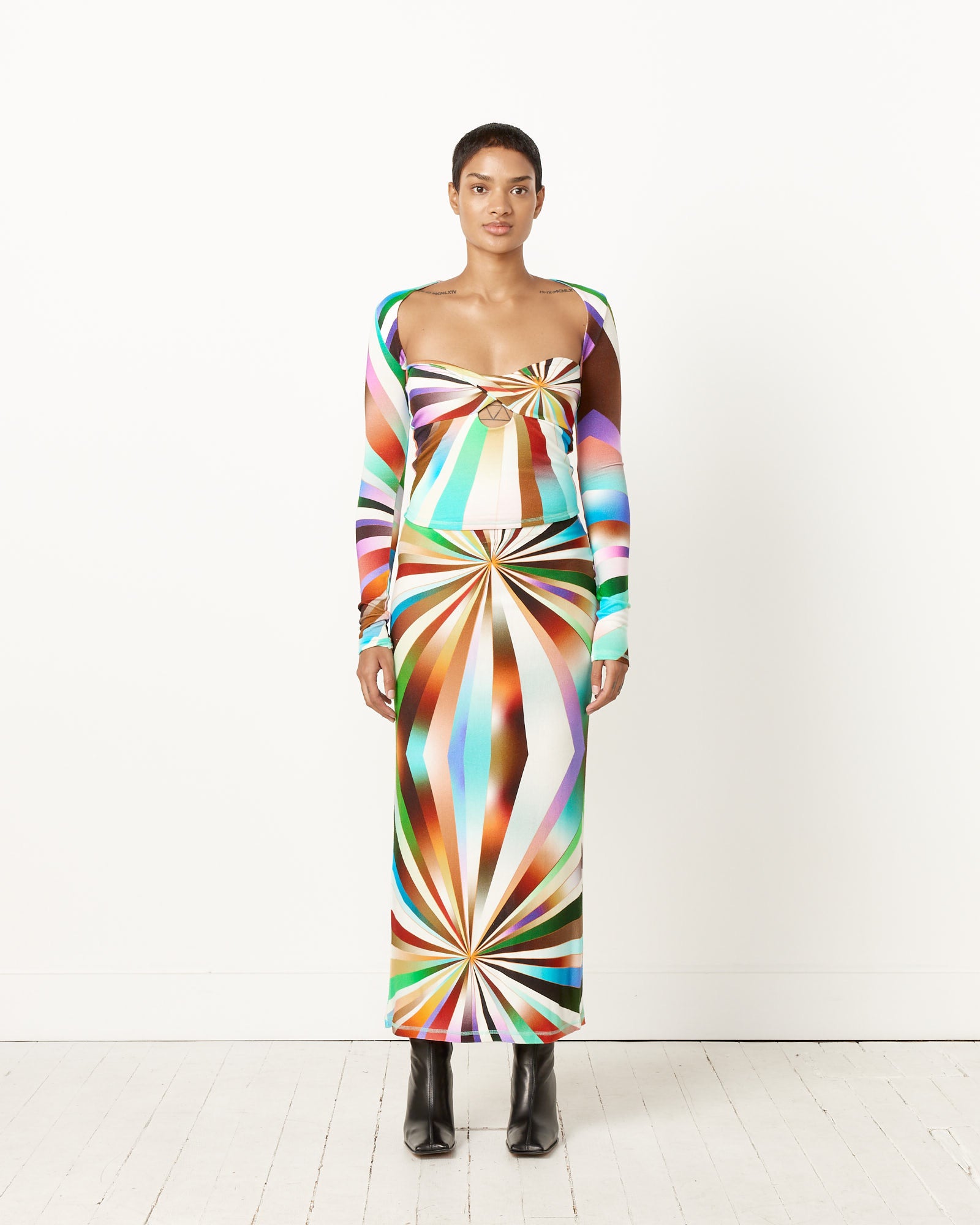 Siedrés' Divy Top is done with a vibrant geometric print, a hallmark for the brand, across a slim silhouette that features a front knot at the bodice above a cut-out detail and a cropped hem.
