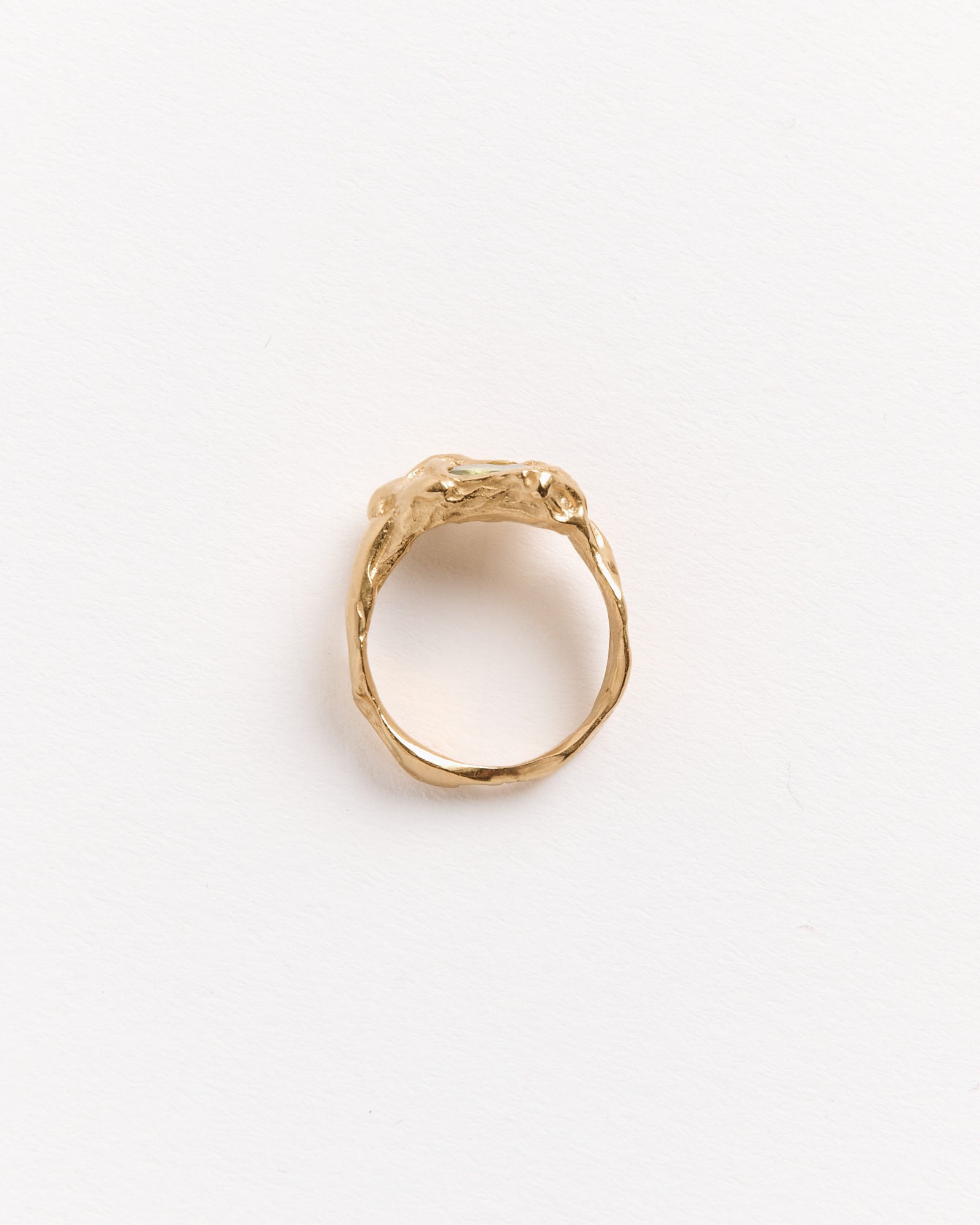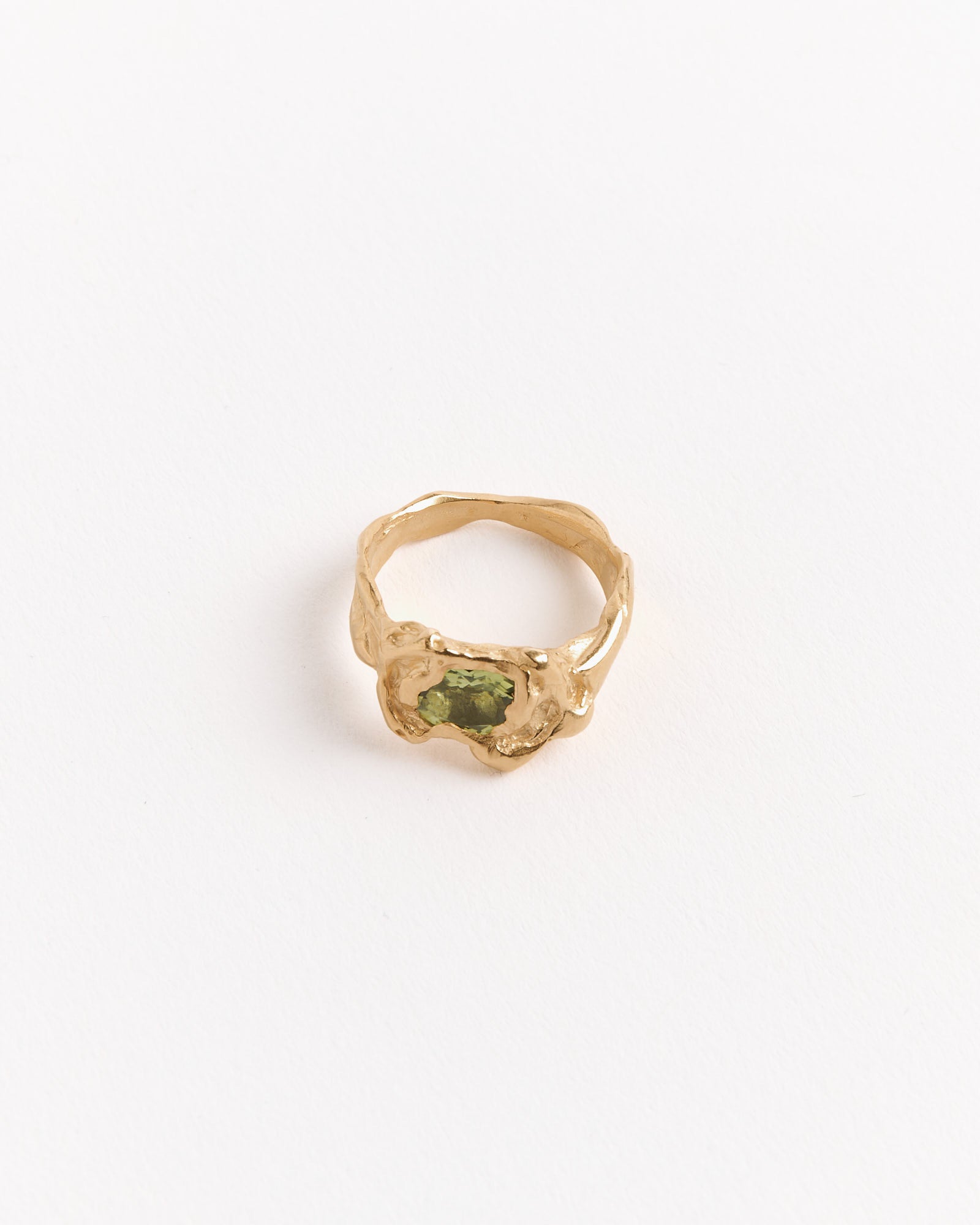 The Simuero Ola Ring in gold-plated recycled silver features a striking green peridot stone and is inspired by organic forms from nature. This ring is part of Simuero's La Costa Collection, designed to evoke marine shapes and textures, giving the piece a natural, weathered look, as if shaped by sand and sea over time. Each ring is handmade in Valencia, Spain, with slight variations that make every piece unique.