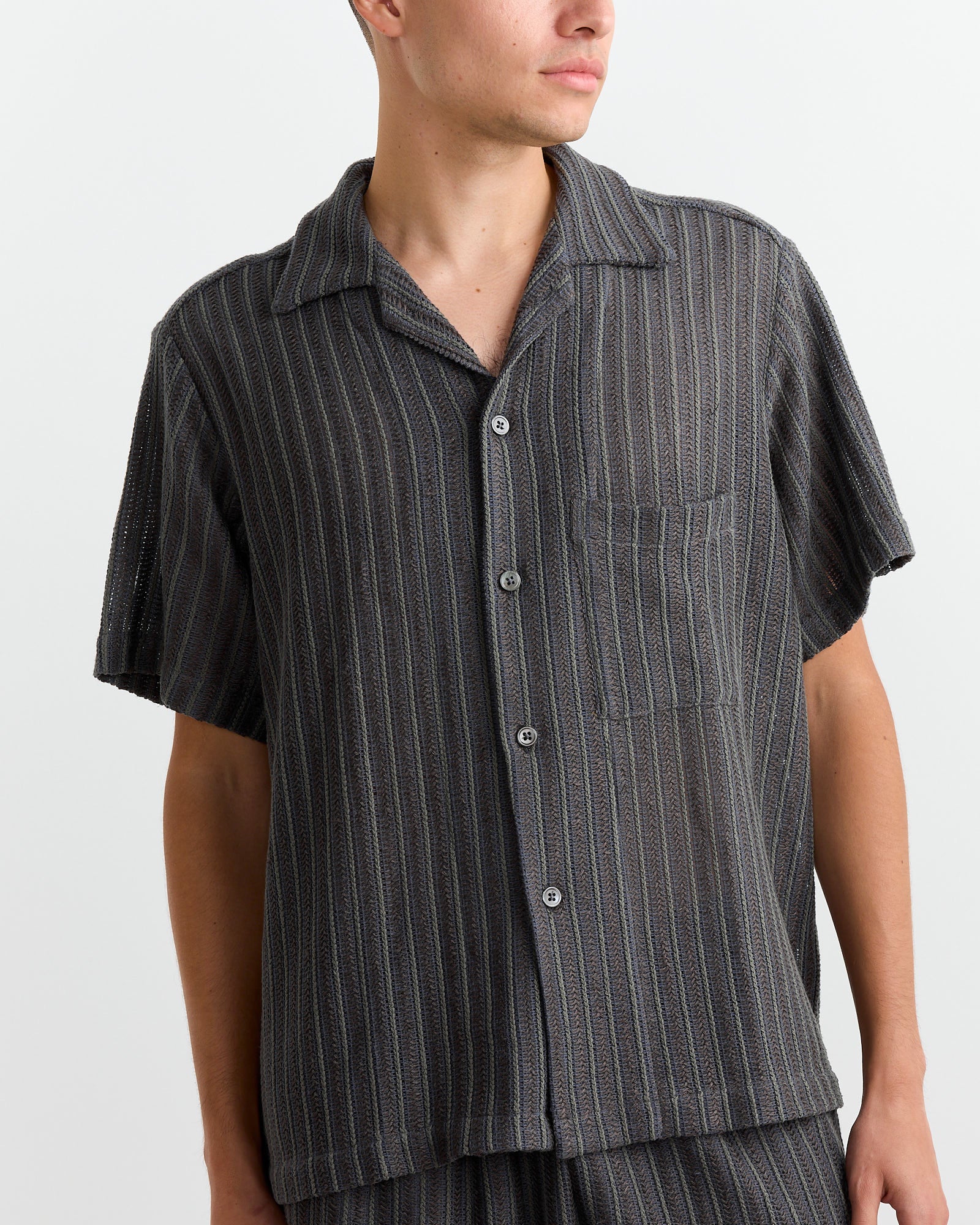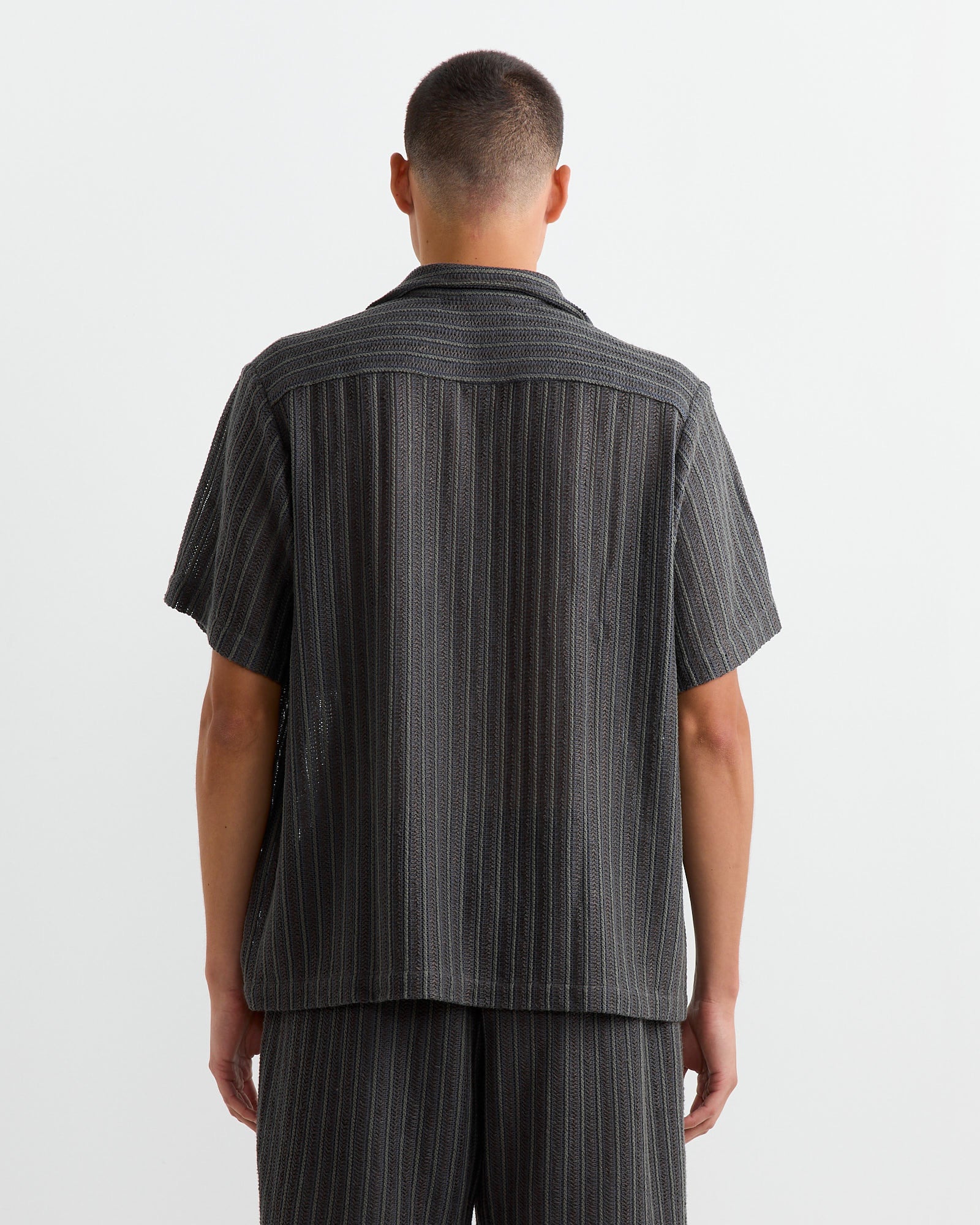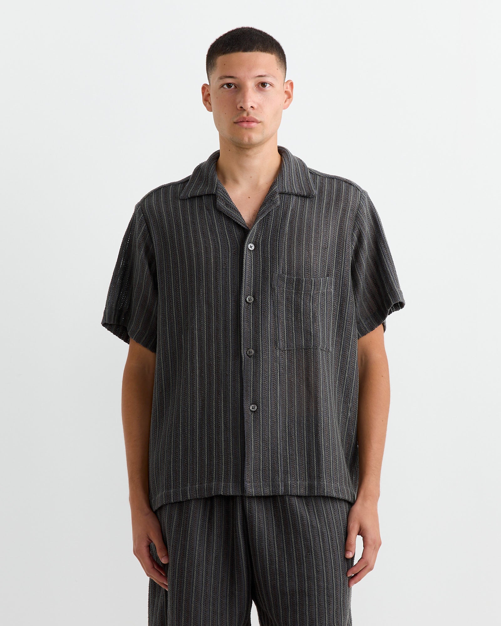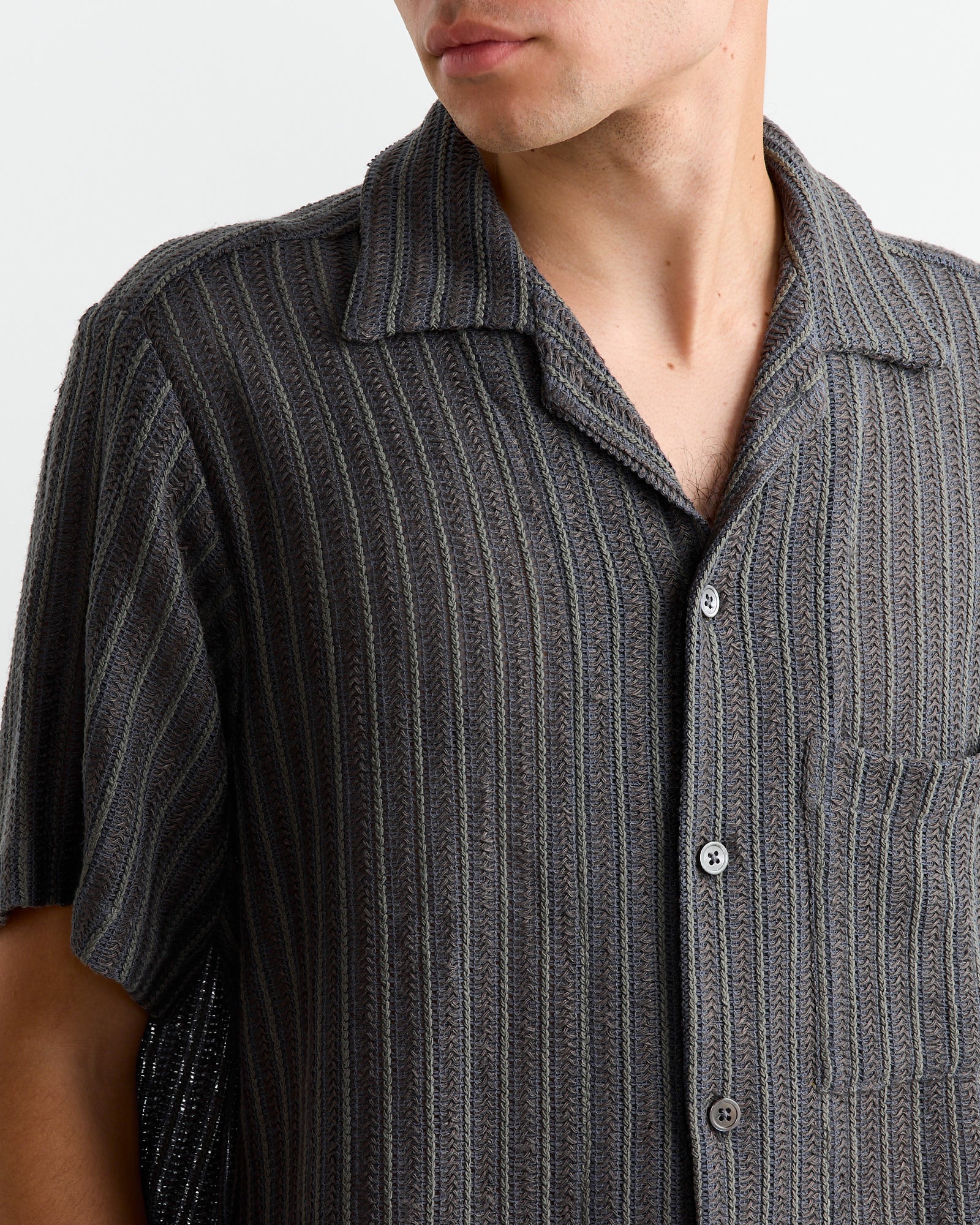 Our modern take on the classic camp shirt, the SMOCK Acoustic Shirt features the open collar and boxy fit associated with this timeless and versatile style and updates the silhouette with a unique Japanese linen-blend fabric knit on the special Russell Knitting Machine, heralded for crafting special fabrics with unique, vertically oriented threads.