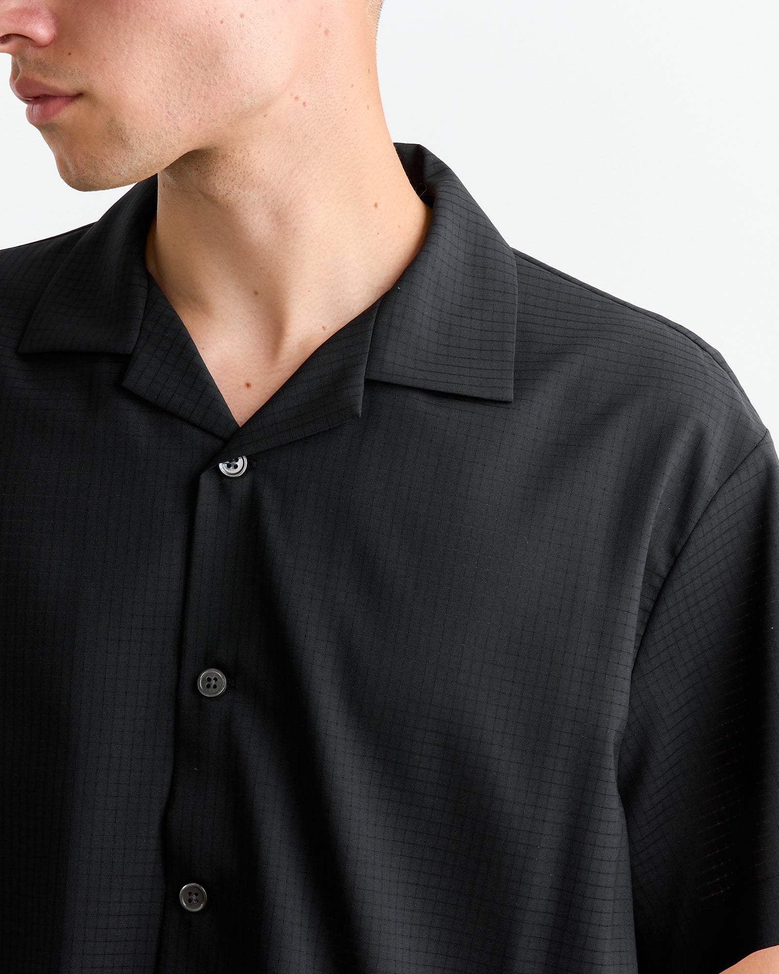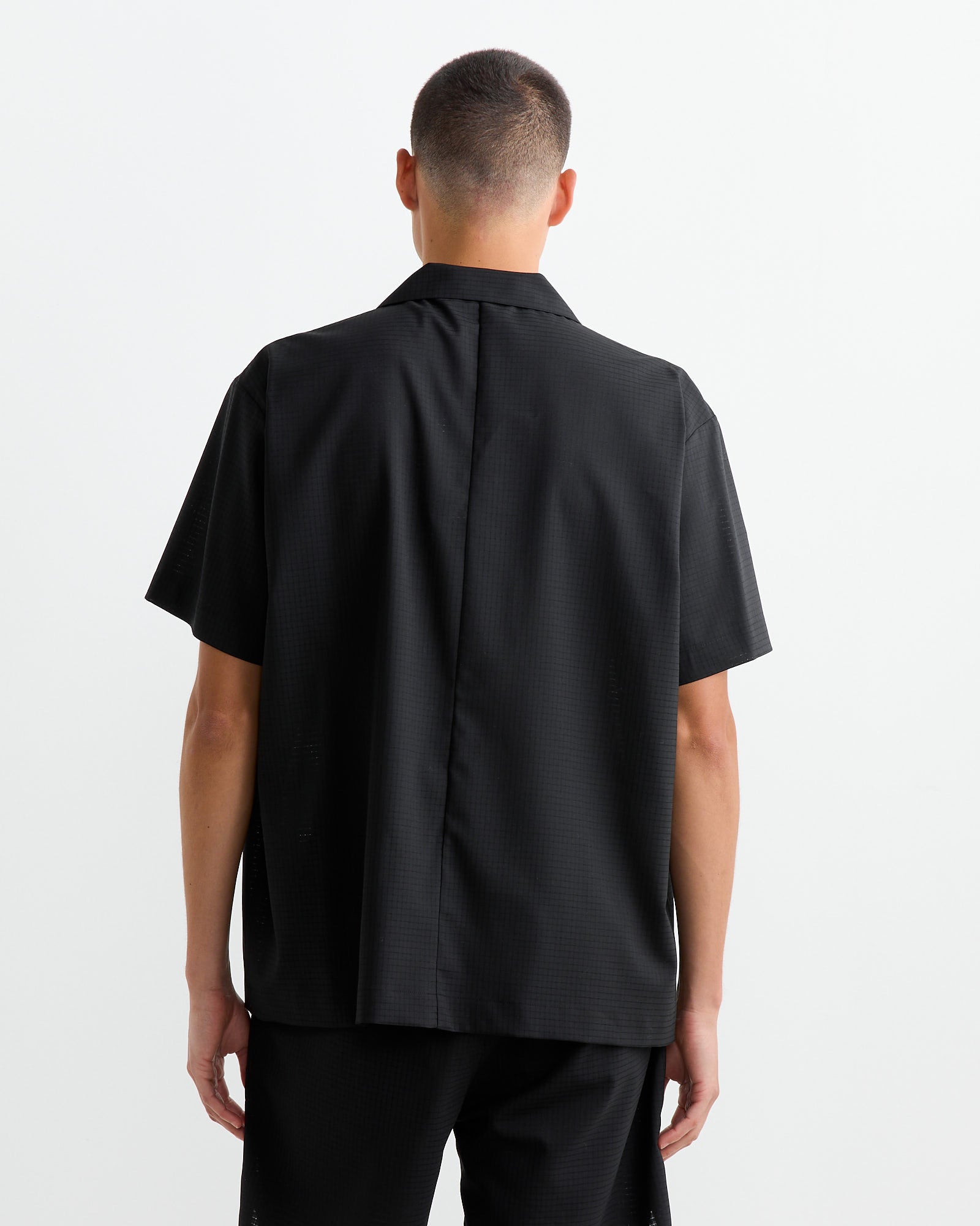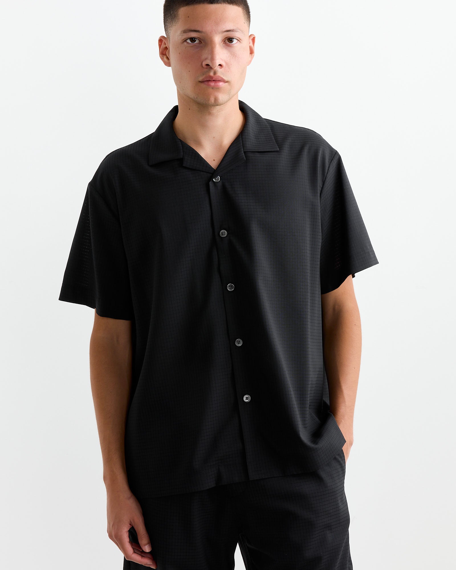 Our SMOCK Haus Shirt in Air Mesh Black features a travel-friendly Japanese fabric that's breathable, wrinkle-resistant, and water-repellent, French seam construction, Trocas shell buttons, and a breezy, oversized fit.