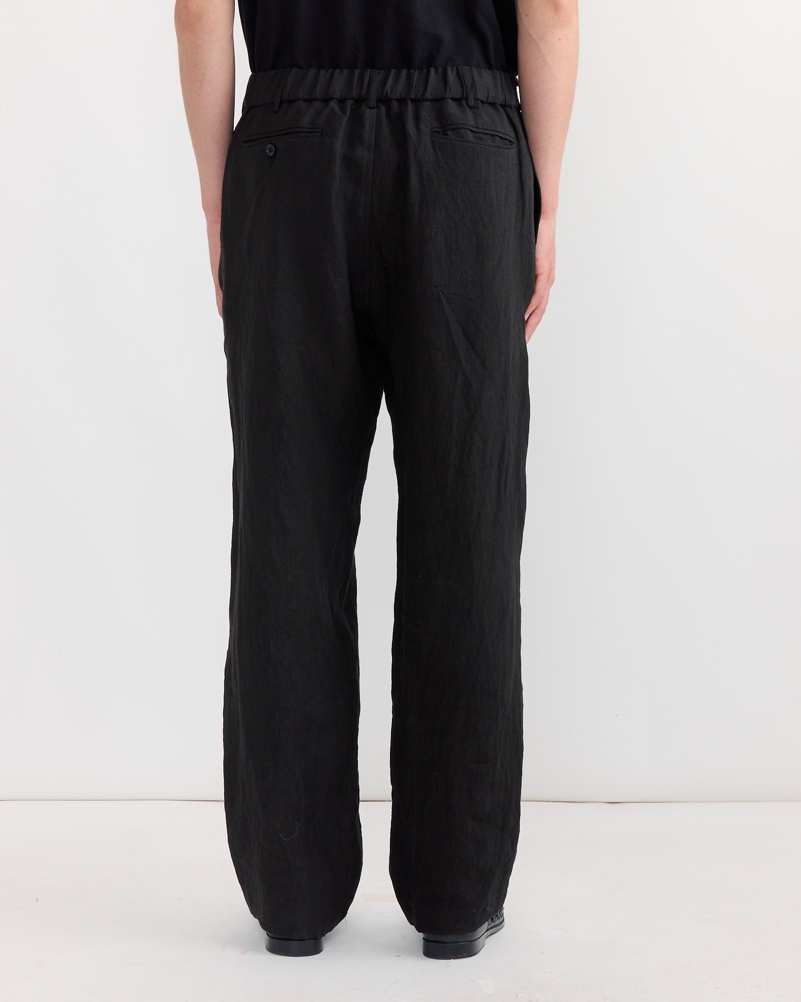 Introducing the West Coast Pant in Sun Dried Linen from SMOCK. Crafted from open-air dried Japanese linen, the fabric is breathable and develops character with wear. This version features a buttoned front closure and a clean leg with no press line, offering a more casual take on the original wool style. Finished with an elasticated back waistband, on-seam side pockets, and welted back pockets. Pair with the Blazer in Sun Dried Linen Black or the 4H Jacket in Sun Dried Linen Black.