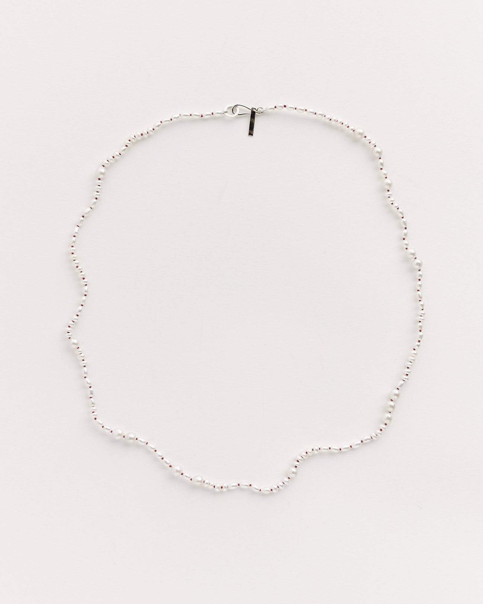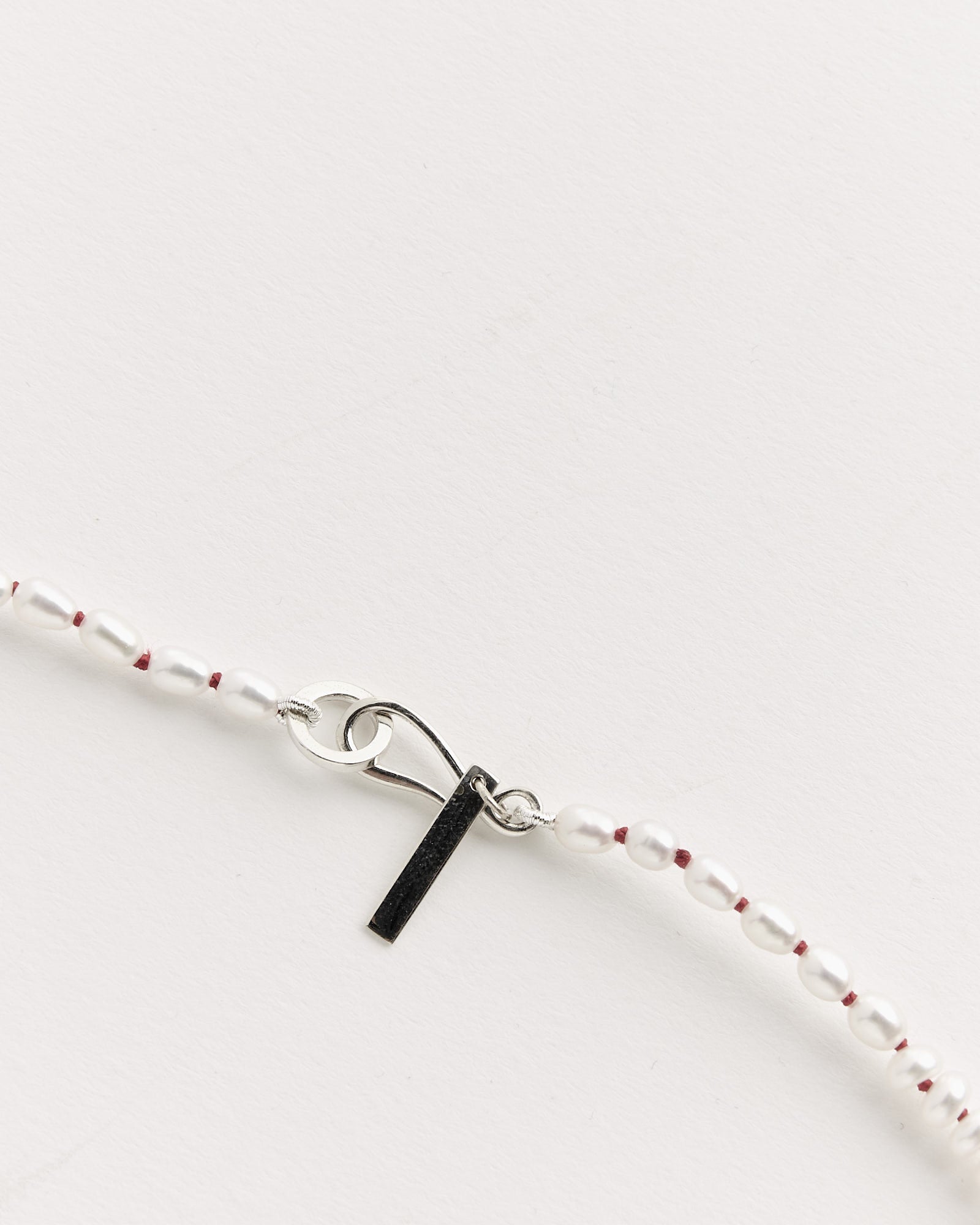 - Freshwater pearls, red silk, sterling silver