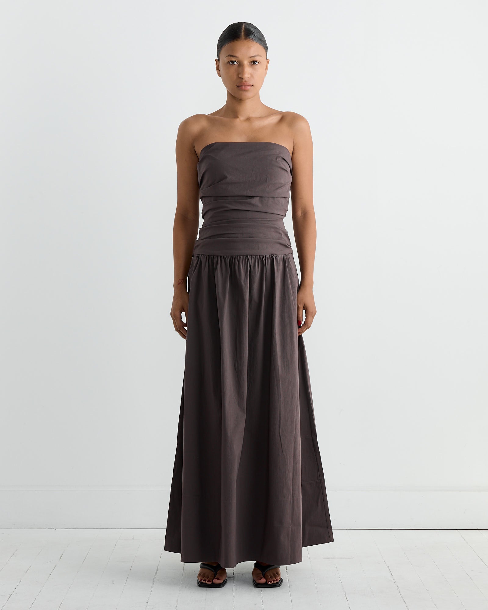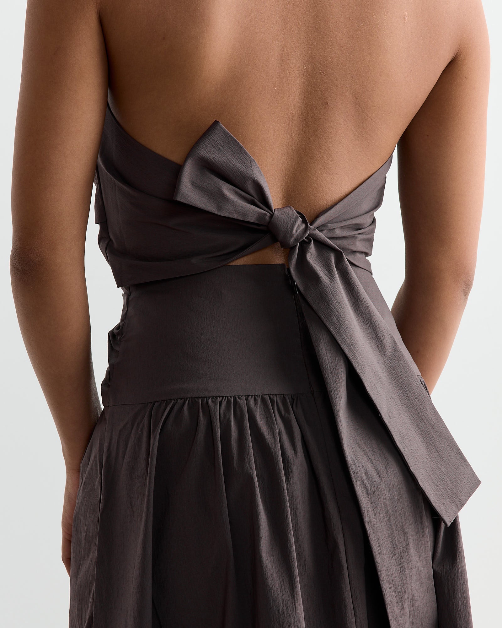 The Gathered Strapless Tie Back Dress falls to a maxi-length silhouette with an A-line skirt, combining a refined and effortless look. Side boning at the torso offers structure, while delicate gathering adds a soft touch. The back is accented by a striking tie detail, making it perfect for high-rotation wear.