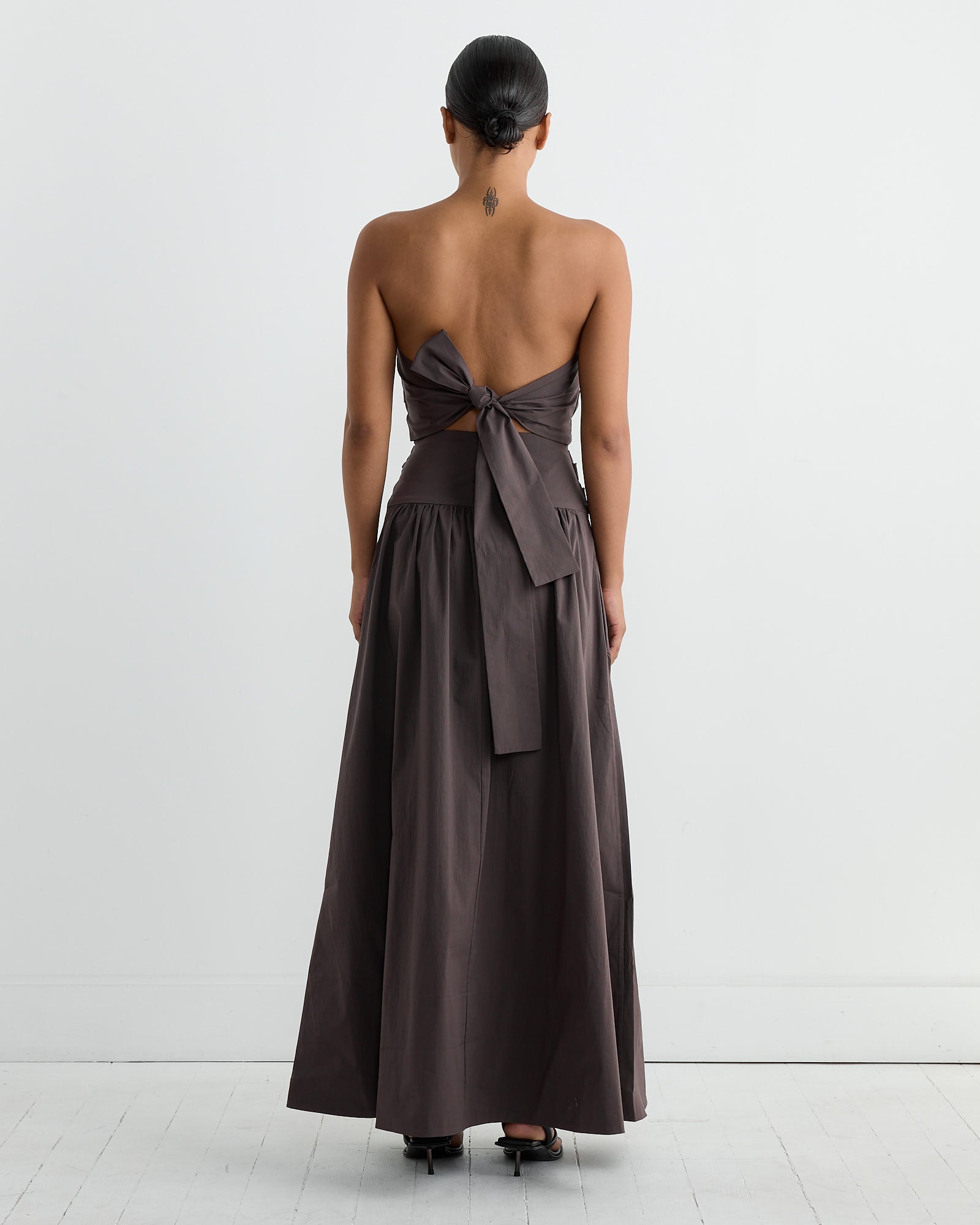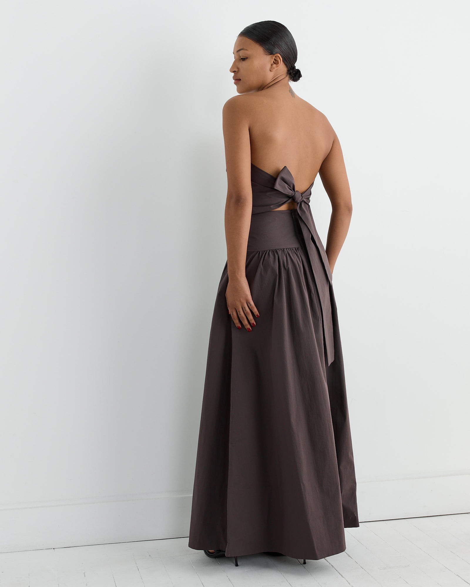 Gathered Strapless Tie Back Dress in Chocolate Plum