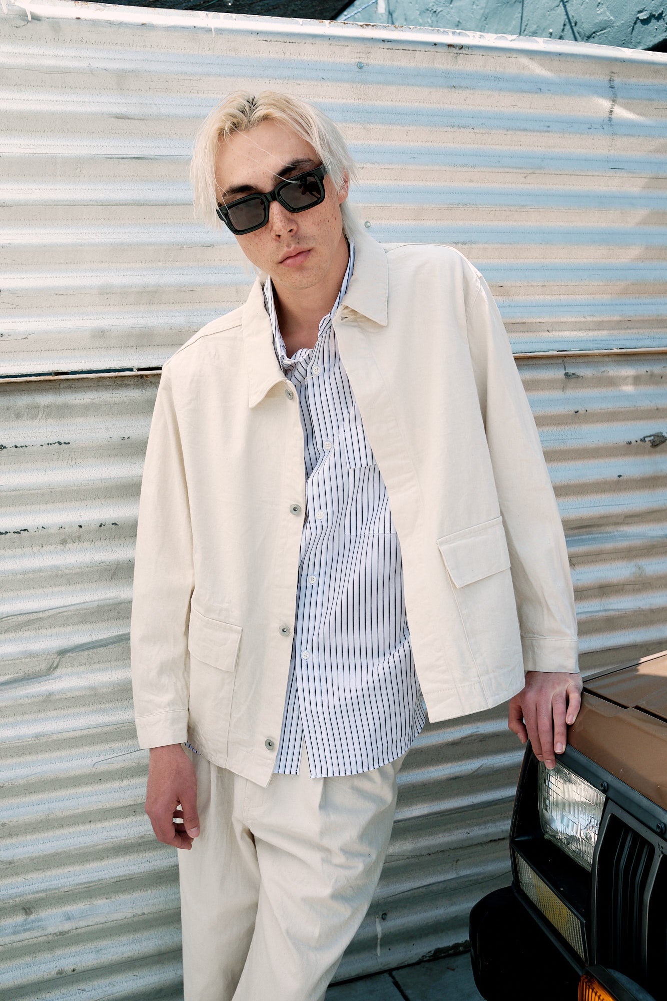 The Still By Hand Oversized Shirt in White Stripe is a boxy, roomy shirt crafted from the brand’s original yarn-dyed cotton-ramie fabric produced in Nishiwaki, Hyogo. Designed with a thin, flat, and crisp texture, it features an oversized silhouette and a single chest pocket with a flap for a clean, structured look.