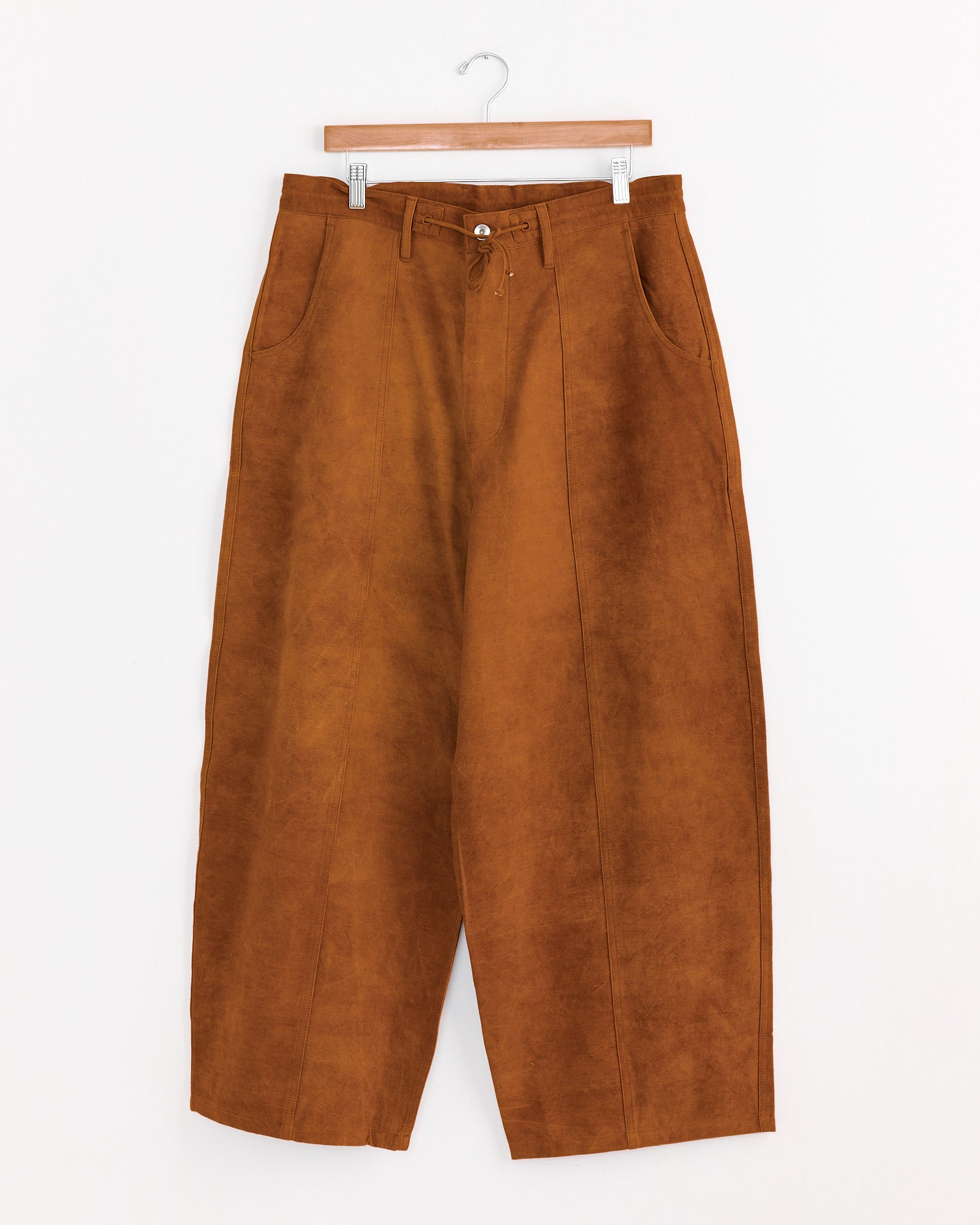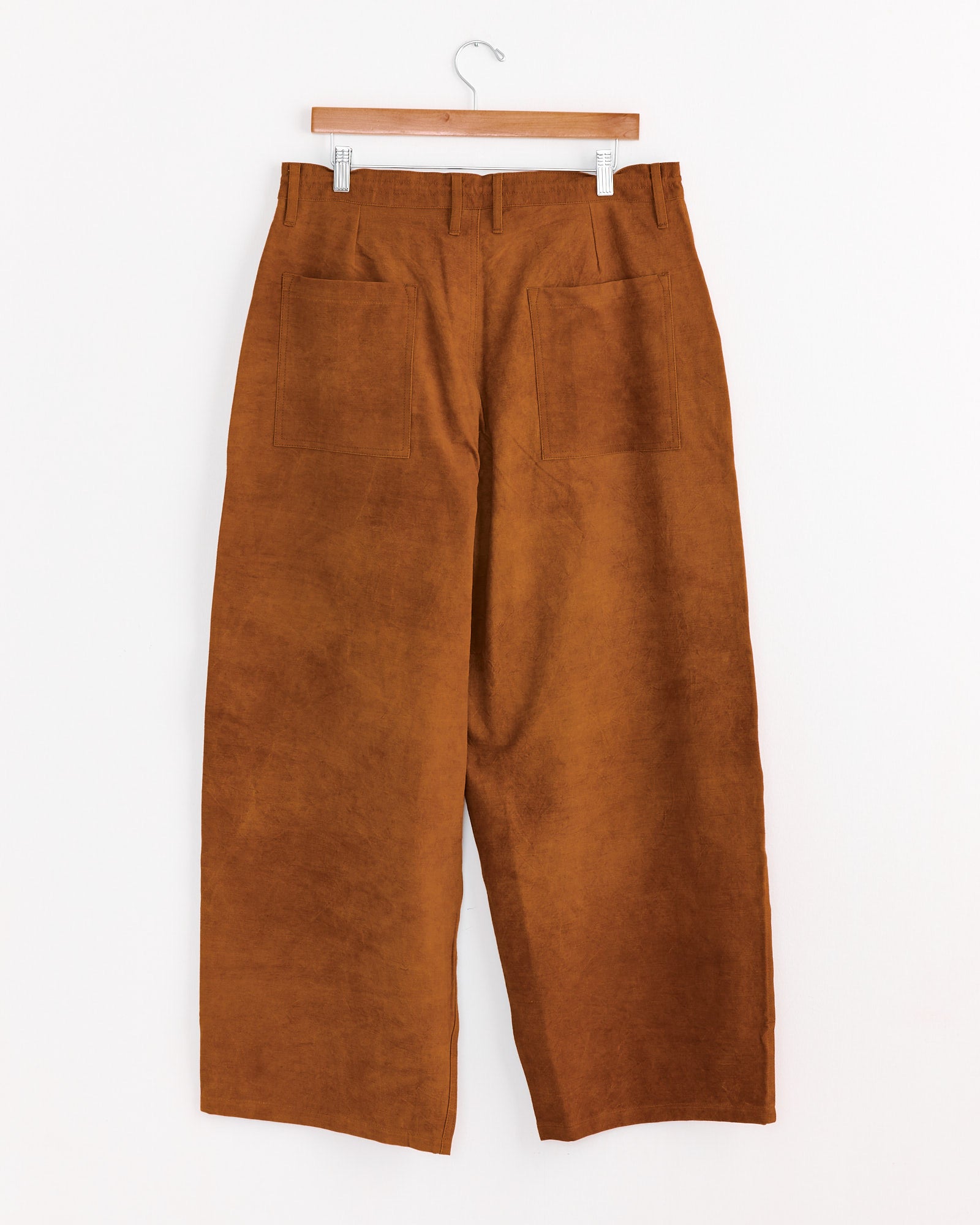 The Story mfg Document Pant in Bark Brown features a wide-leg, high-waisted suede design with a relaxed fit, front pockets, button and zipper closure, and belt loops, shown on a wooden hanger against a white background.