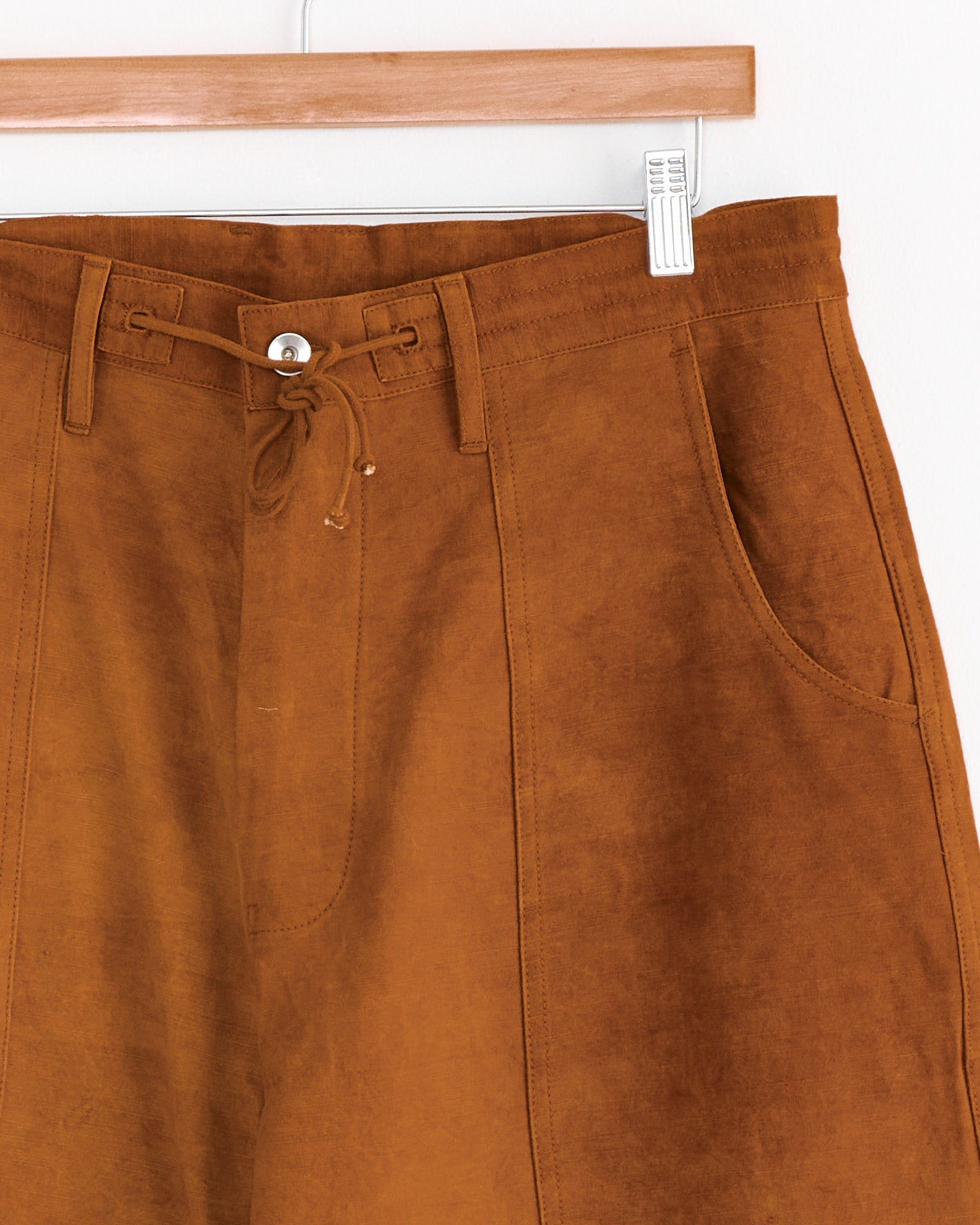 Close-up of the Story mfg Document Pant in Bark Brown—high-waisted, textured slub organic cotton pants with a relaxed fit, drawstring waist, button and zipper closure, plus side pockets—hanging on a wooden hanger.