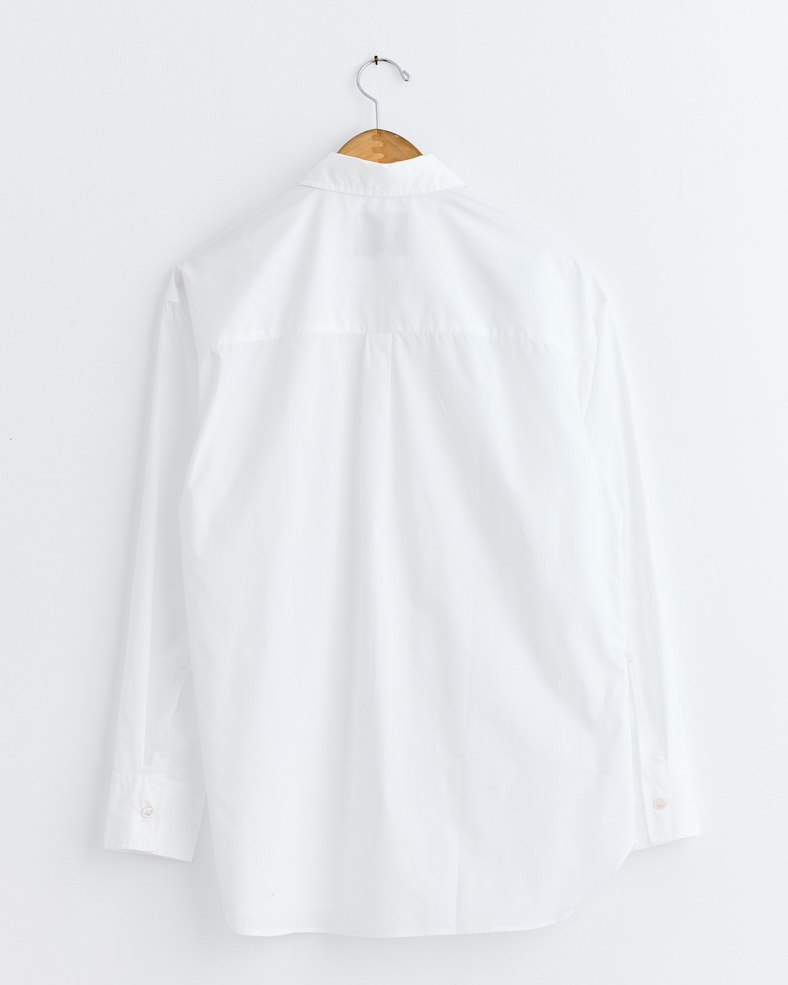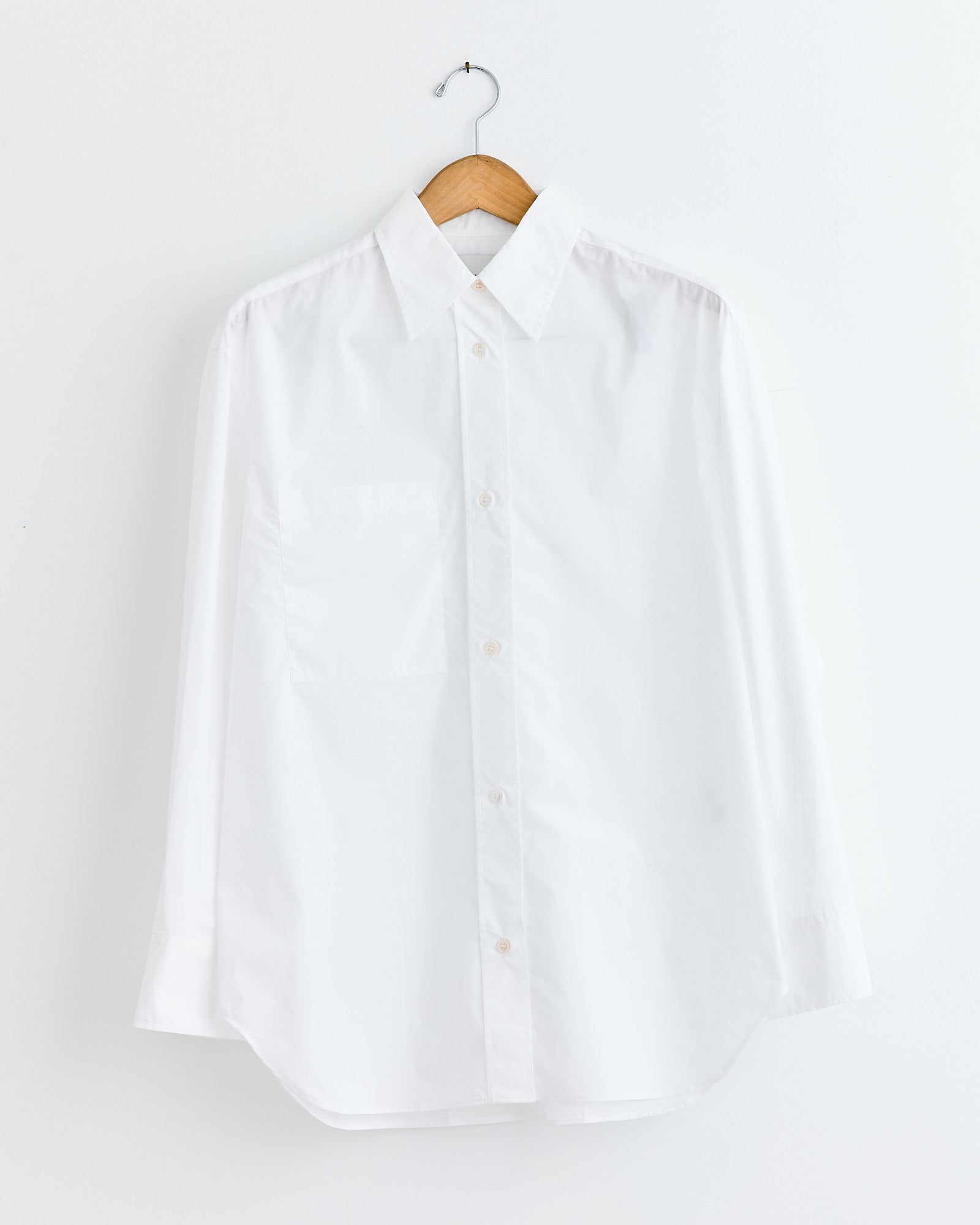 The Studio Nicholson Leto Shirt in Optic White reworks a classic silhouette with an intentionally oversized, fluid shape. Cut from Italian-milled cotton poplin, it features a double-emerised finish for an ultra-soft touch. Finished with a chest patch pocket, curved hem, and buttoned cuffs, it delivers a refined yet easy everyday option.