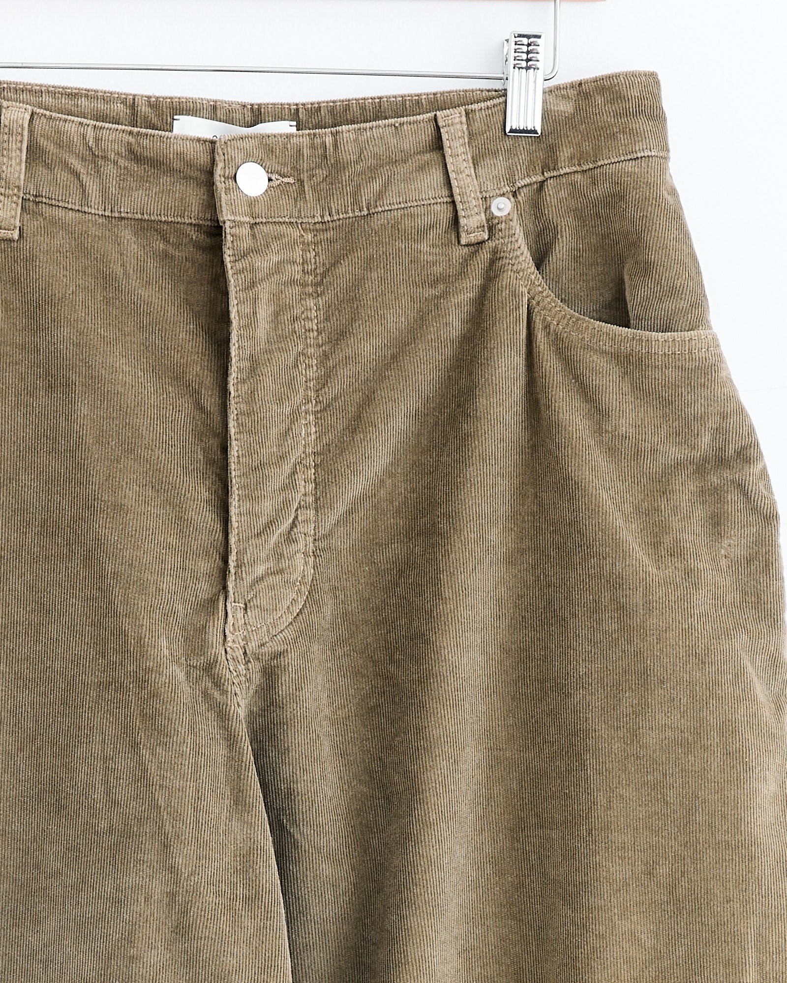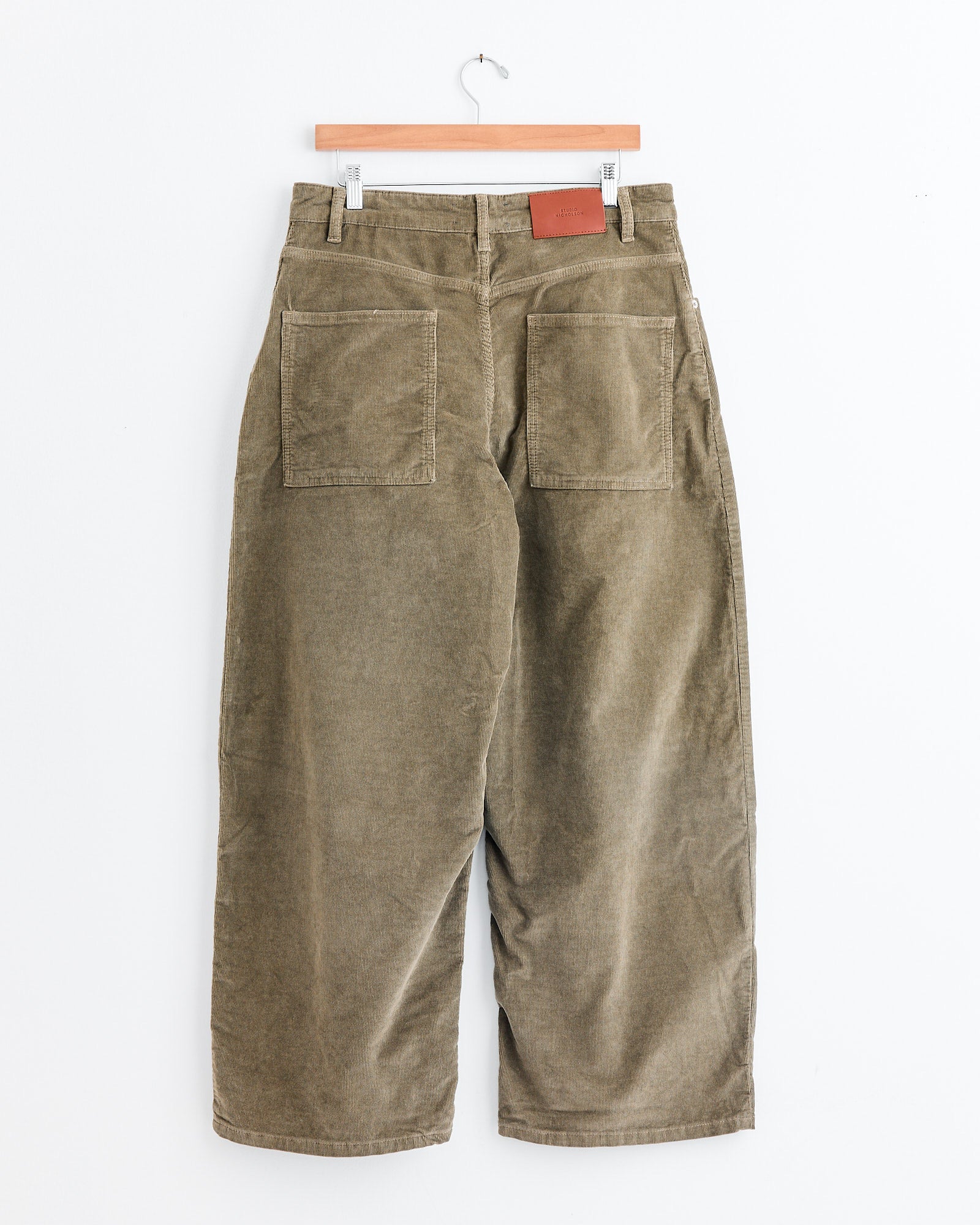 The Studio Nicholson Paolo Pant in Lichen features an exaggerated balloon-shaped leg that offers volume without sacrificing versatility. Cut from Italian-milled fine cotton corduroy, the fabric is garment-washed for a rich tone and soft vintage finish. This five-pocket style blends tailored structure with a casual ease, finished with metal rivets and a zip fly.