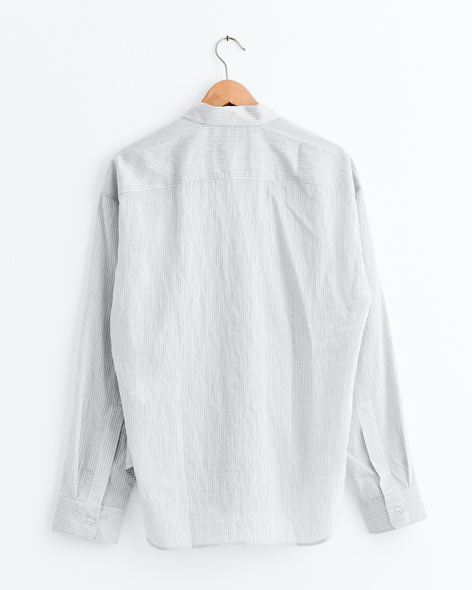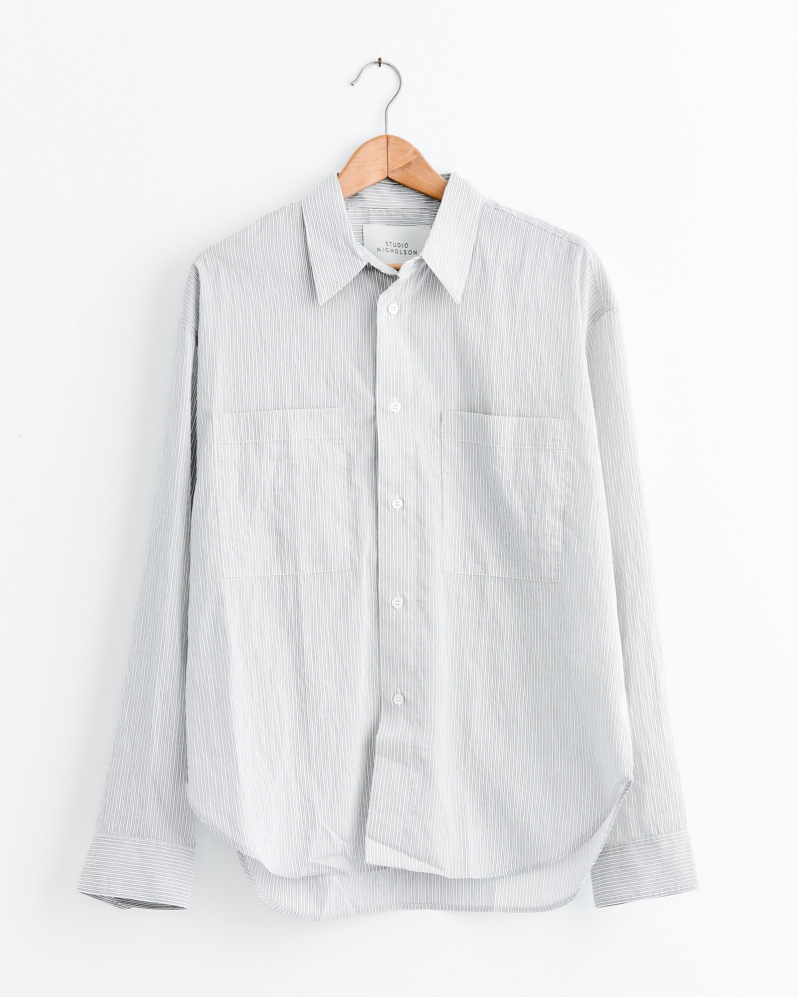 The Studio Nicholson Salin Shirt in Chalk Stripe is cut from a lightweight fabric with a washed, crinkled texture and features an exclusive vintage-style stripe. Designed with an oversized fit, it drapes softly over the body and includes two chest patch pockets and a curved hem. A versatile staple with understated character.