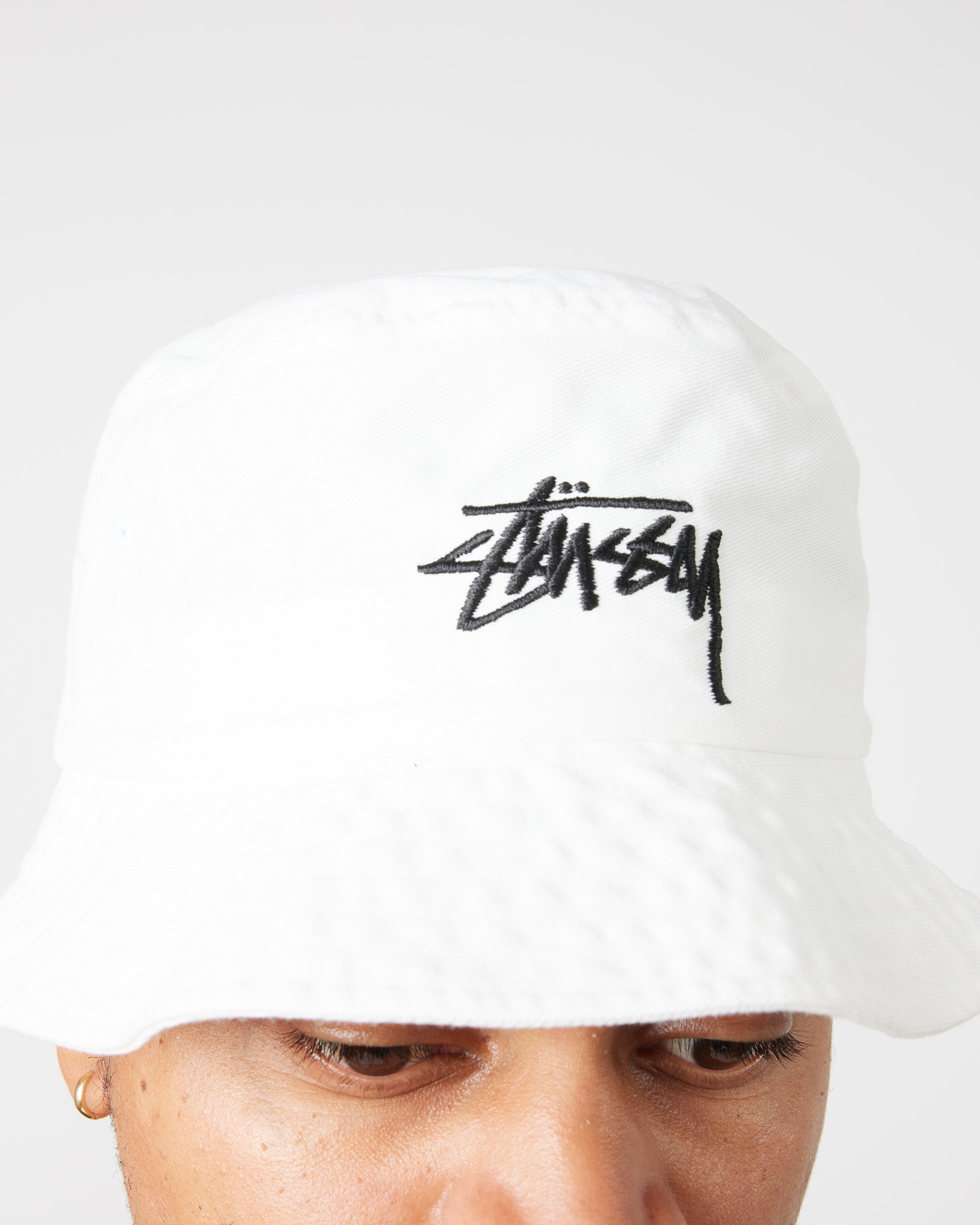 A close-up of the Stussy Big Stock Bucket Hat, a classic mid-depth fit hat with the bold white embroidered stock logo in graffiti style.