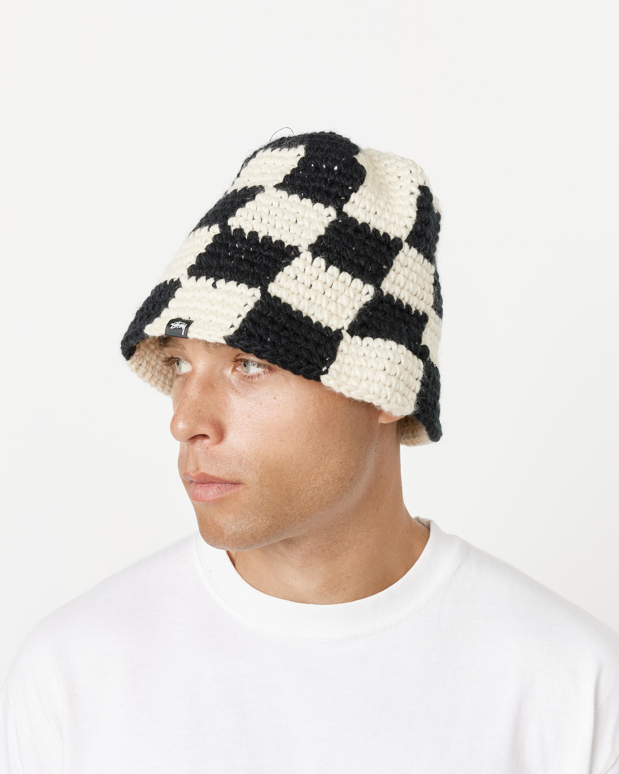 Made from a soft acrylic yarn knit for a chunky look, the Checker Knit Bucket Hat features a two-tone checkerboard pattern across an unstructured crown, and a Stüssy label sewn onto the edge of the brim.
