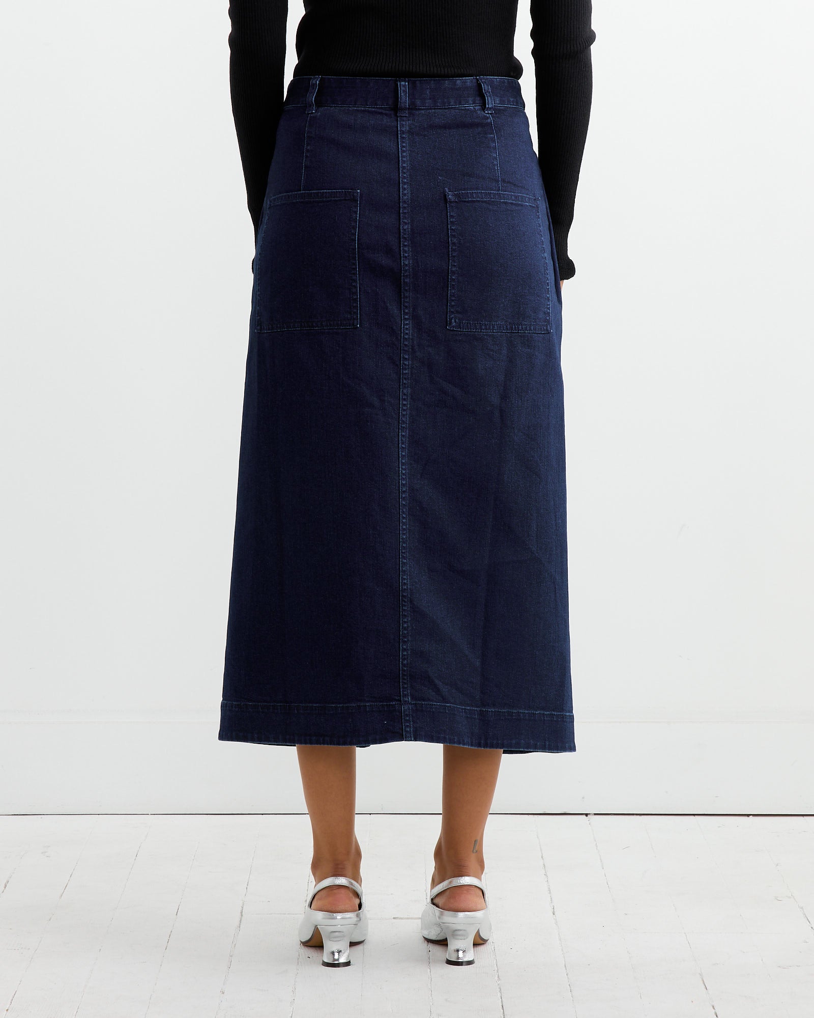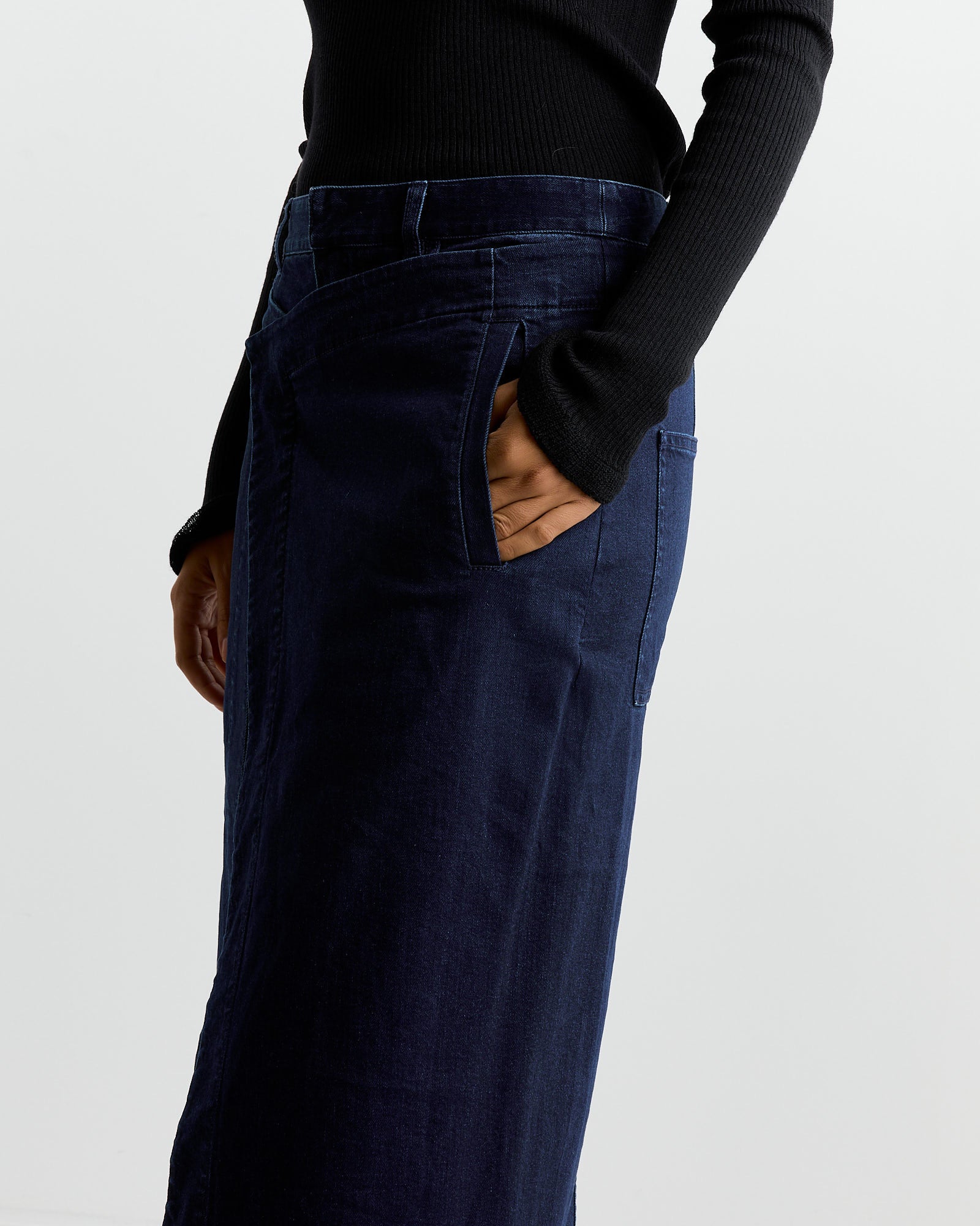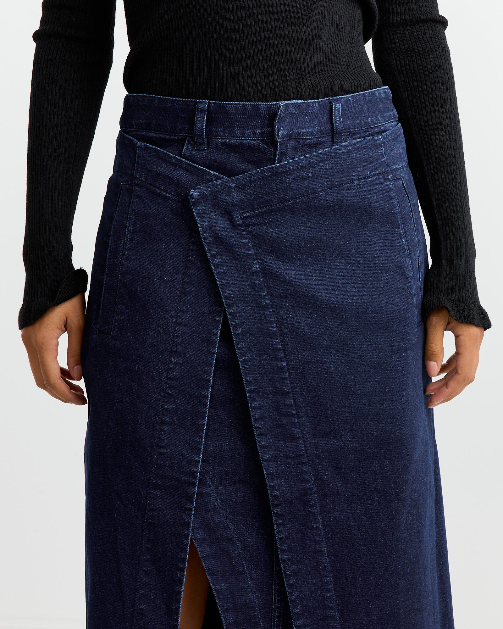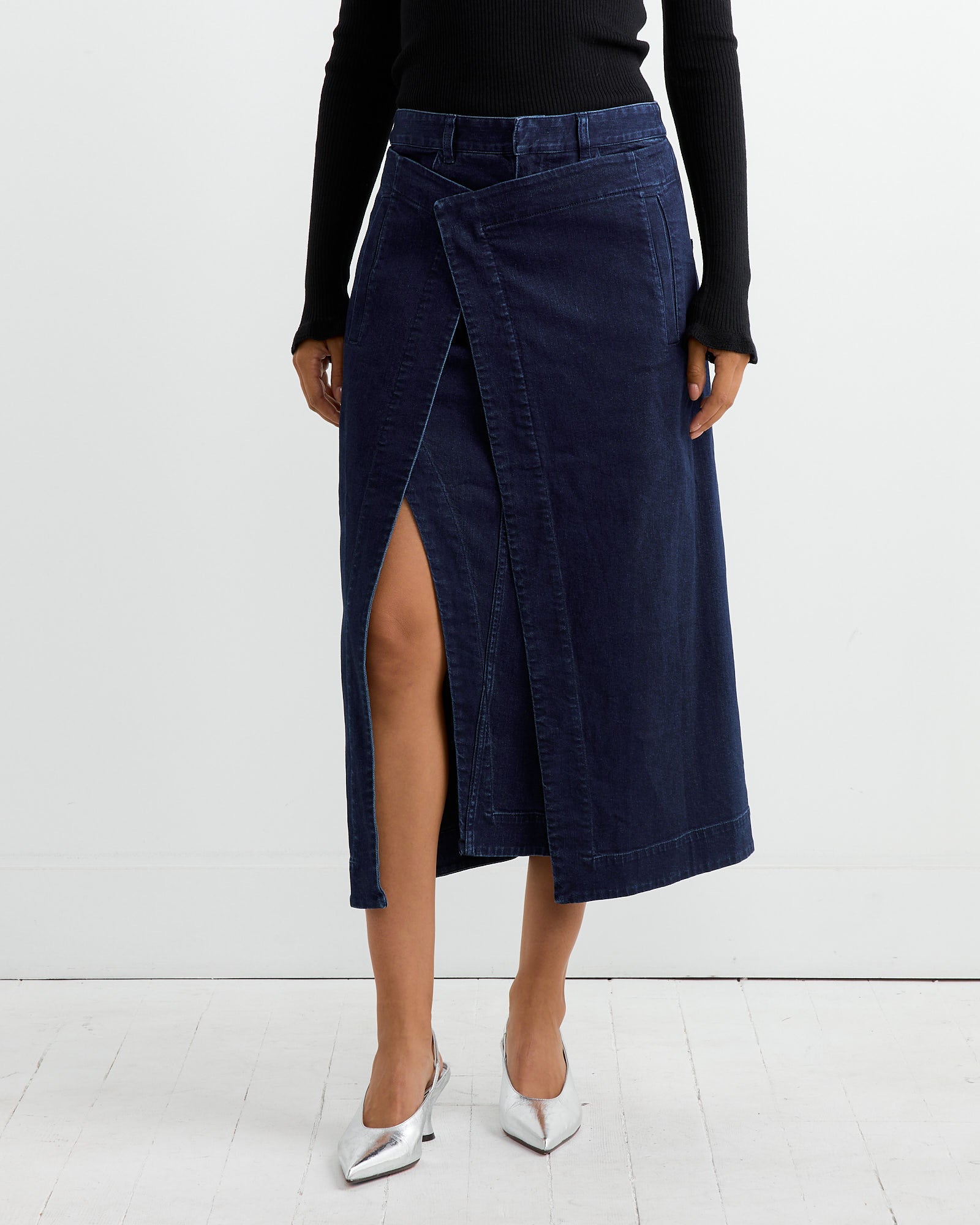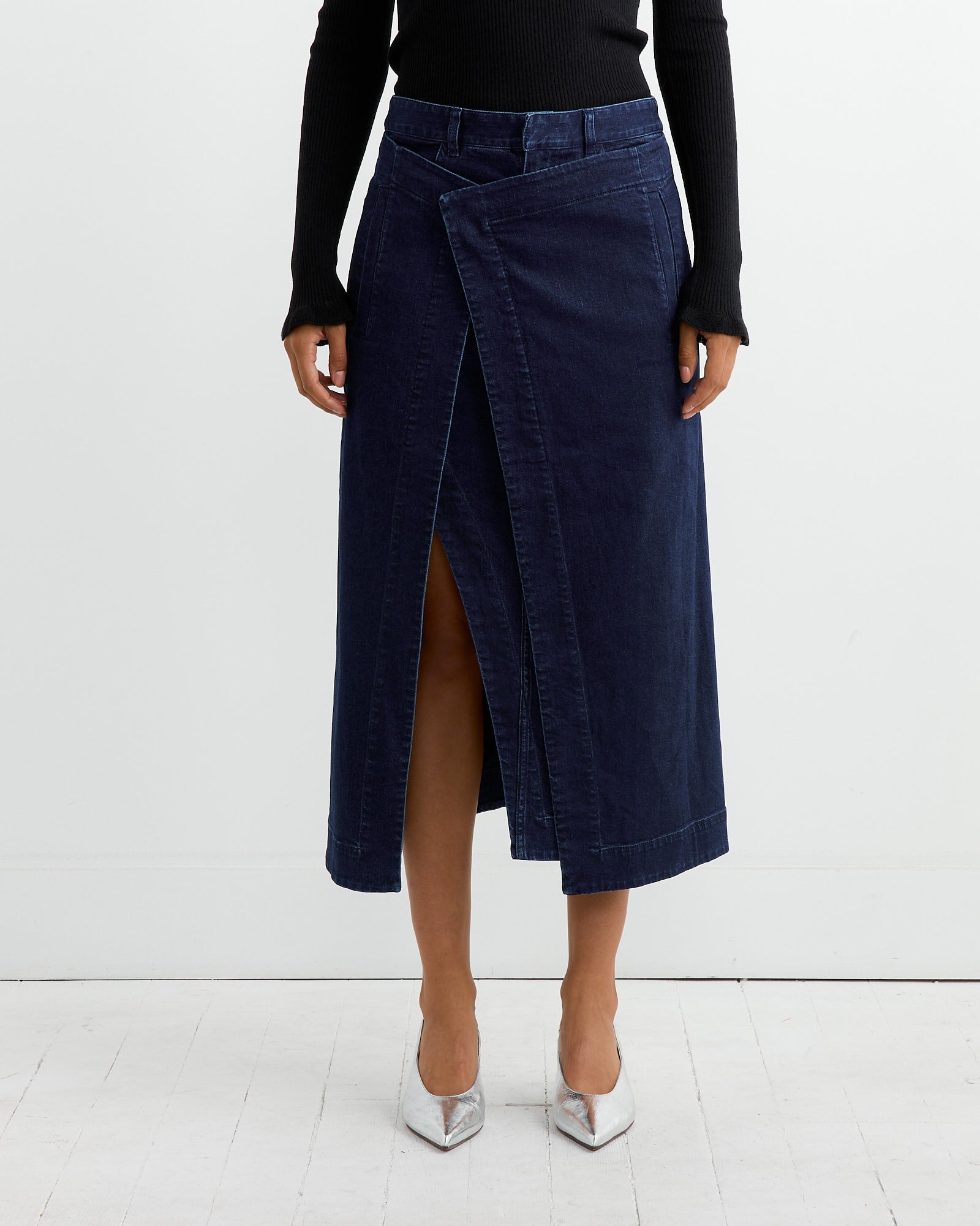 The Tibi Classic Indigo Denim Wrap Skirt is a versatile, modern piece crafted from Japanese denim. The wrap silhouette is detailed with additional paneling and a clasp closure, adding a layered effect to the design. This skirt strikes a perfect balance between femininity and functionality, making it a great choice for both casual and styled-up looks.