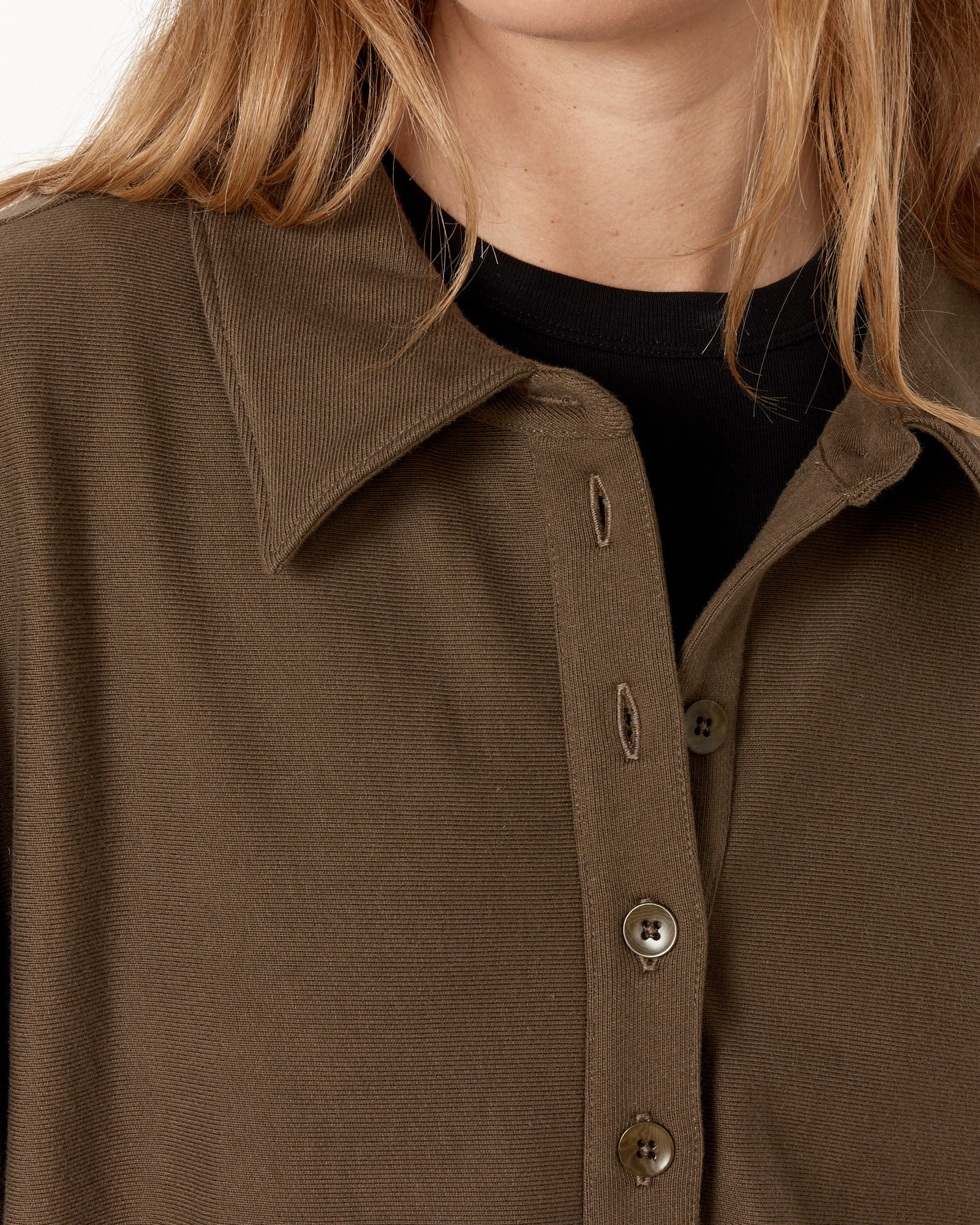 Layna is 5'7" with a 26" waist, 35" chest and 37" hip. Layna is wearing the Program Polo Sweatshirt in size M.