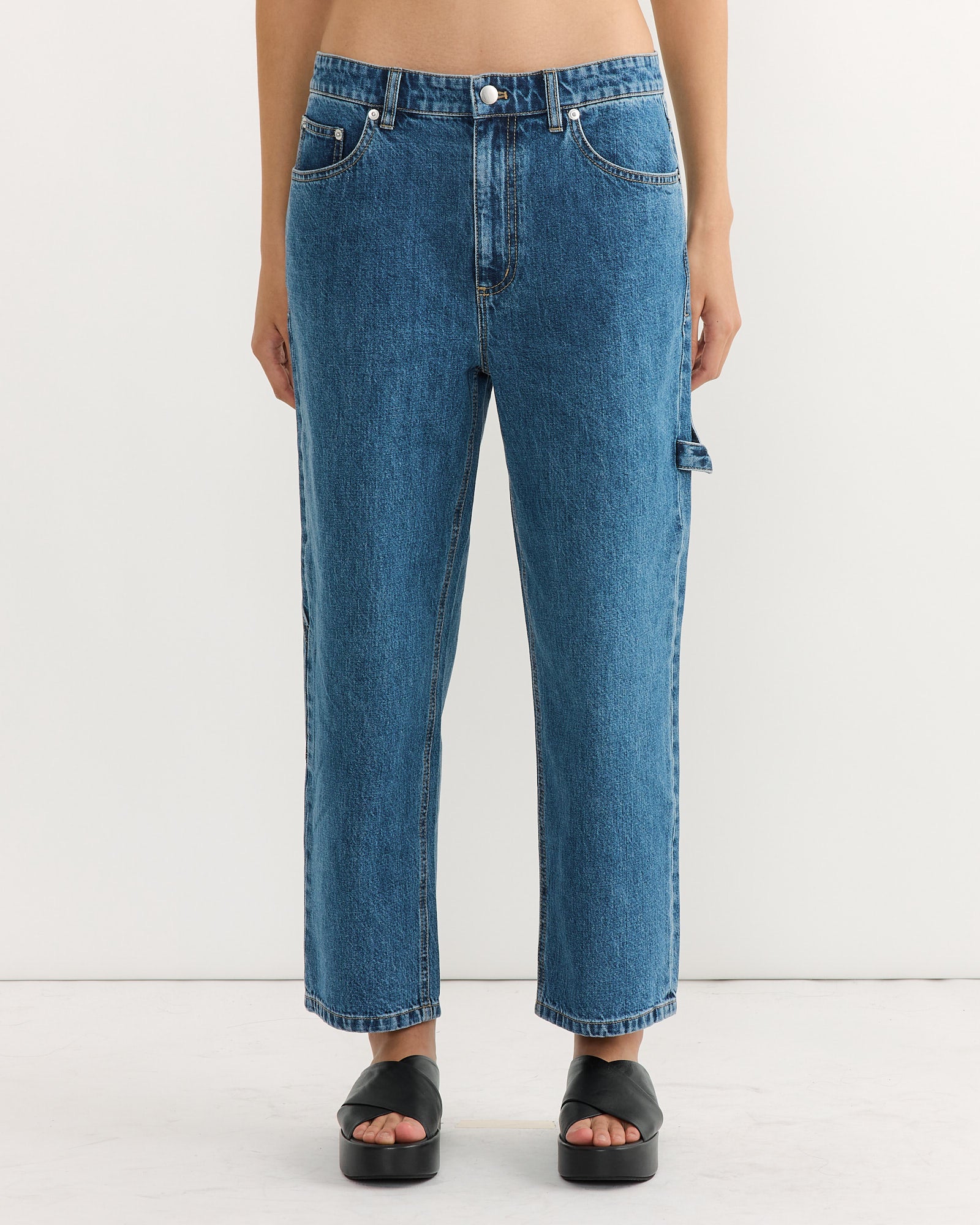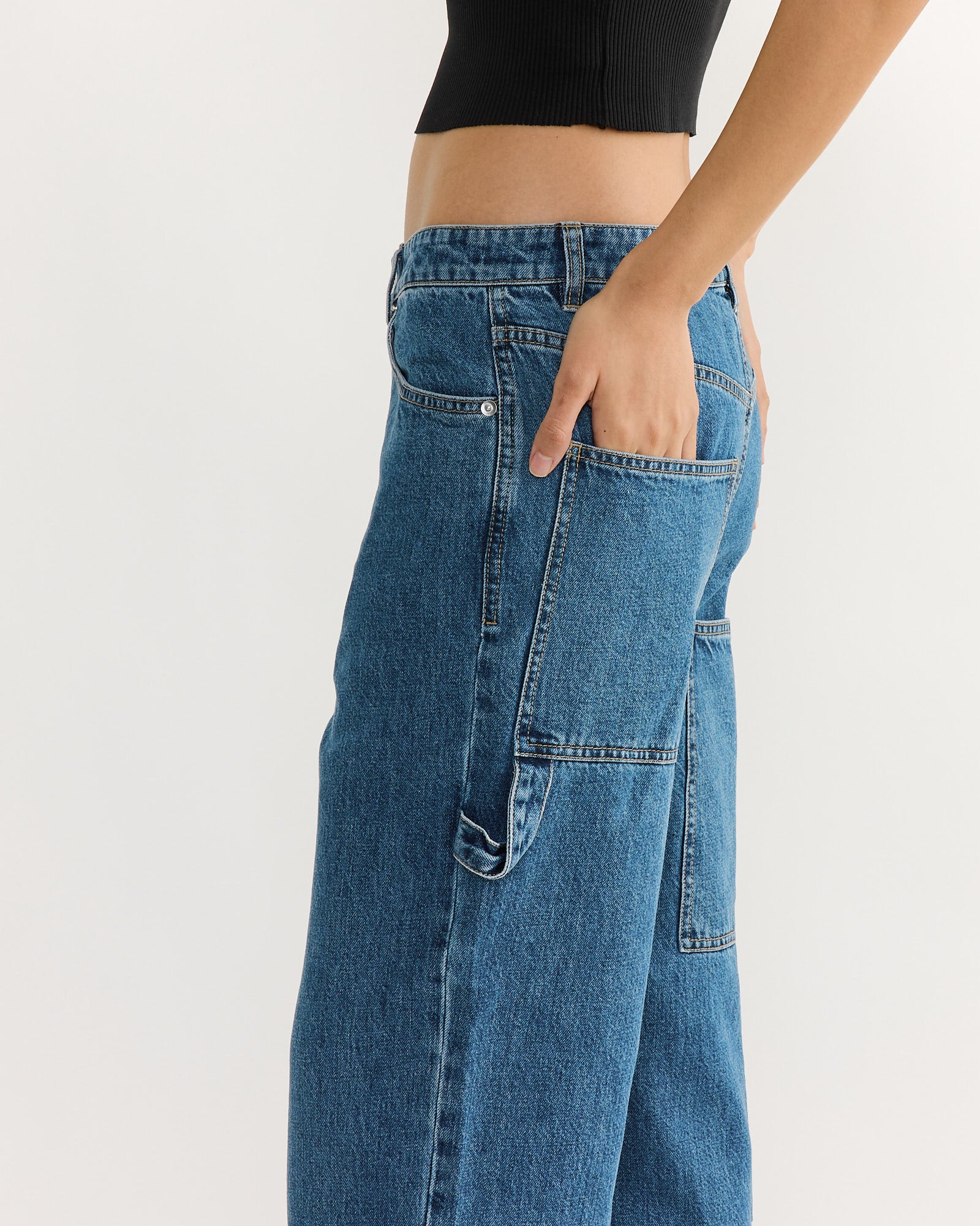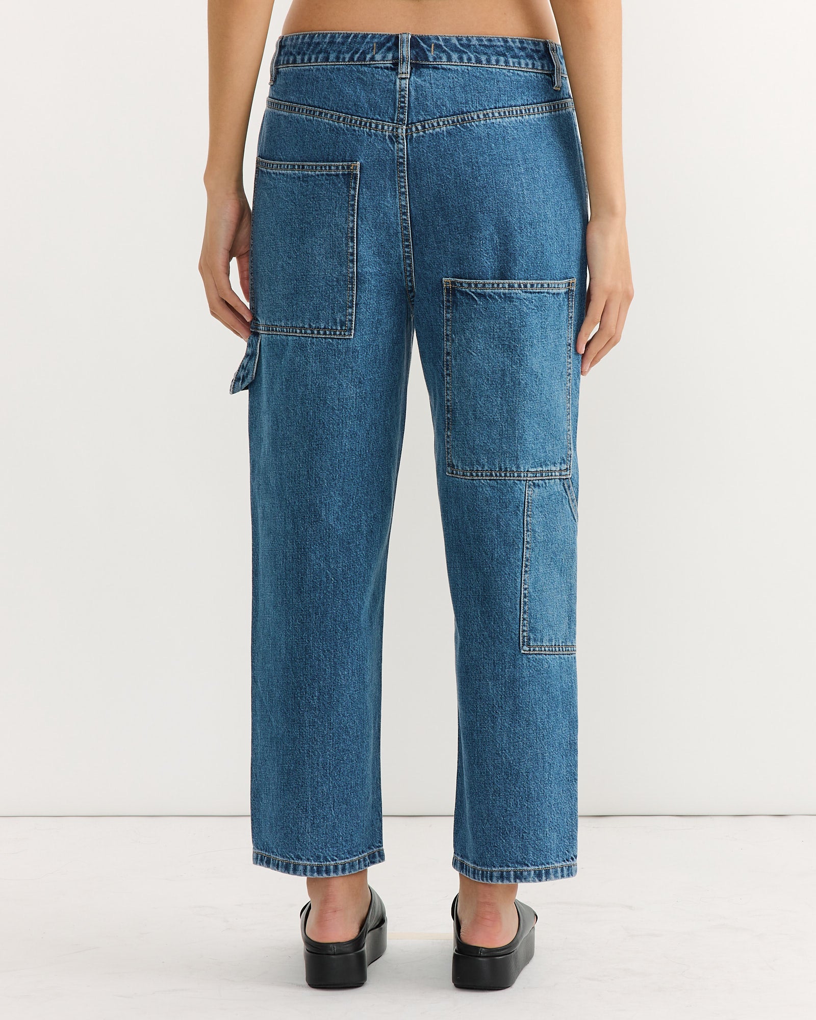 The Tibi Spring Denim Cropped Slouchy Cargo Jean in Classic Blue features a relaxed fit with a cropped length. Designed with cargo-style pockets and a mid-rise waist, these jeans offer a casual yet refined silhouette.