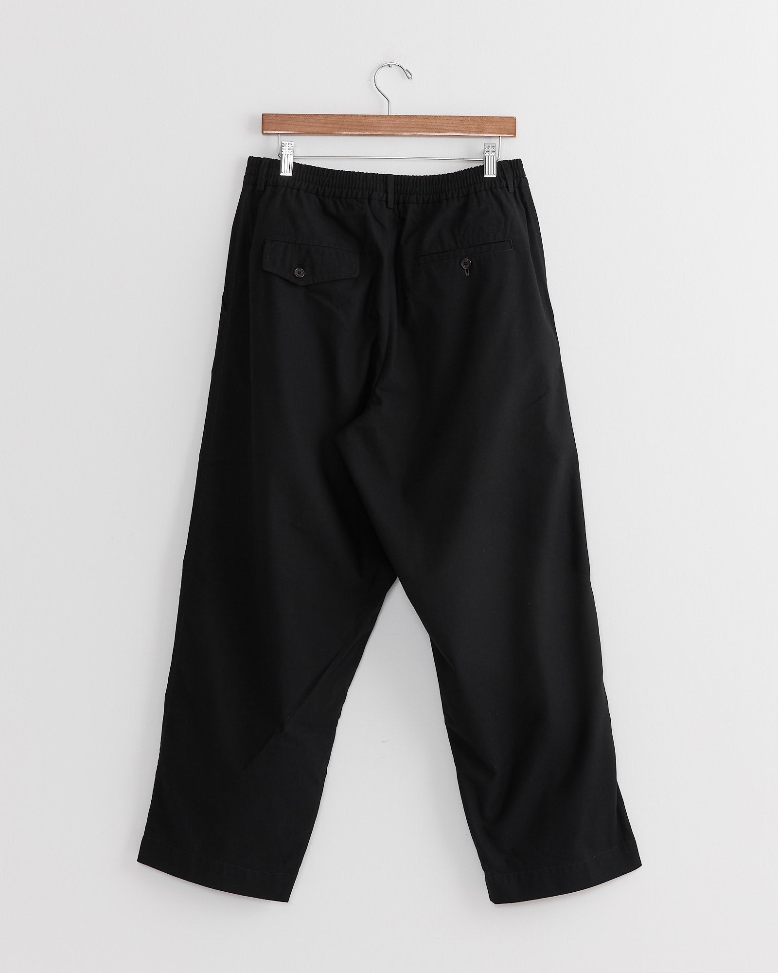 The Universal Works Oxford Pant in Black is a wide-leg trouser with a single pleat front and a slight taper. Designed with an elasticated drawstring waist, button fly, and multiple pockets for functionality.