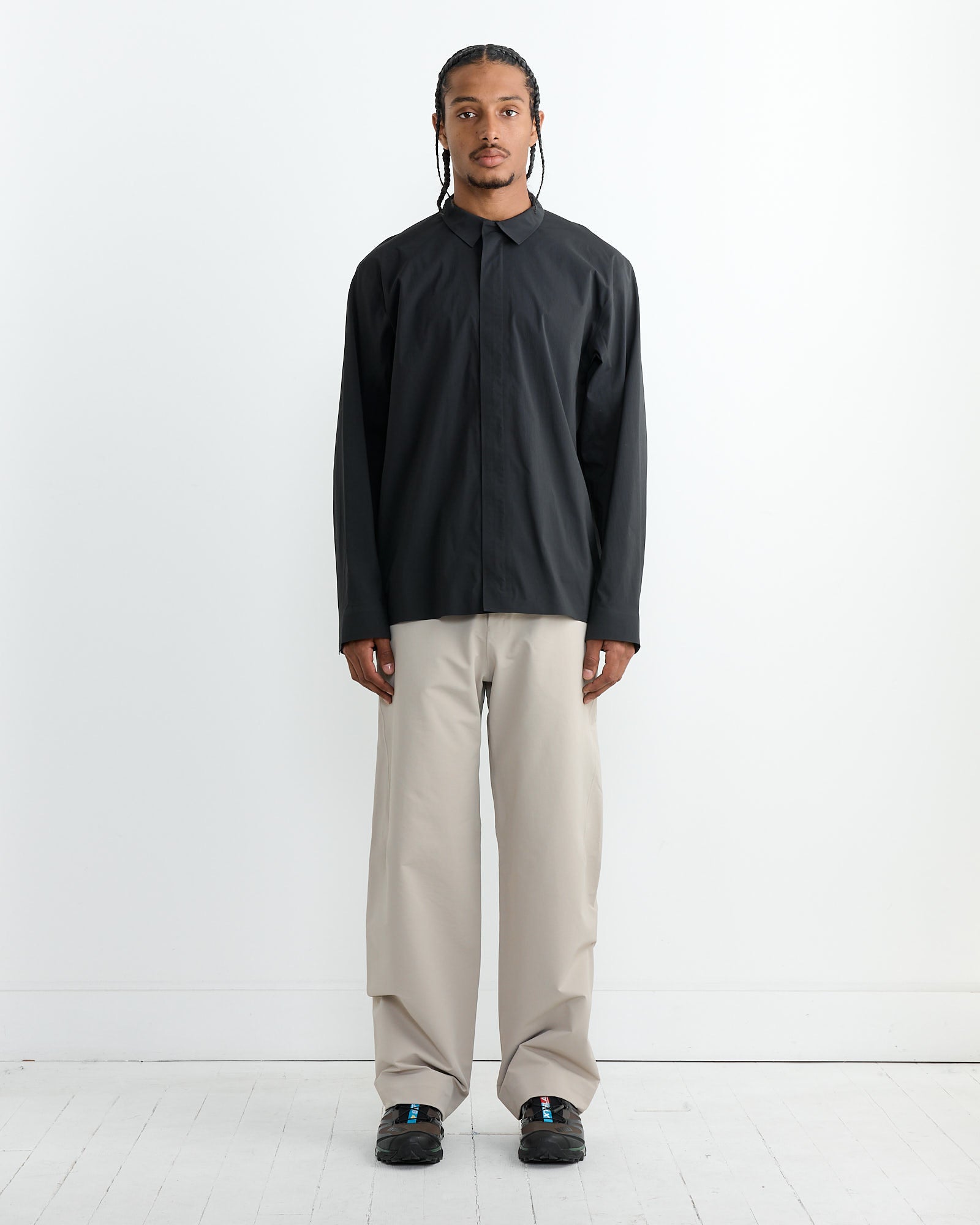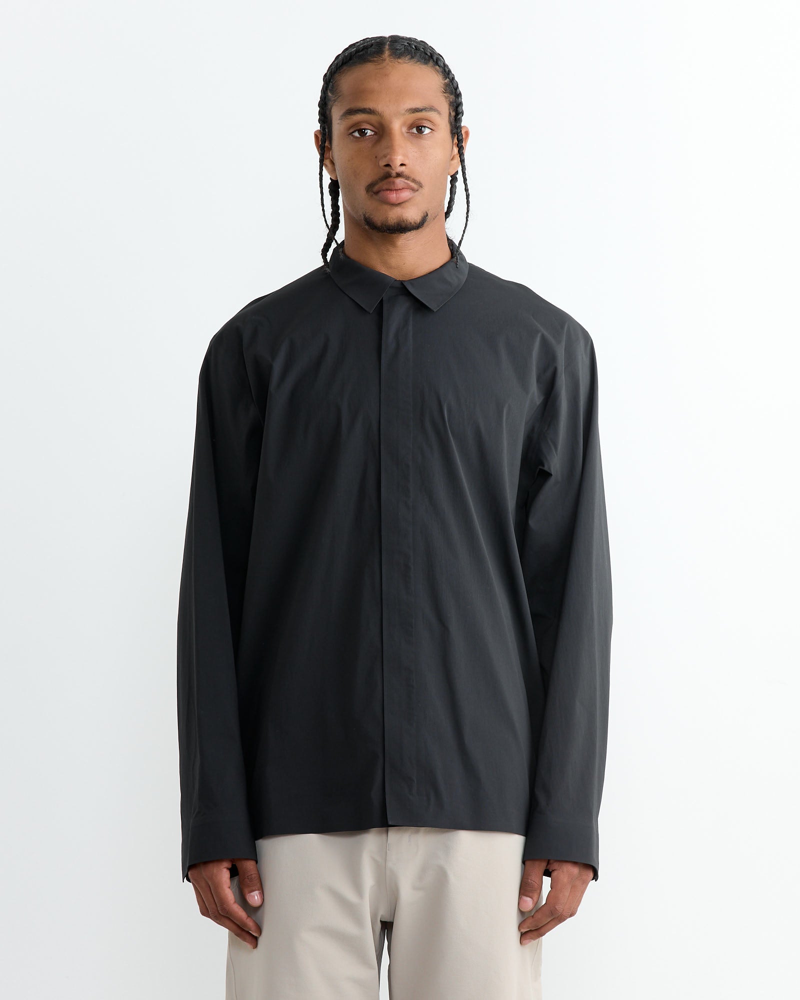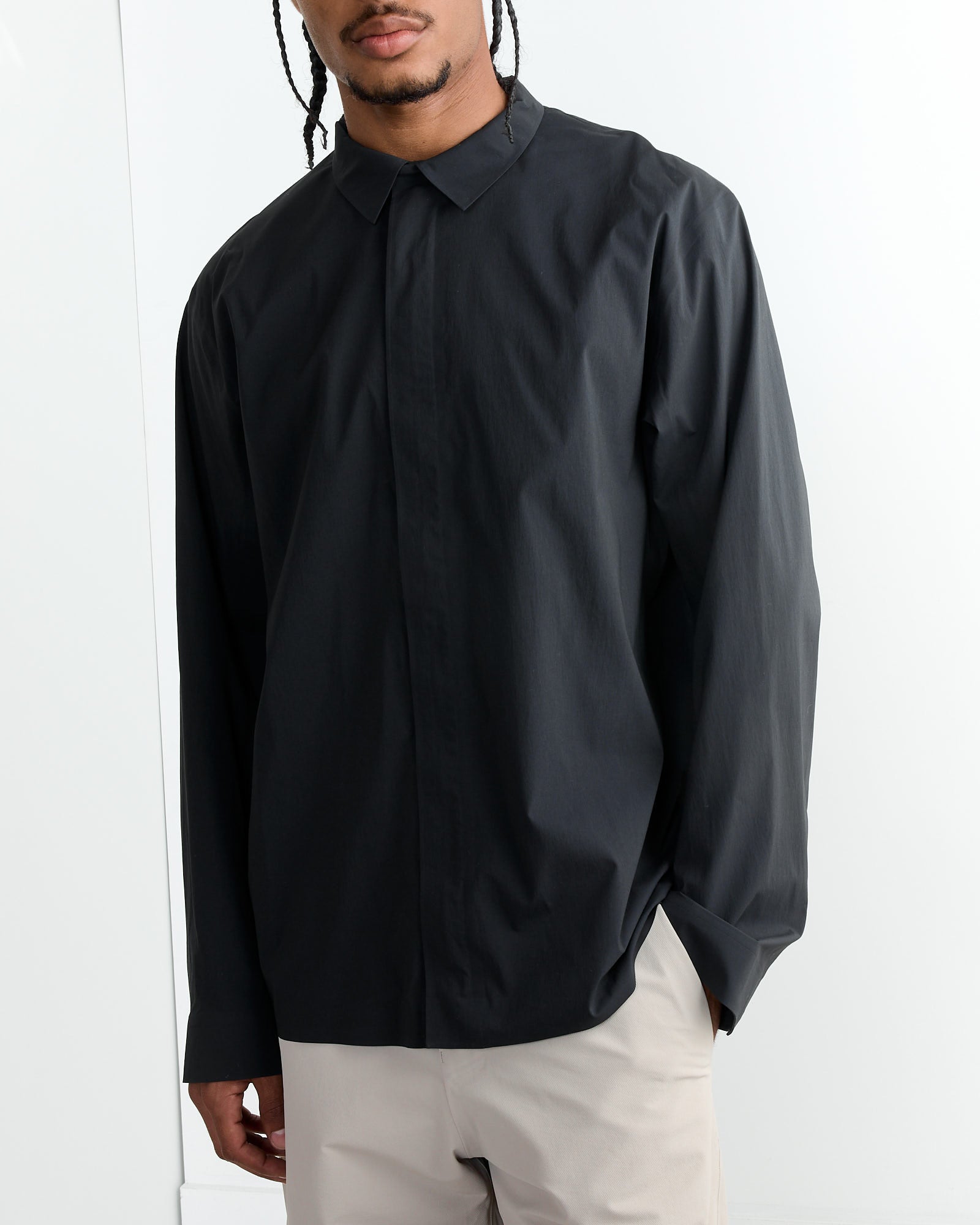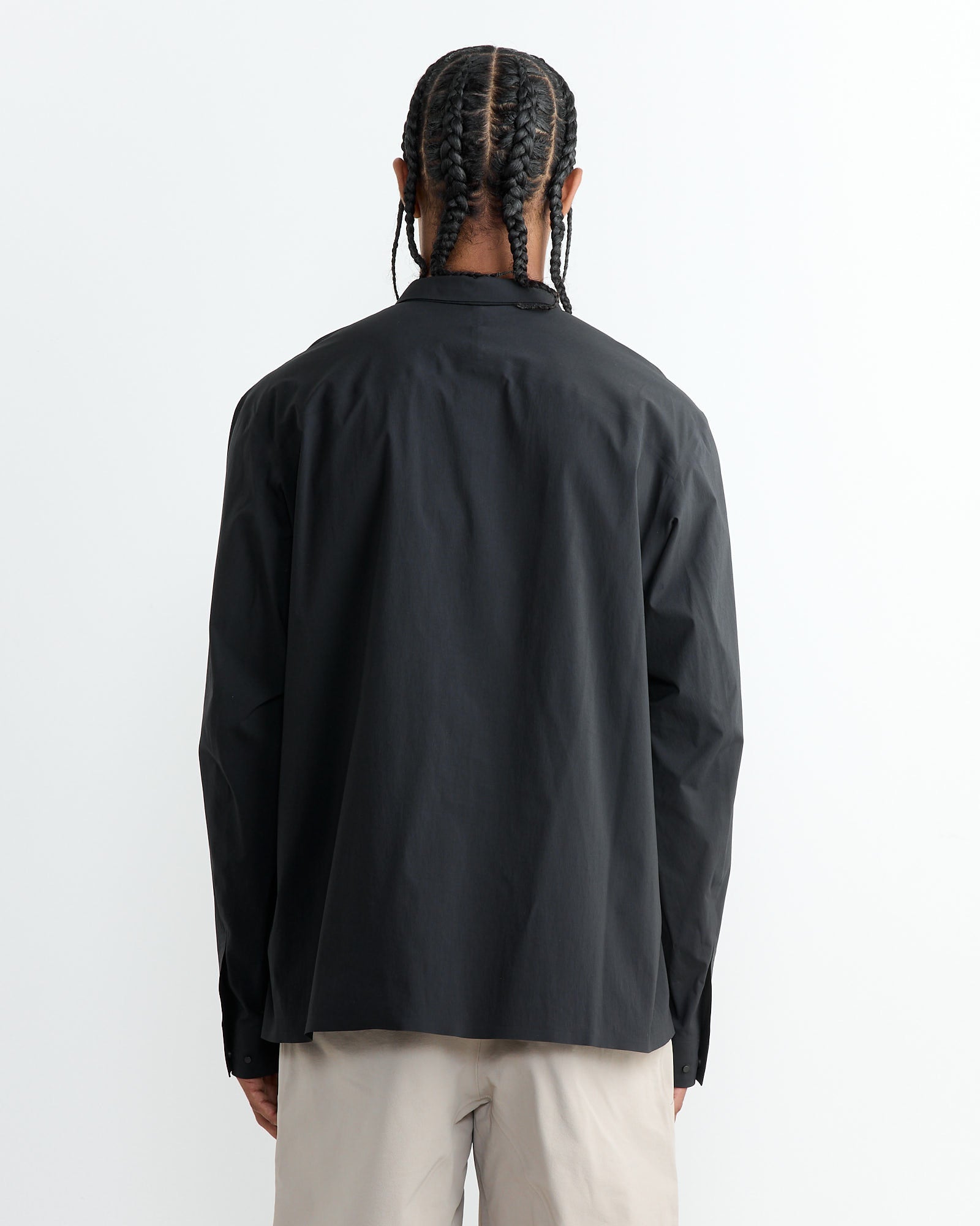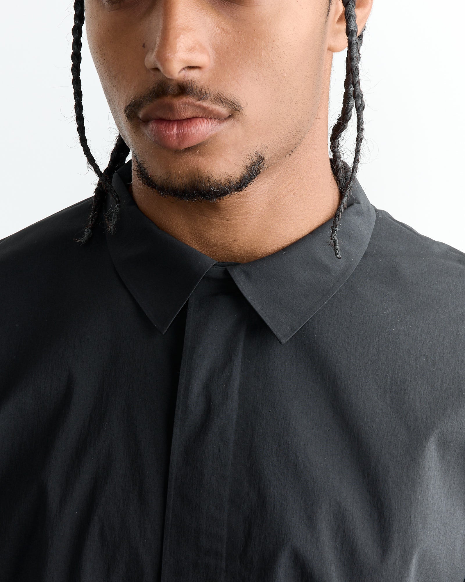 The Veilance Metry Shirt in Black is a versatile piece designed for both professional and casual settings. It features a streamlined regular fit and is crafted from breathable stretch nylon for comfort and ease of movement. The shirt utilizes ultrasonic welding for a seamless, minimalist finish, and includes hidden front snaps to enhance its sleek aesthetic.